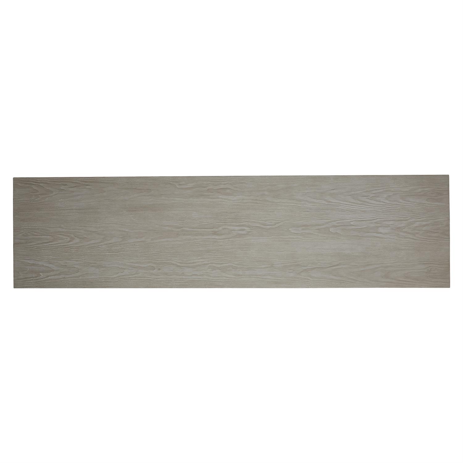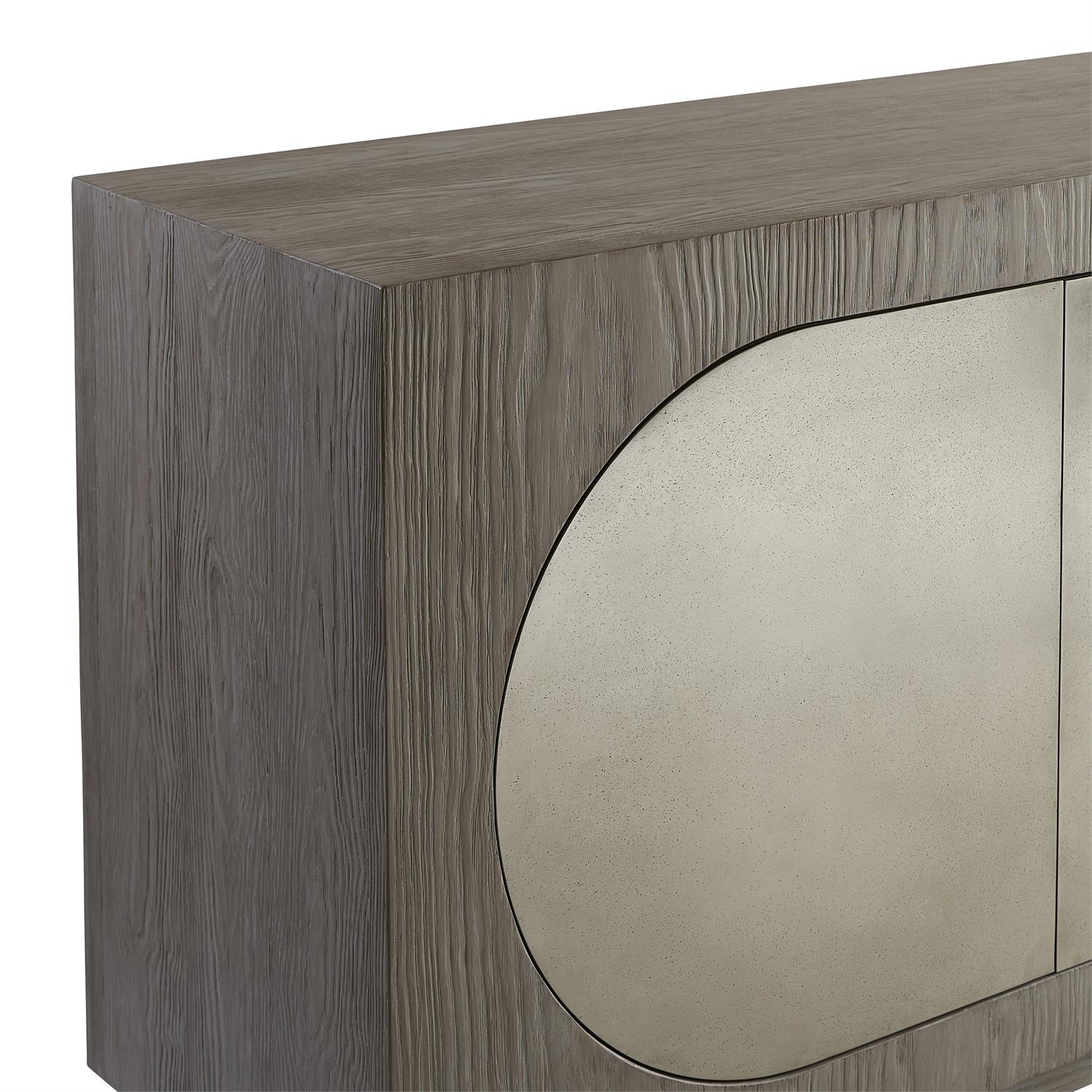 Buffet fabriqué à partir de bois massif et de placages de pin jaune en finition Gris, avec des façades de portes et de tiroirs en aluminium moulé en finition Argent.