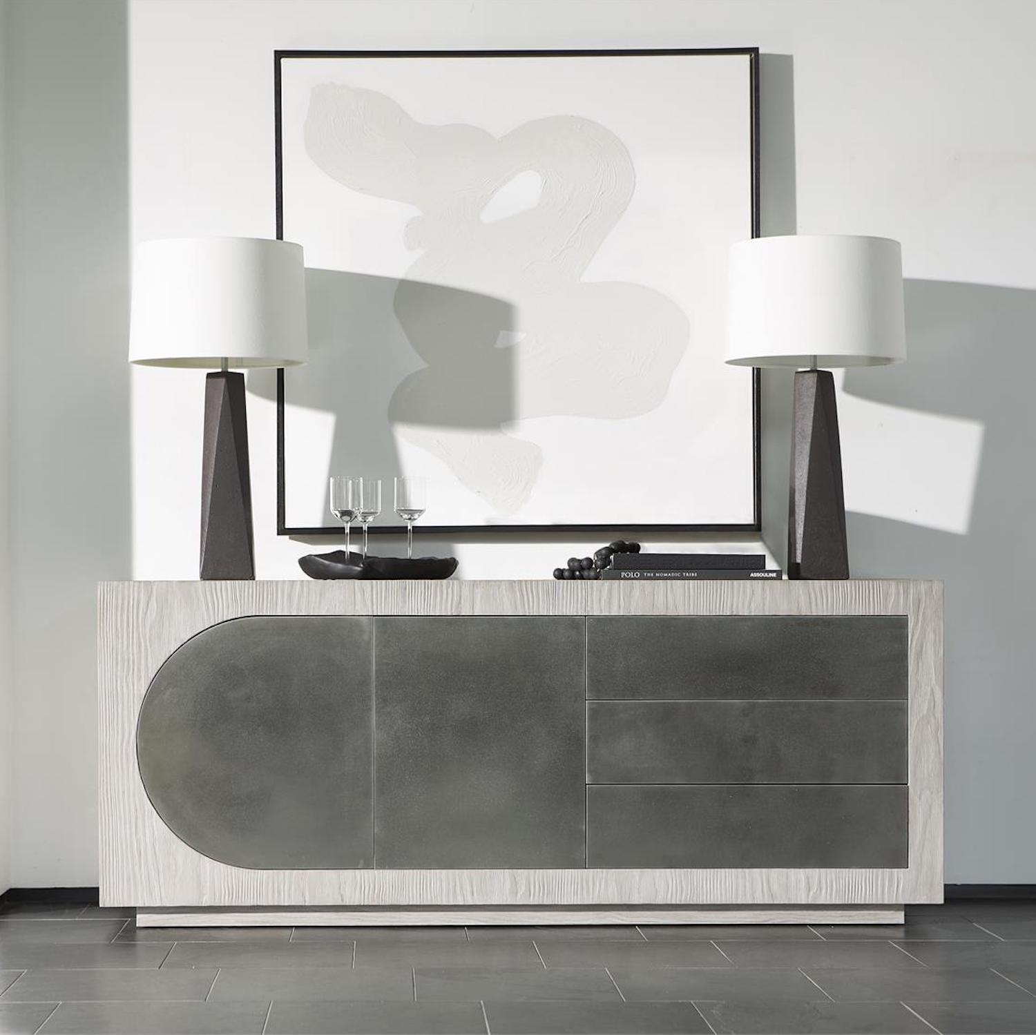 Le buffet Trianon est défini par des formes métalliques saisissantes sur le devant du meuble. La fonte d’aluminium crée un design continu sur les deux façades de porte et les trois tiroirs, se connectant ensemble pour un look magnifique. Derrière les deux portes se trouvent des tablettes fixes et ajustables, et le tiroir supérieur est doté d’un insert à argenterie en tissu Guardian.
