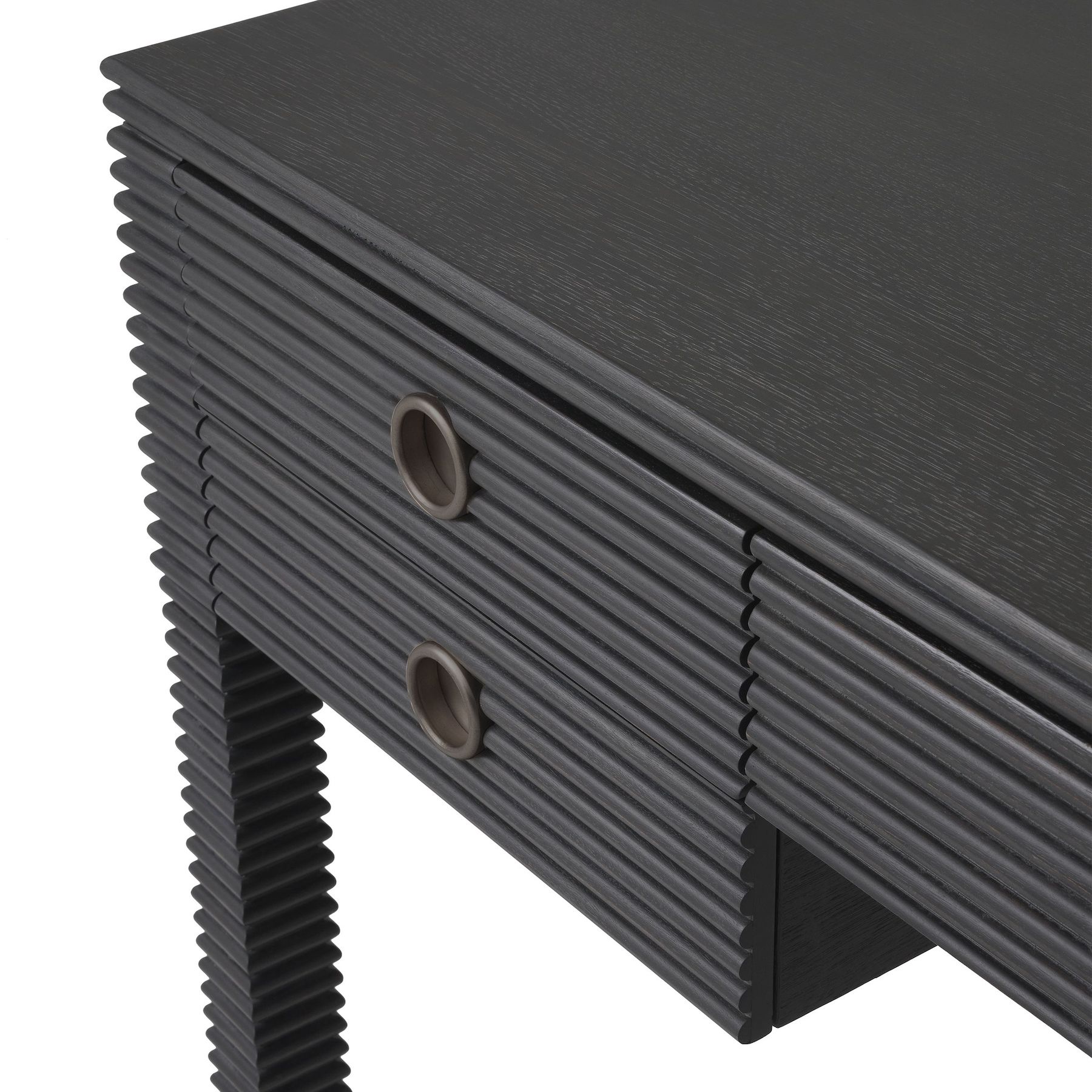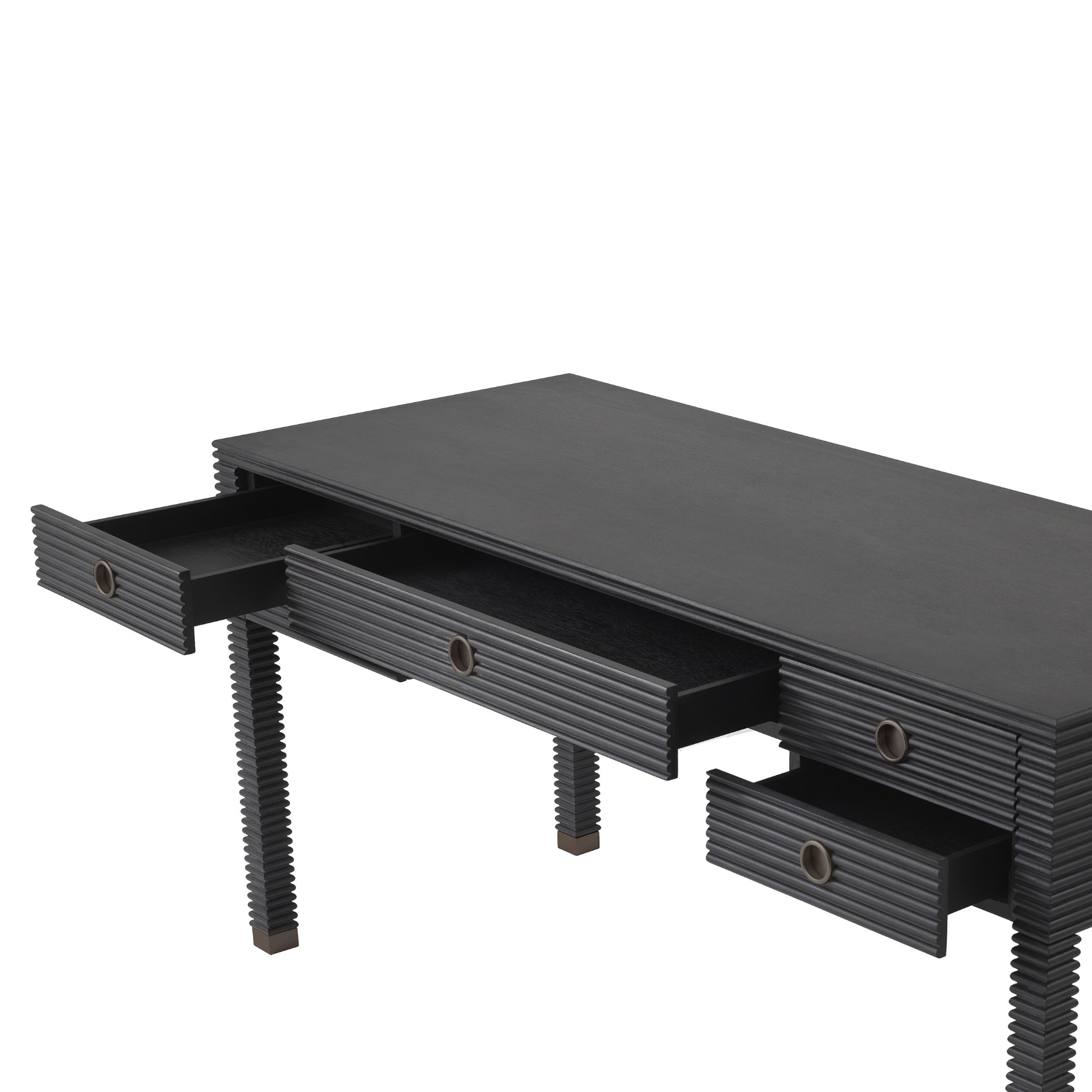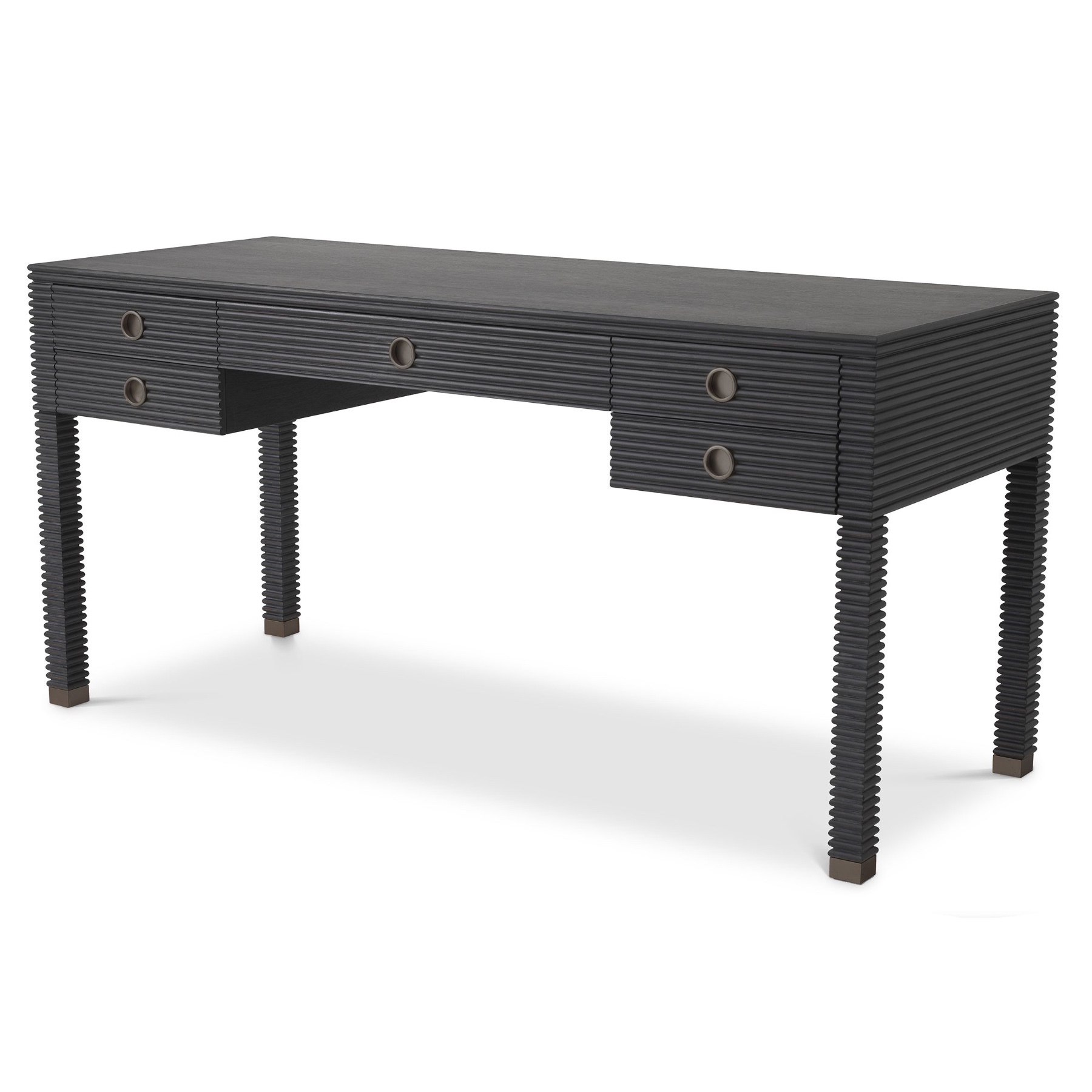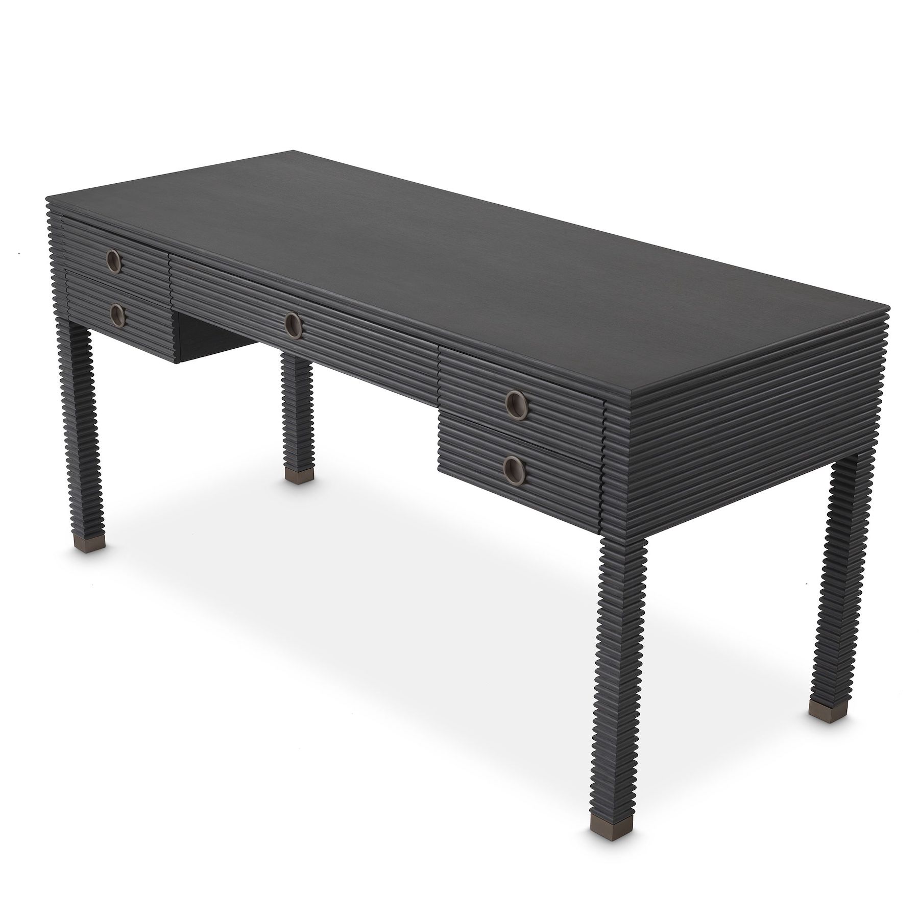 Gardez votre bureau à domicile à la fois élégant et bien rangé avec le bureau Dimitrios. Le design côtelé de ce bureau moderne en placage de chêne anthracite avec des accents de bronze complètera votre espace de travail. Cinq tiroirs offrent une grande quantité de rangement pratique.