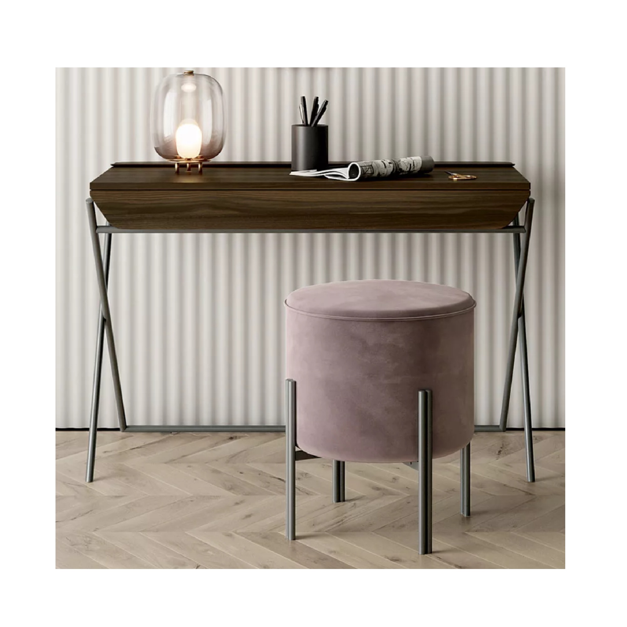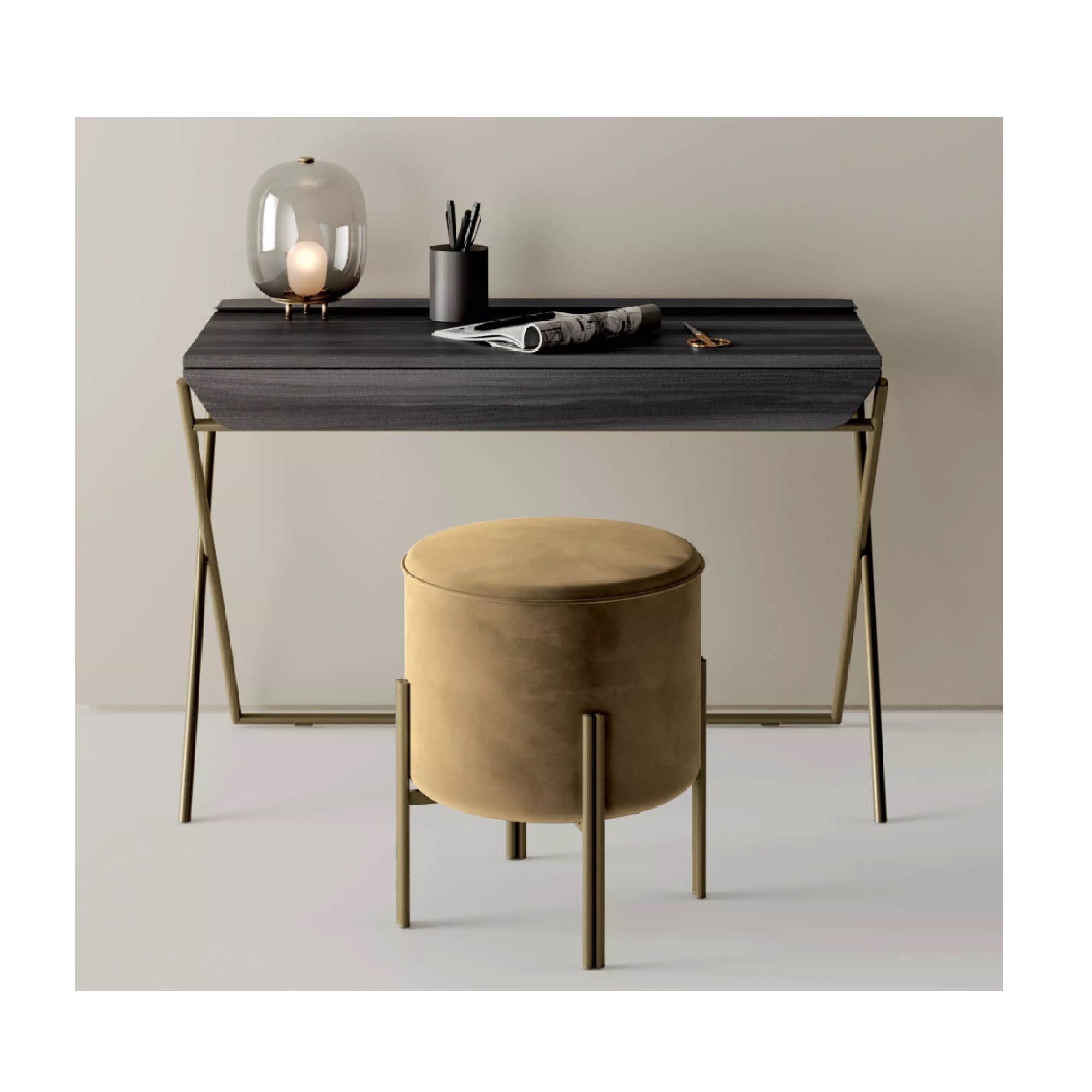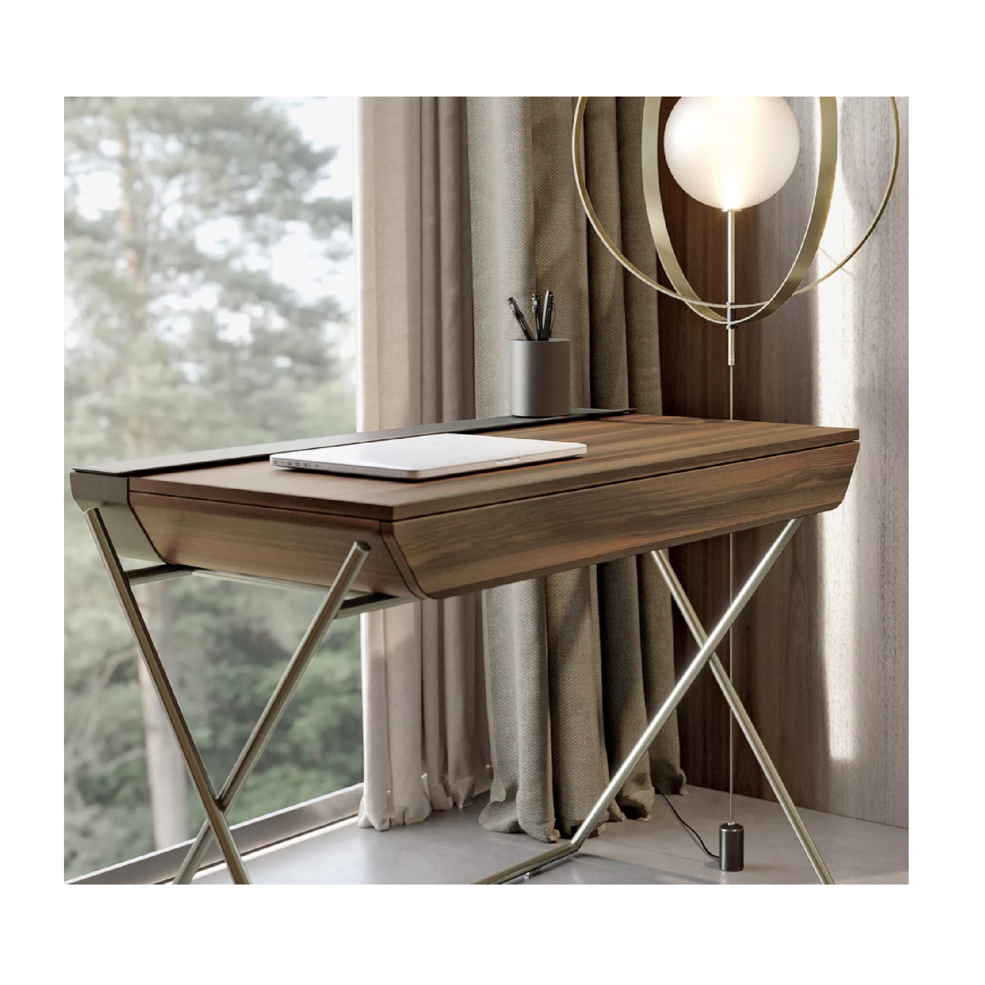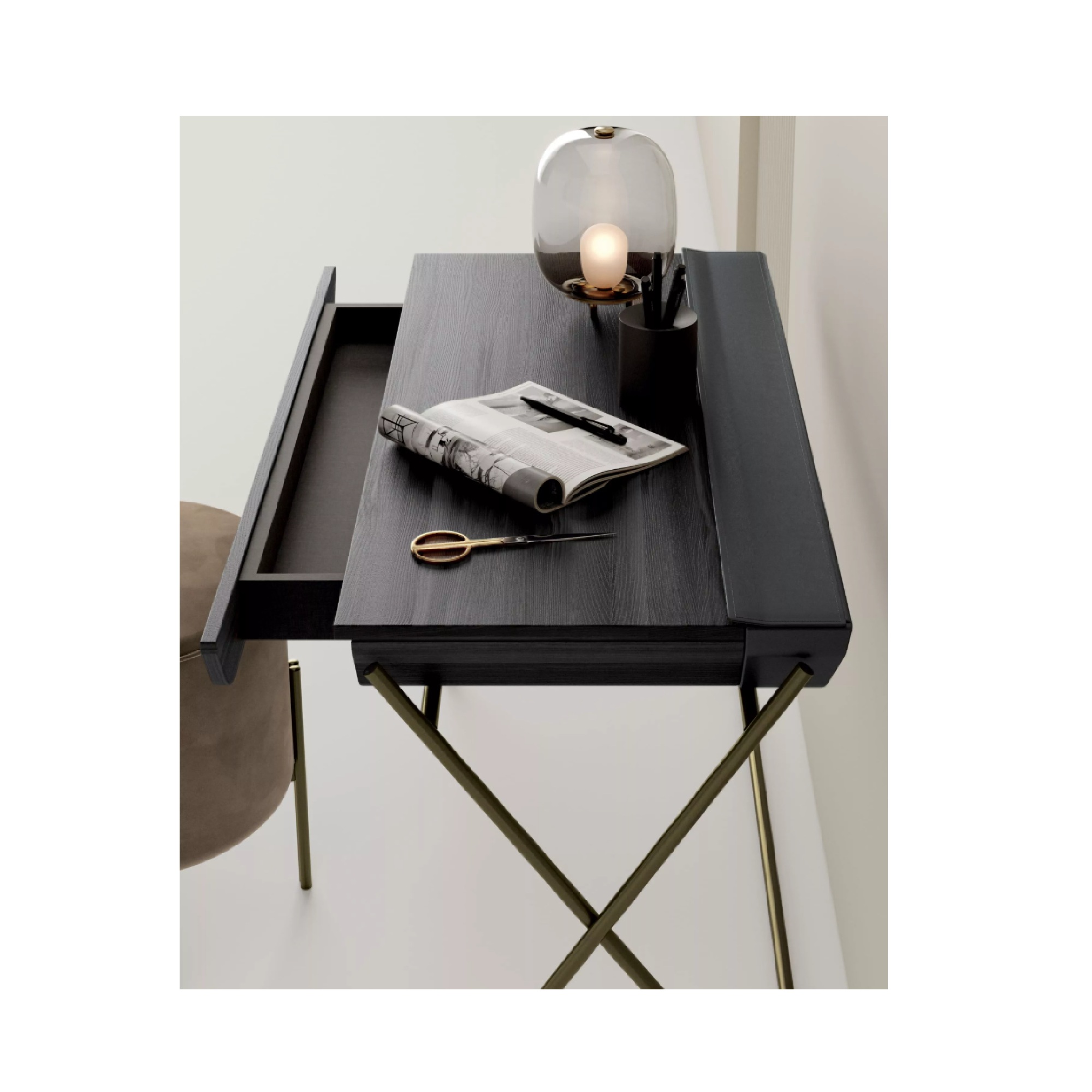 Bureau avec structure en métal disponible en plusieurs finitions laquées. Dessus et tiroir disponibles en options de placage bois et compartiment de rangement disponible en options de cuir.