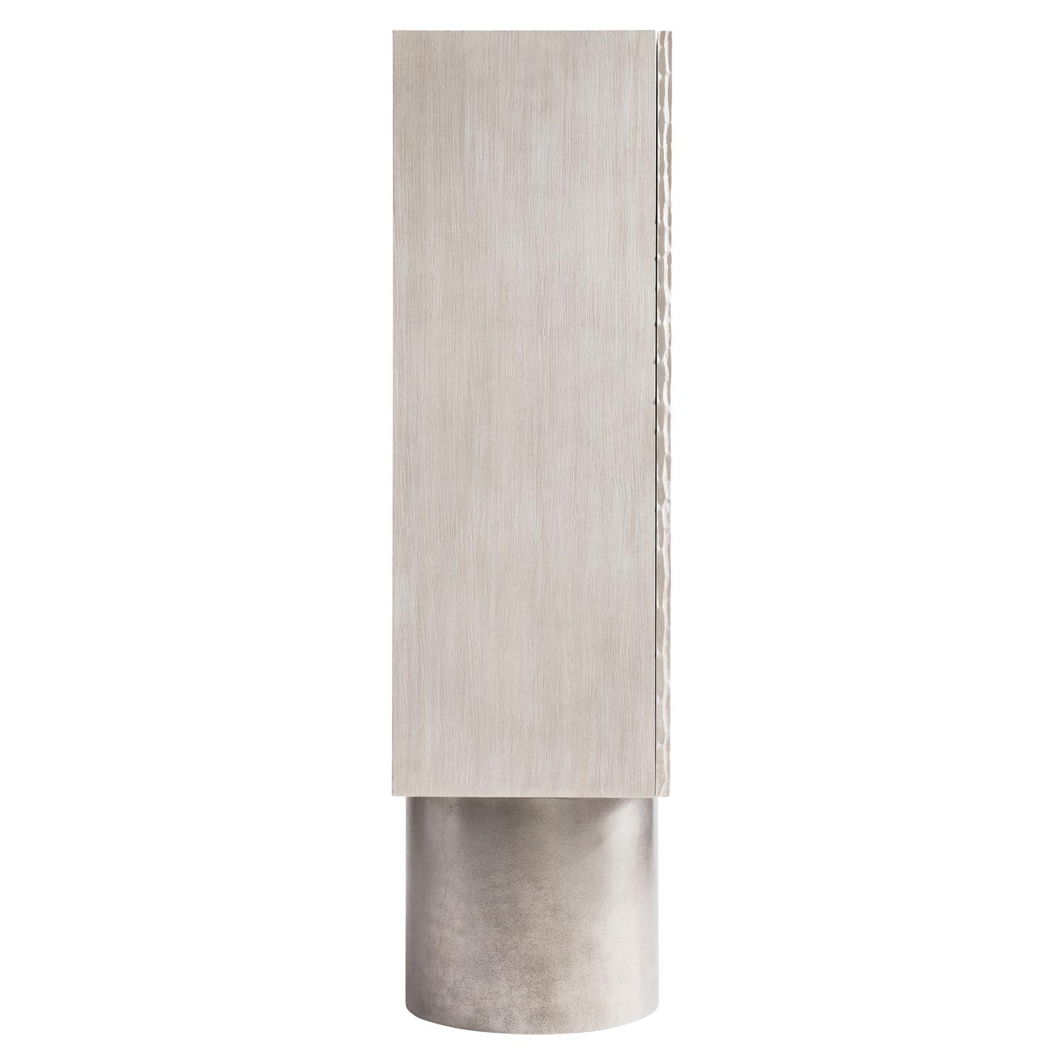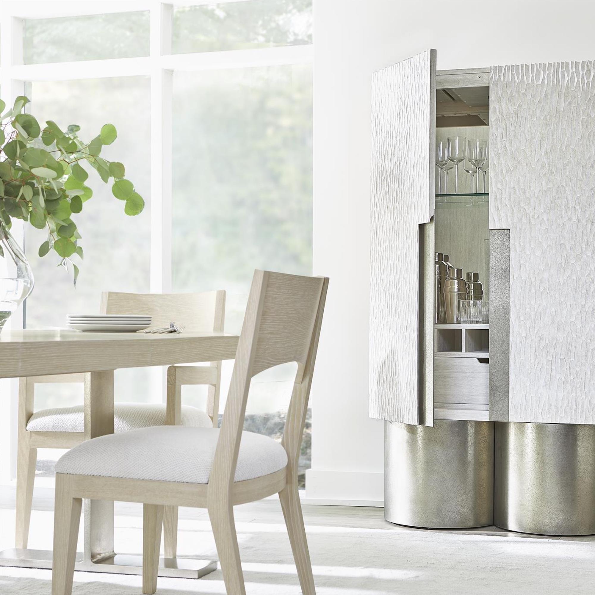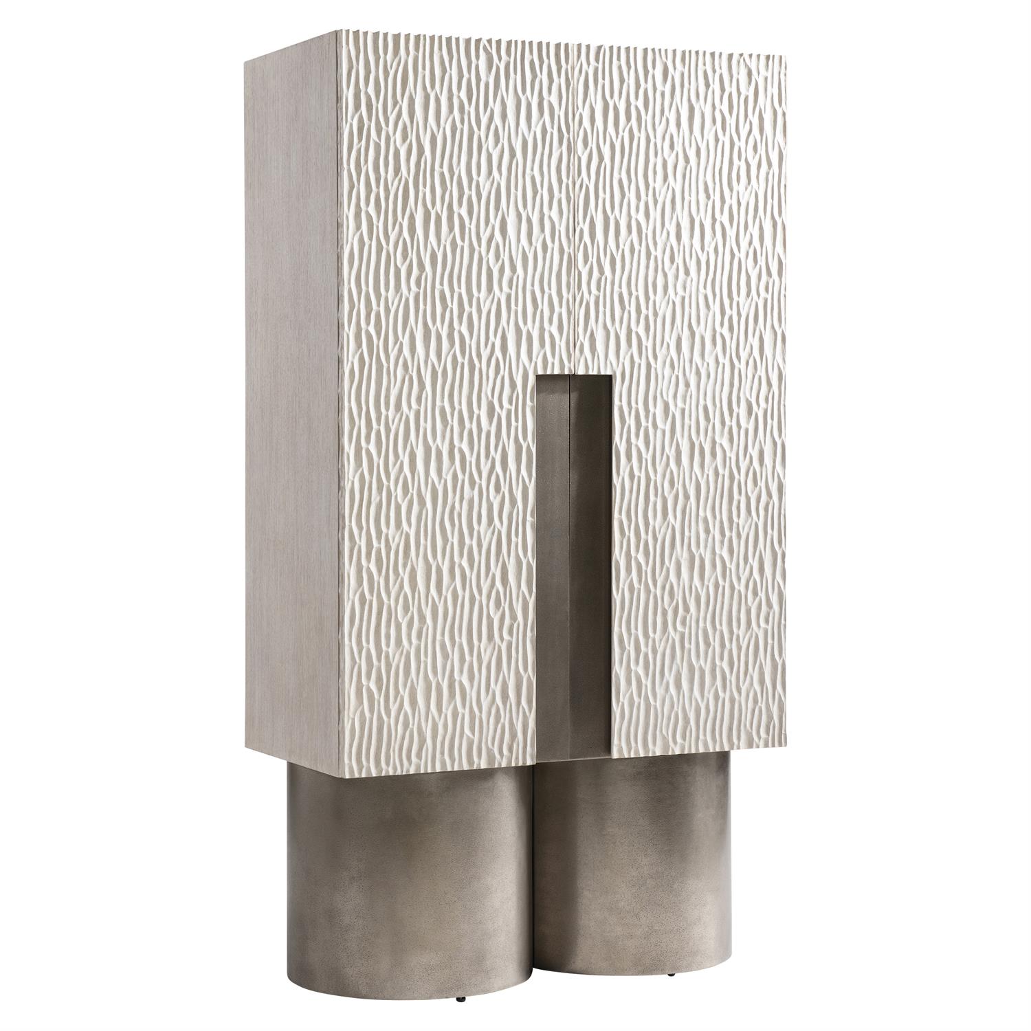 L’influence du style Bauhaus est évidente sur le cabinet de bar Solaria, qui met en valeur la simplicité, l’élégance et les formes géométriques. Les deux portes présentent un motif ciselé en résine moulée, avec une finition Weathered Bone et des plaques en fonte d’aluminium insérées dans une finition nickel. Des formes circulaires en fonte d’aluminium créent une base, également dans la finition nickel. Derrière les portes se trouvent deux tablettes ajustables en verre trempé, une tablette fixe, un rangement pour les bouteilles de vin, un tiroir et quatre porte-verres à pied.