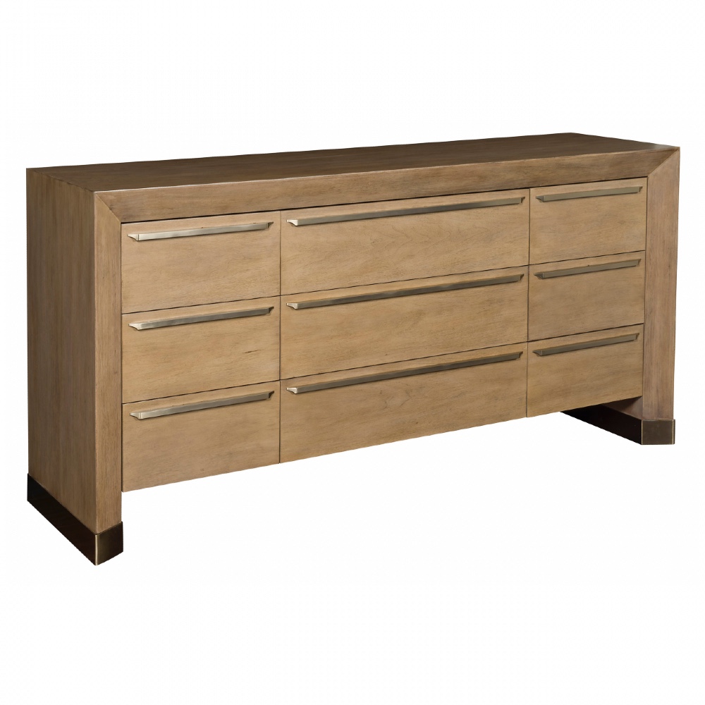 Neuf tiroirs, embouts de pattes en bronze blanc, façades de tiroir en noyer blanchi, poignée en métal bronze blanc.