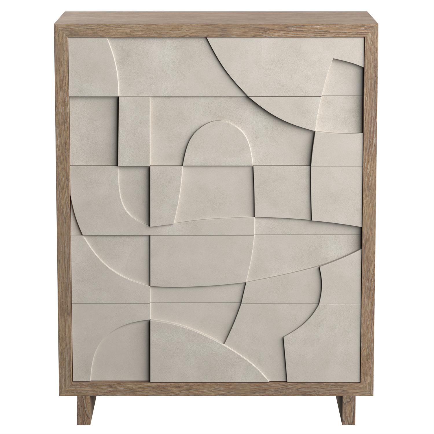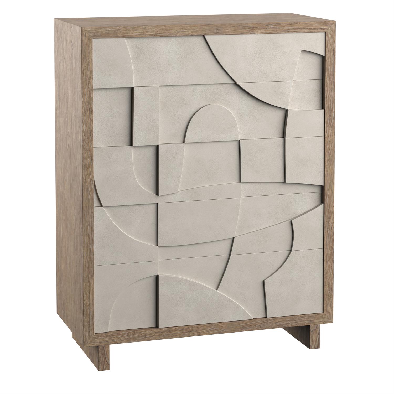 La texture et la dimension confèrent un look unique à la commode Casa Paros. Cinq tiroirs en faux béton à ouverture par pression sont mis en valeur dans la finition Bedrock. Les panneaux du haut et des pieds présentent la finition chaude Playa qui offre le contraste parfait pour un design raffiné et rustique.