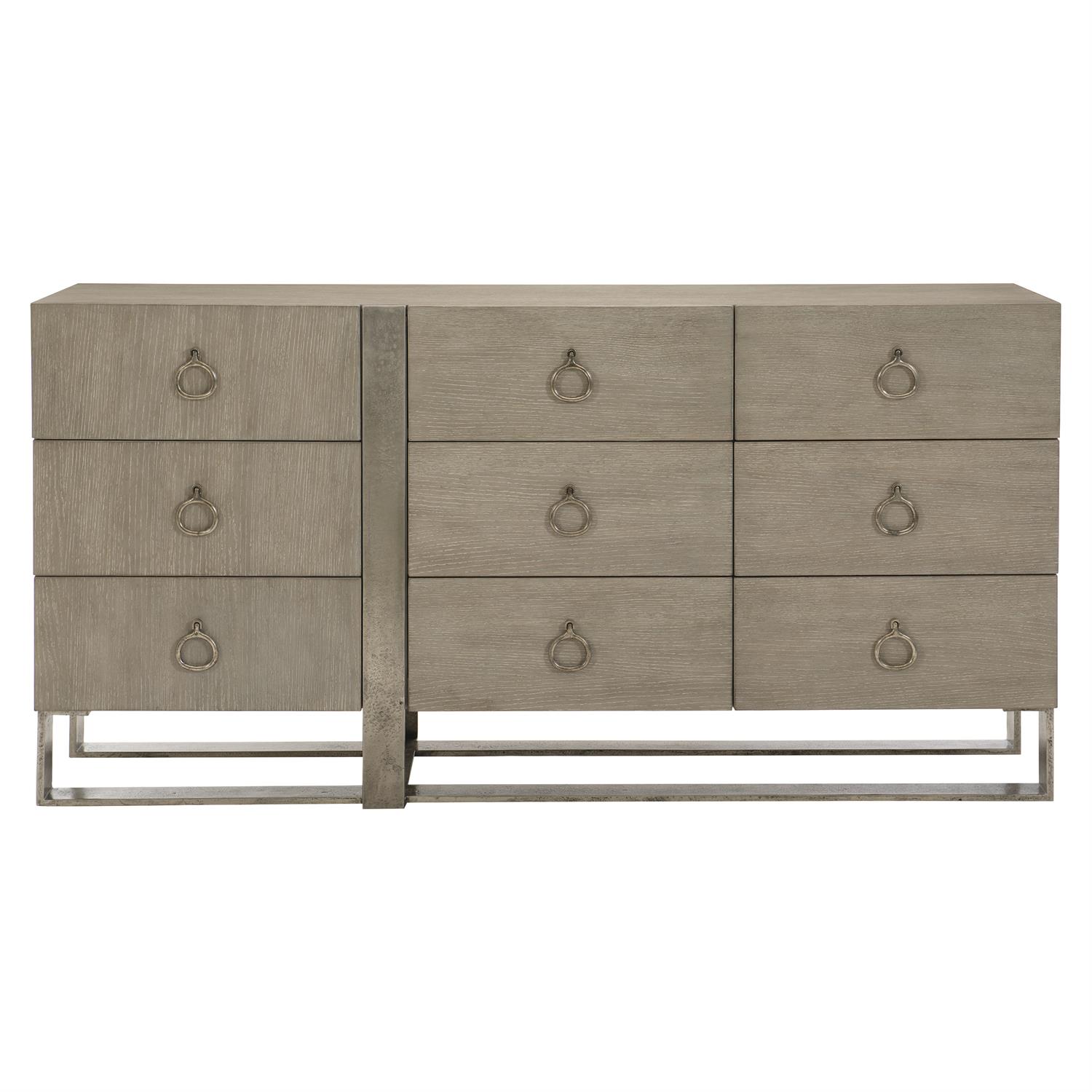 Avec son art impeccable et son élégance discrète, Linea établit une nouvelle norme pour les collections modernes rustiques. Une forme asymétrique donne à la commode Linea à neuf tiroirs son aspect singulier. Fabriquée à partir de métal richement texturé, une base ouverte fournit un support tandis qu’une bande métallique assortie entoure l’avant de la commode. Fini en Cerused Greige, les placages de chêne brossé offrent des textures subtiles. Des anneaux irréguliers en finition graphite texturé donnent l’impression d’être des bijoux, ce qui ajoute à l’attrait artistique de ce meuble remarquable.