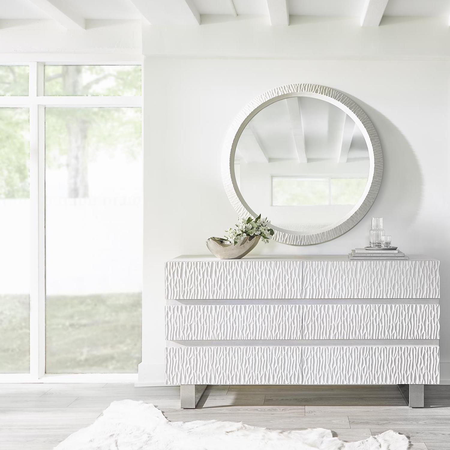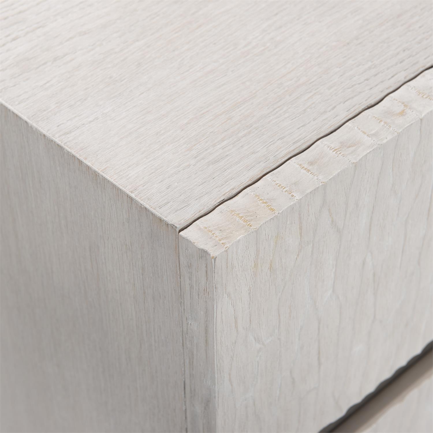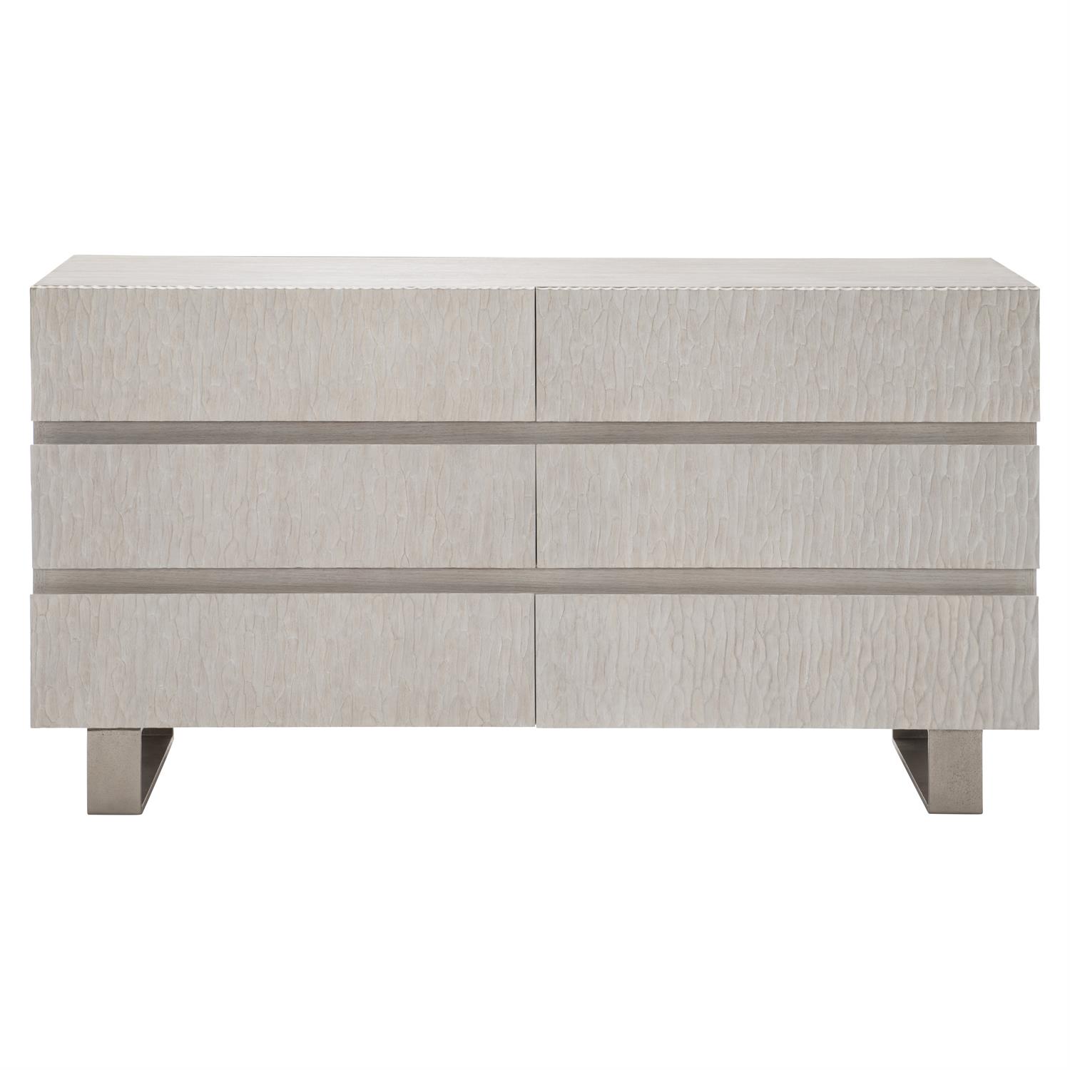 Des contrastes discrets sont réunis dans la commode Solaria. Le bois délavé par le soleil, la résine moulée ciselée et le métal texturé se mélangent pour former une étonnante alchimie de design. Six tiroirs offrent un rangement essentiel pour la chambre à coucher.