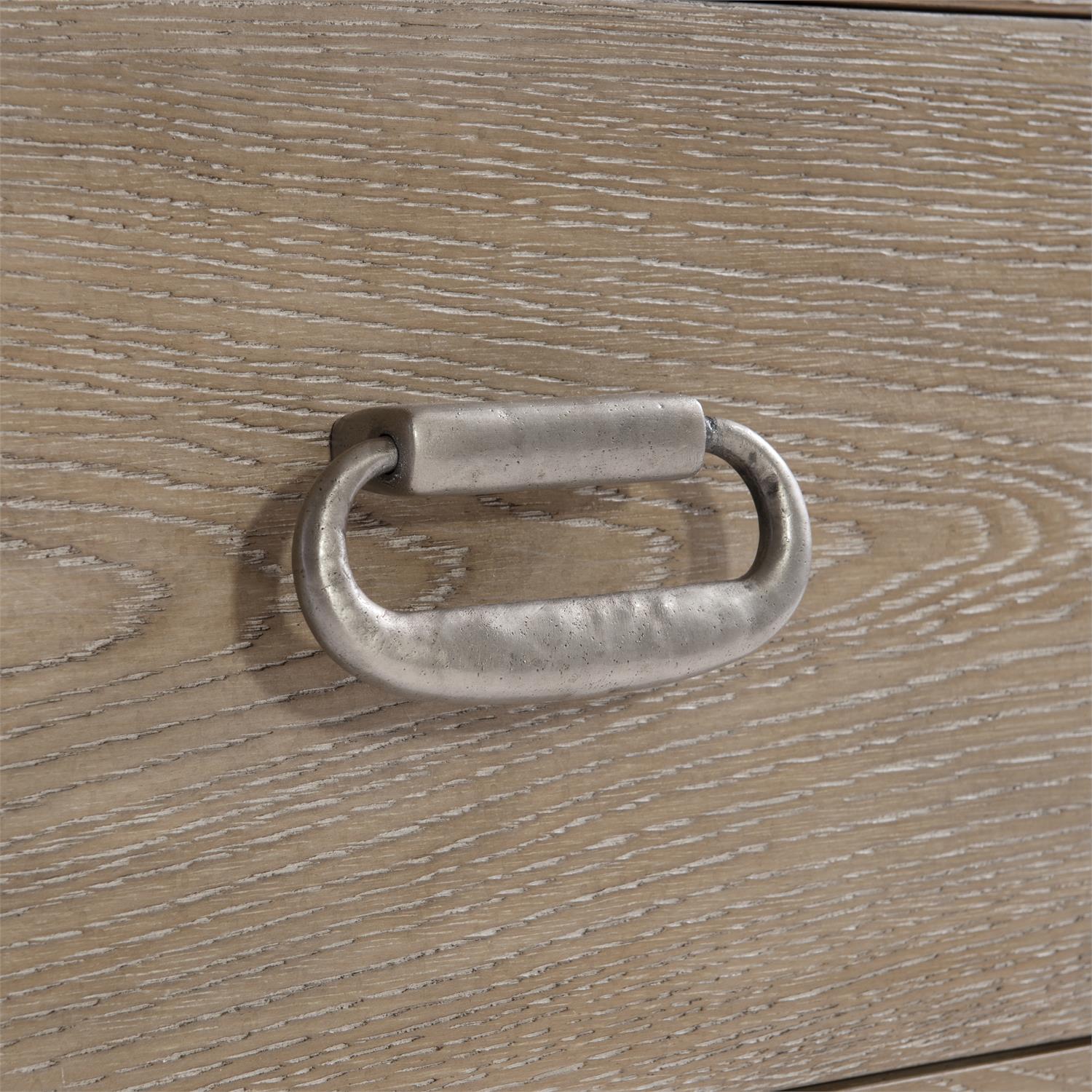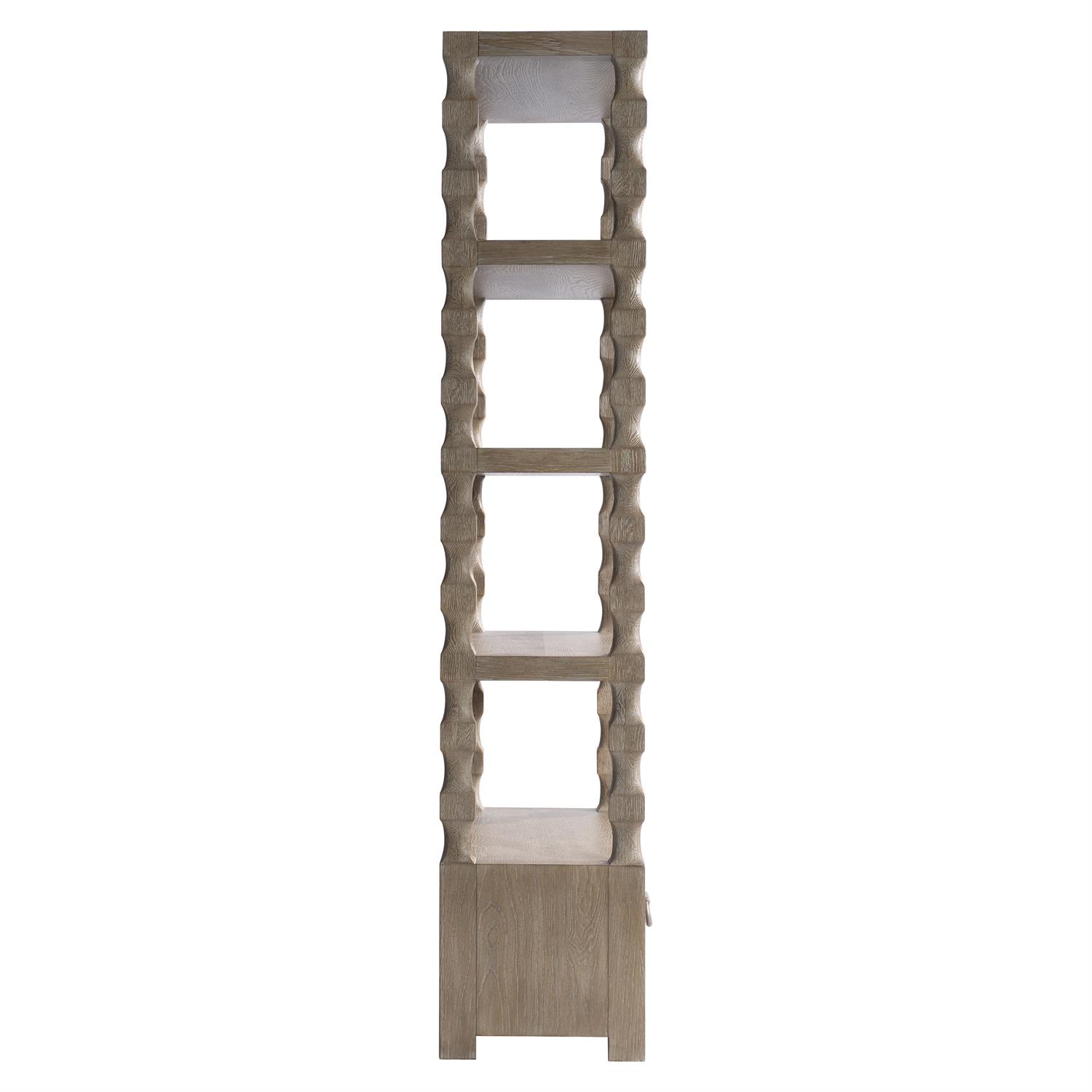 L’étagère Aventura est mise en valeur par des poteaux en résine moulée de forme unique qui supportent trois tablettes fixes et une surface de tablette. Un tiroir inférieur avec tirette métallique ajoute du rangement. Le design de l’étagère à dos ouvert est fini dans une finition Marcona chaude et rustique.