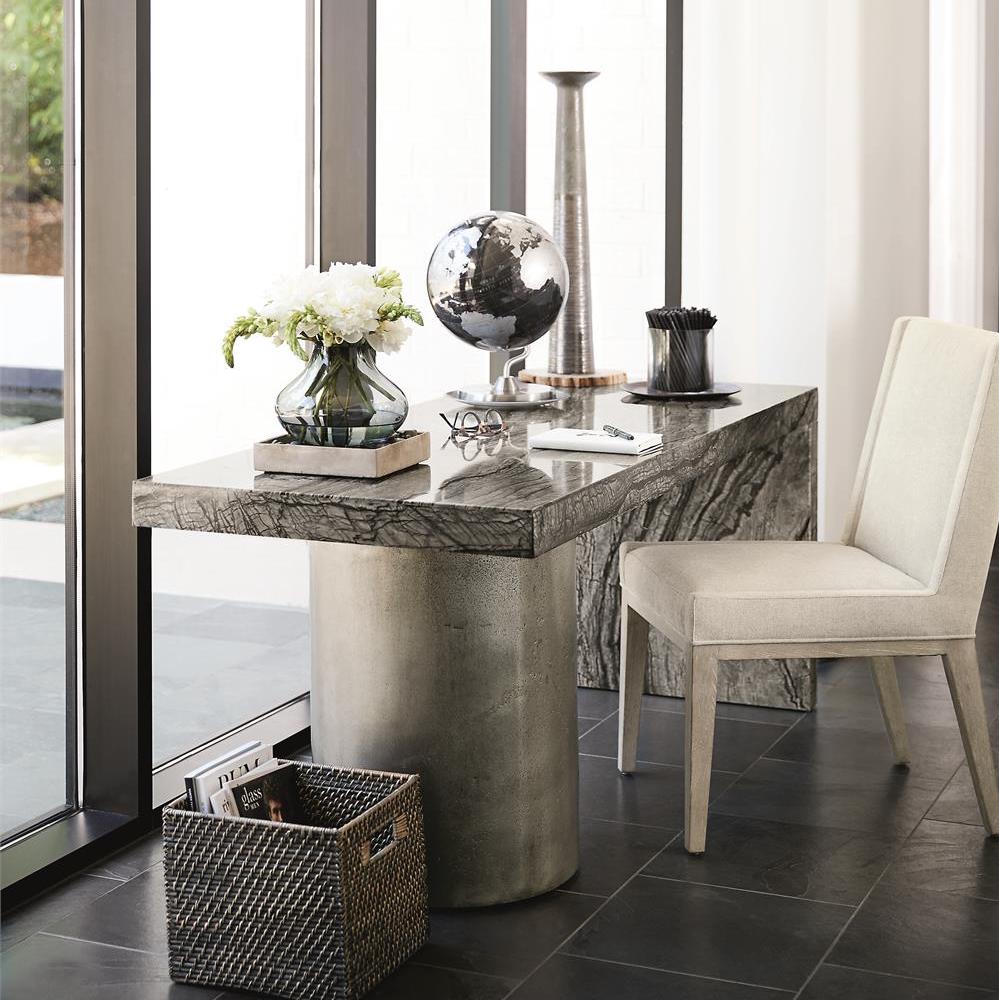 Avec son aspect artistique impeccable et son élégance discrète, Linea établit une nouvelle norme pour les collections modernes rustiques. Plein de contrastes et d’effets dramatiques, le bureau Linea associe les motifs audacieux du marbre Black Forest à la fonte d’aluminium texturée dans un design asymétrique saisissant. Avec ses tons anthracite et ses stries blanc neige, le marbre confère un aspect élégant et haut de gamme. Ajoutant une couche de sophistication subtile, le piédestal rond en fonte d’aluminium présente un fini graphite texturé obtenu par un processus en plusieurs étapes.