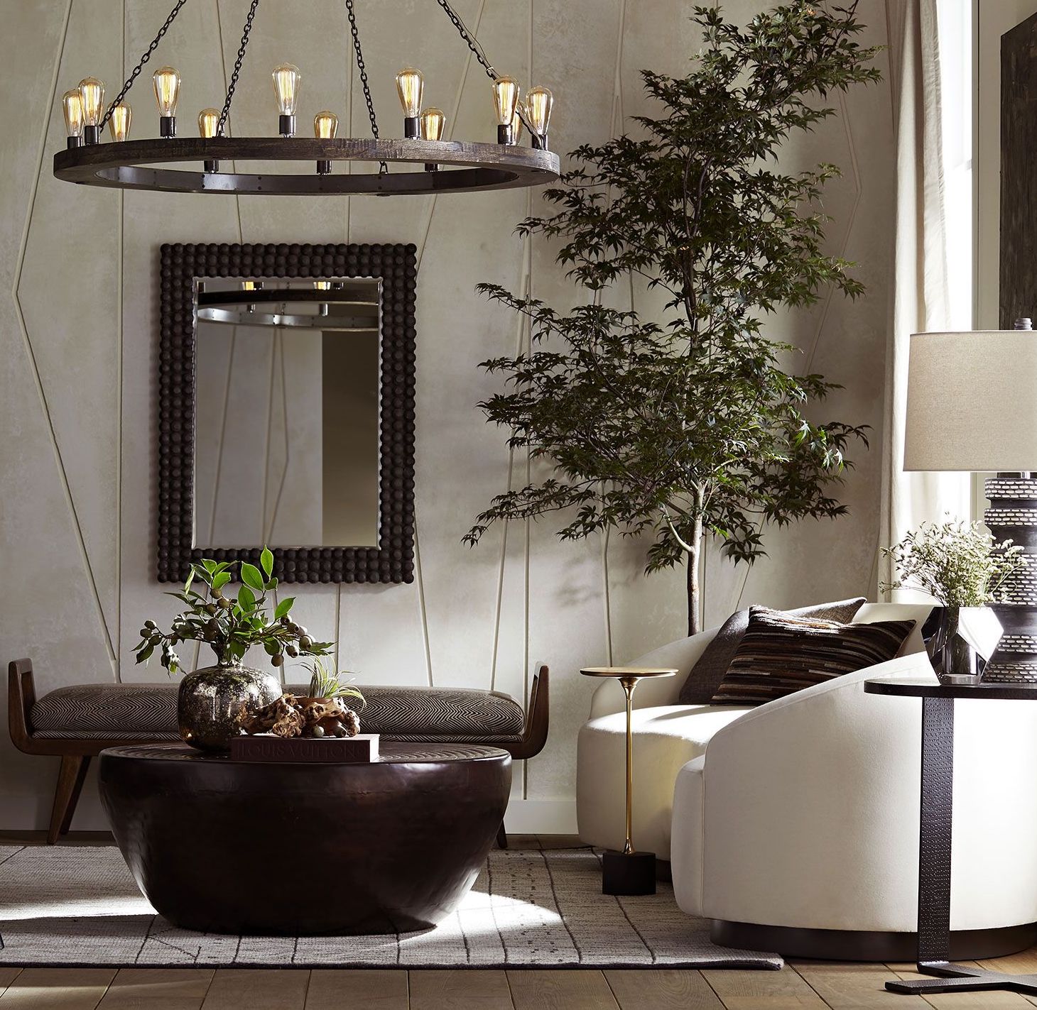 Cette table de cocktail en fer présente une finition bronze antique et des détails en forme d’anneaux repoussés.