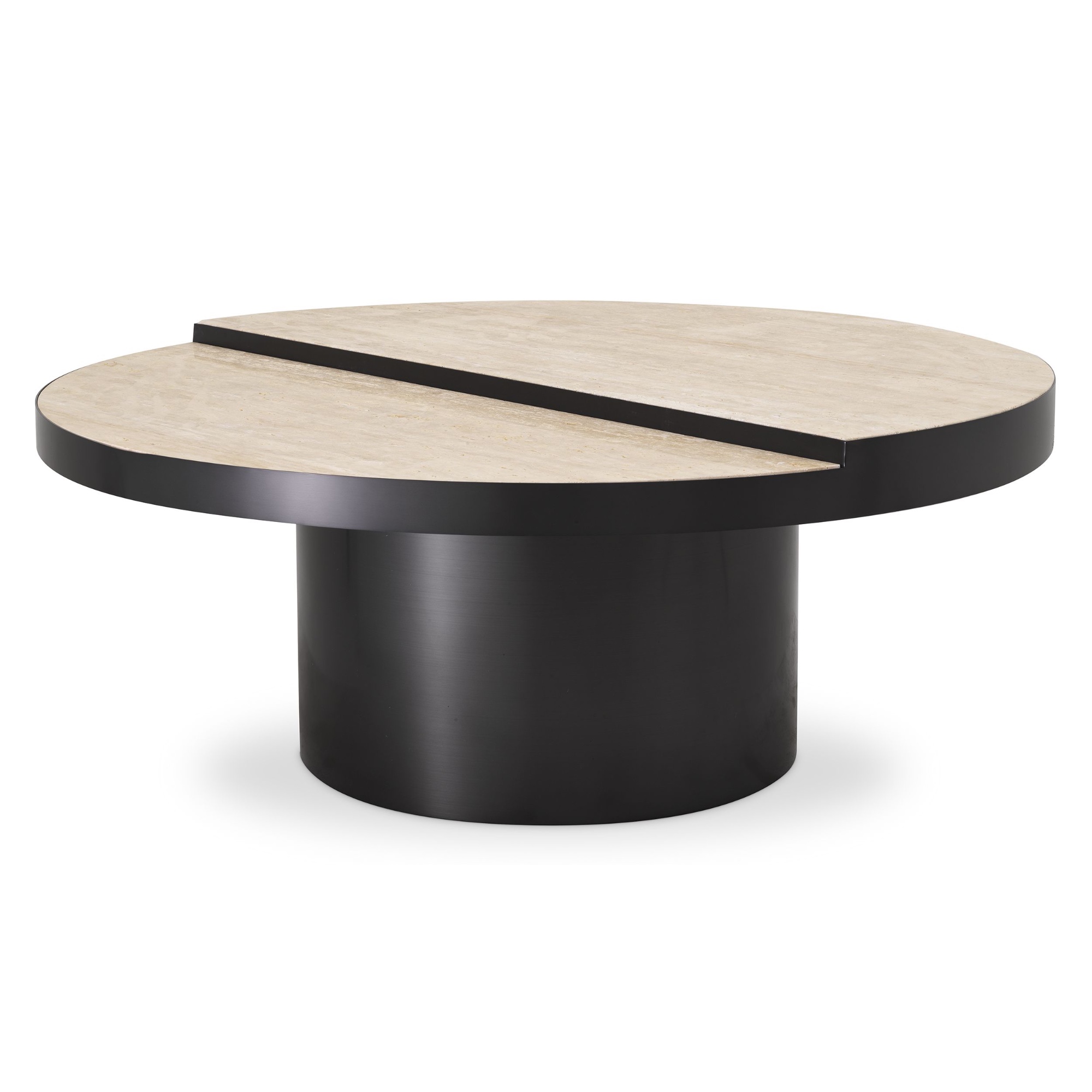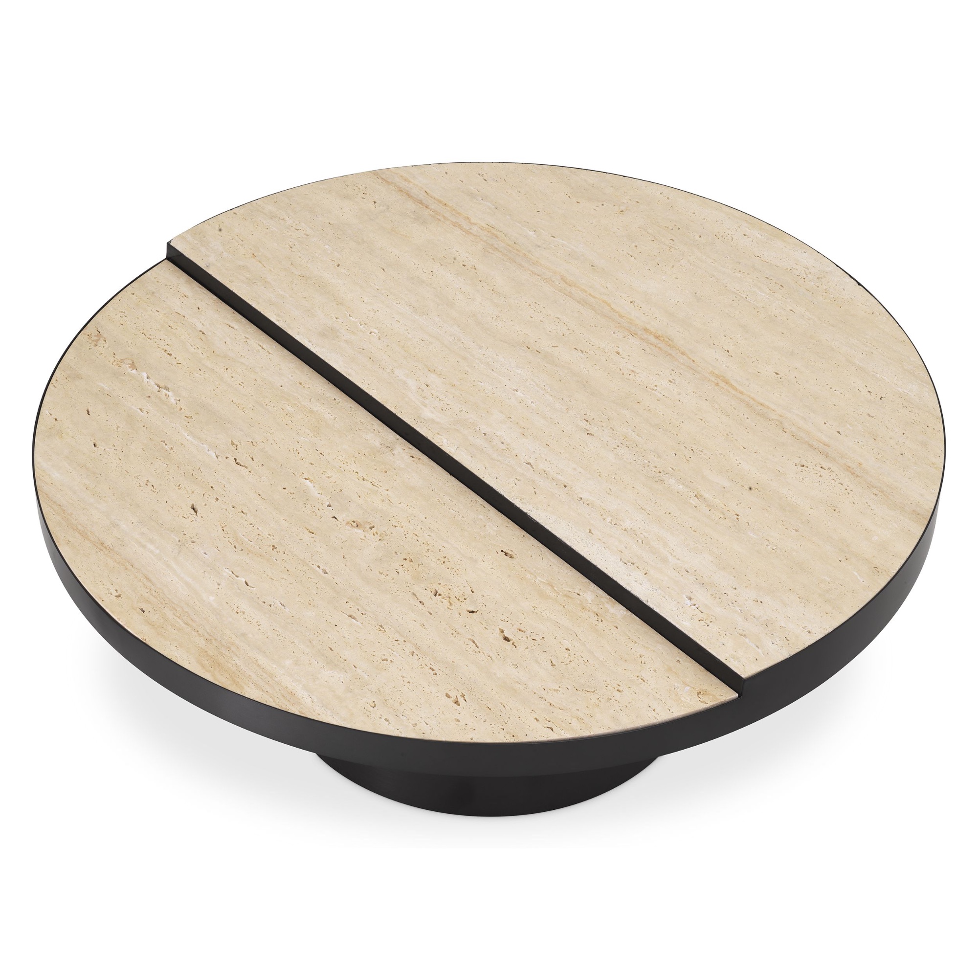 Agrémentez votre salon avec la table basse Excelsior ultra-chic. L’exceptionnel plateau de table est constitué de deux plaques de travertin semi-circulaires.