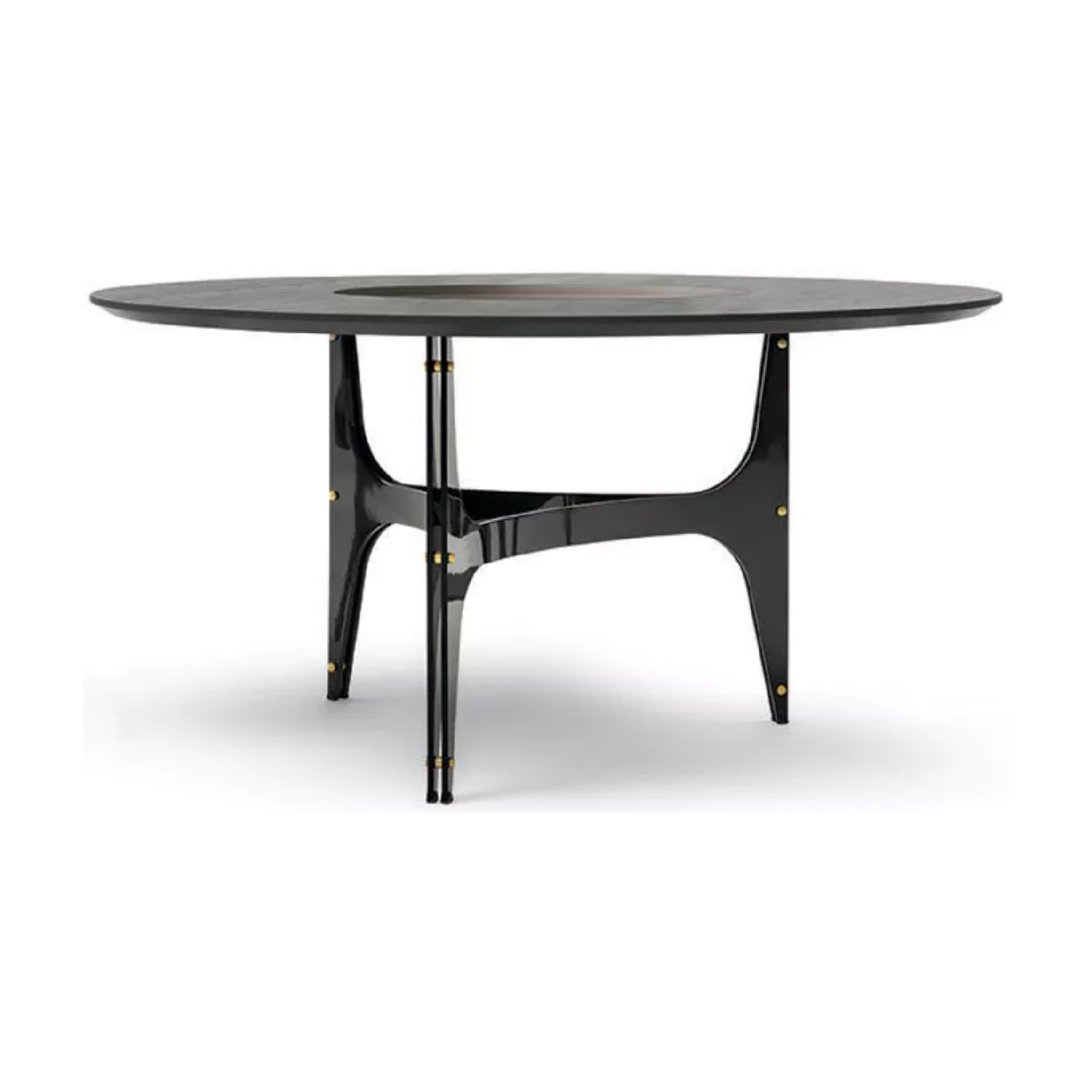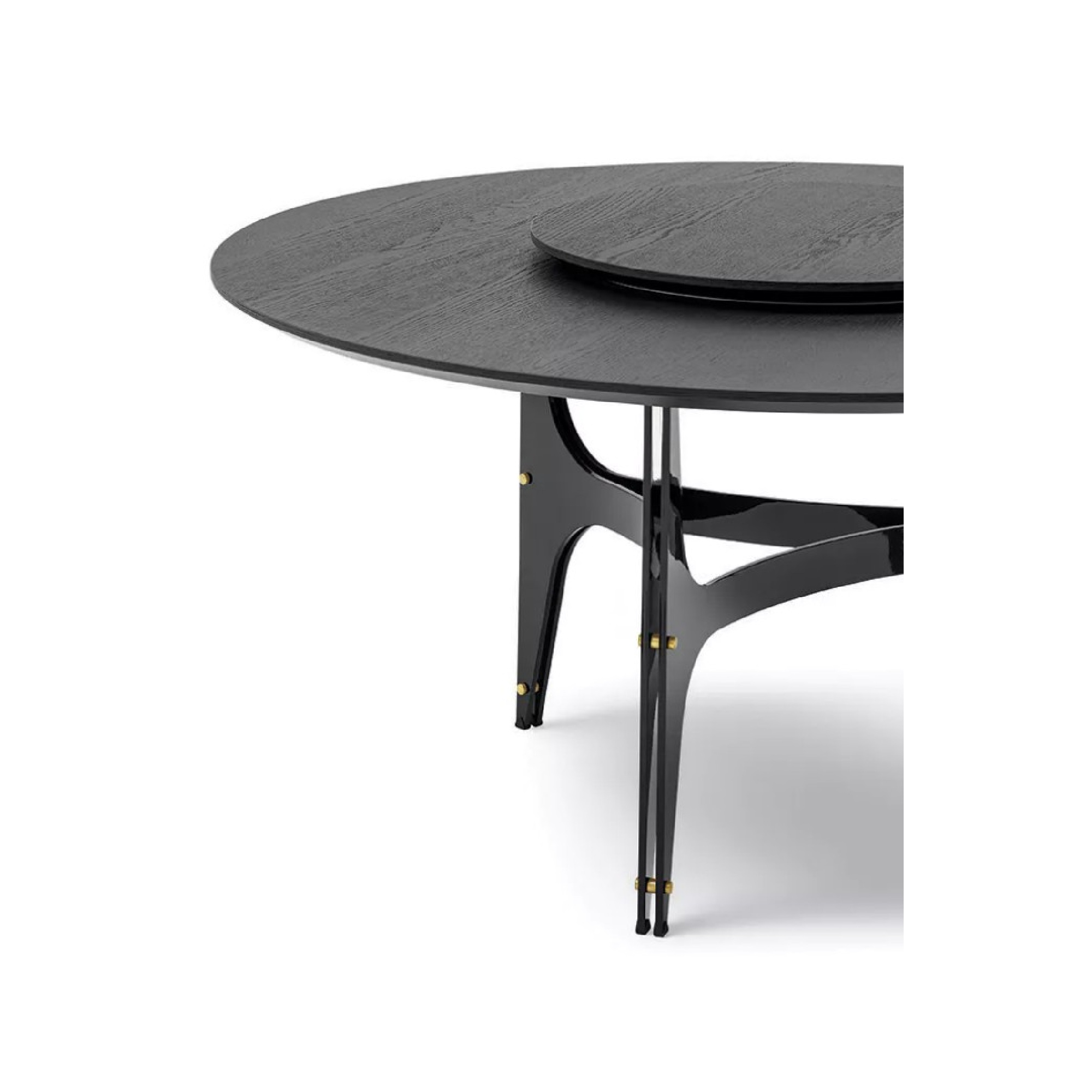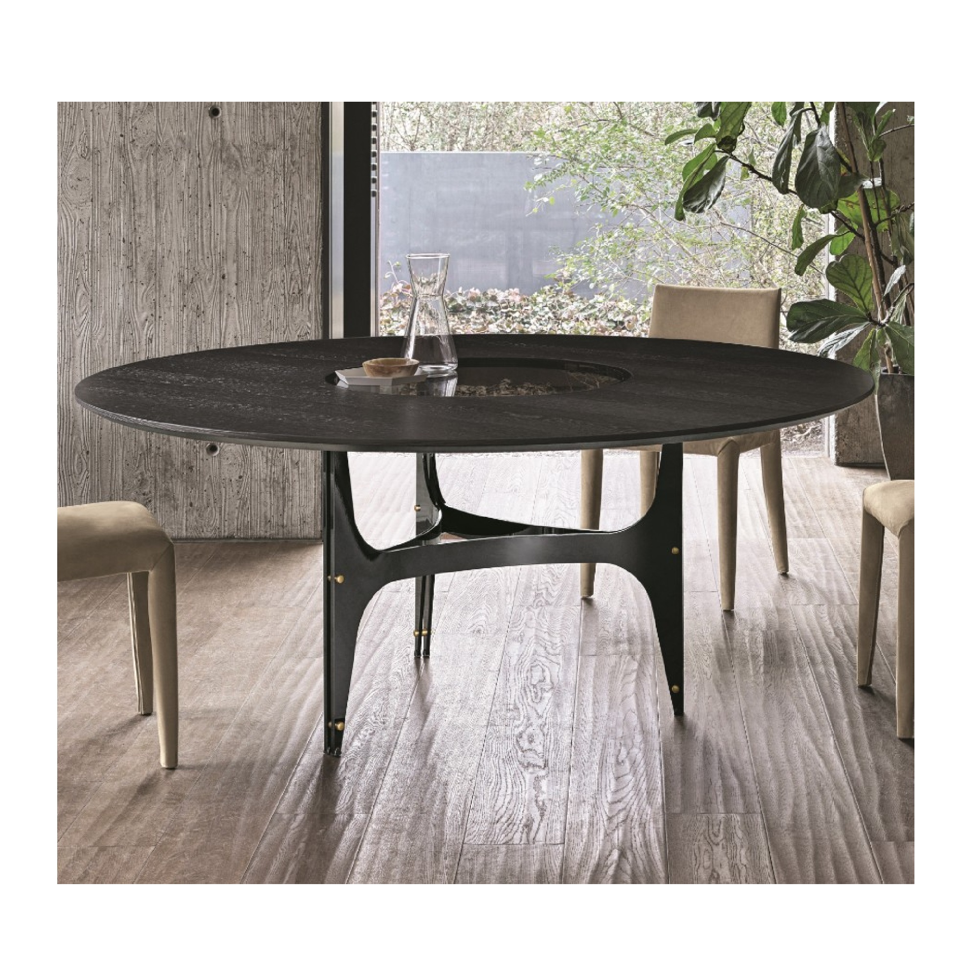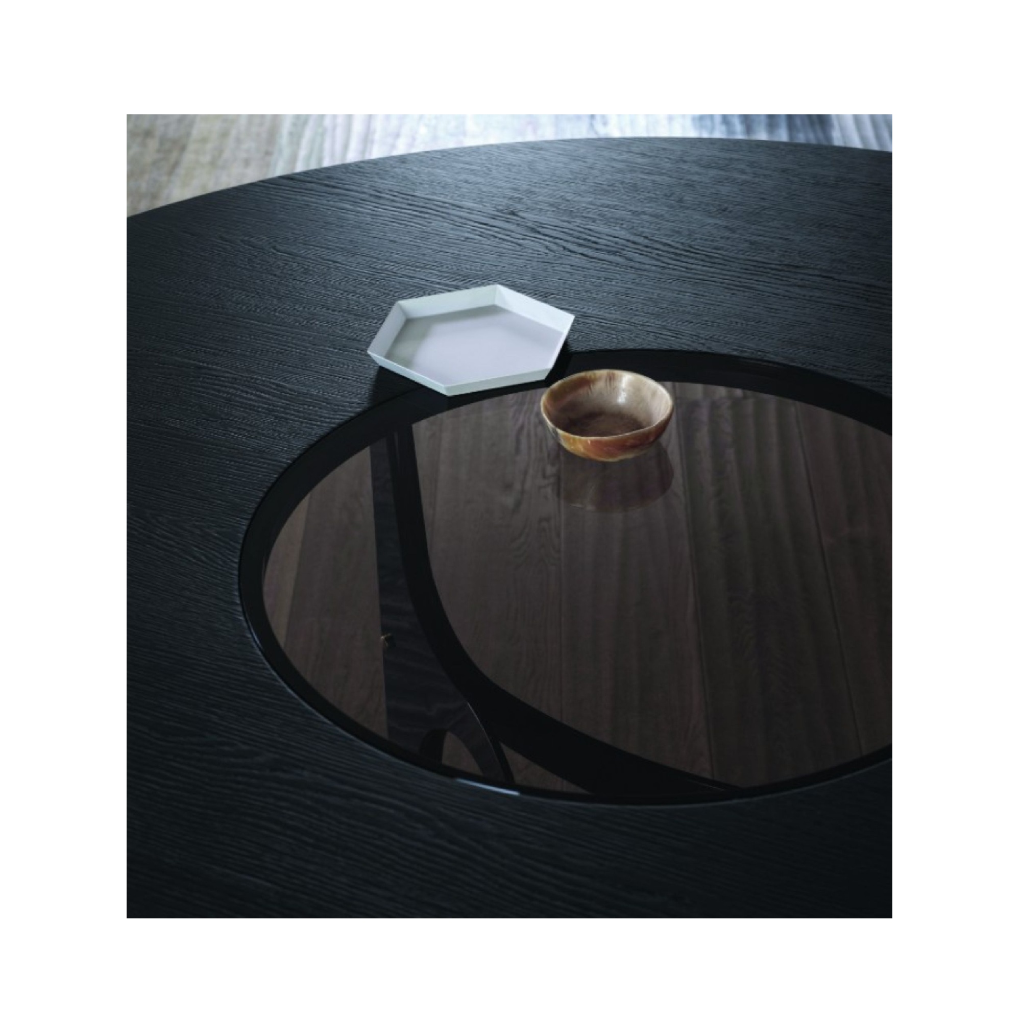 Base en métal avec plateau en placage de chêne ou de noyer, avec insert pivotant en verre transparent, fumé ou bronze, en verre laqué velours mat anti-grattage ou en SuperMarble.