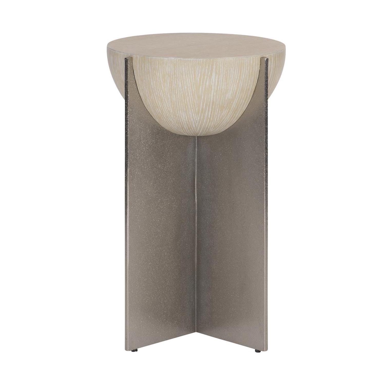 Plateau en forme de demi-sphère en finition Dune, supporté par une base en aluminium moulé Patins ajustables