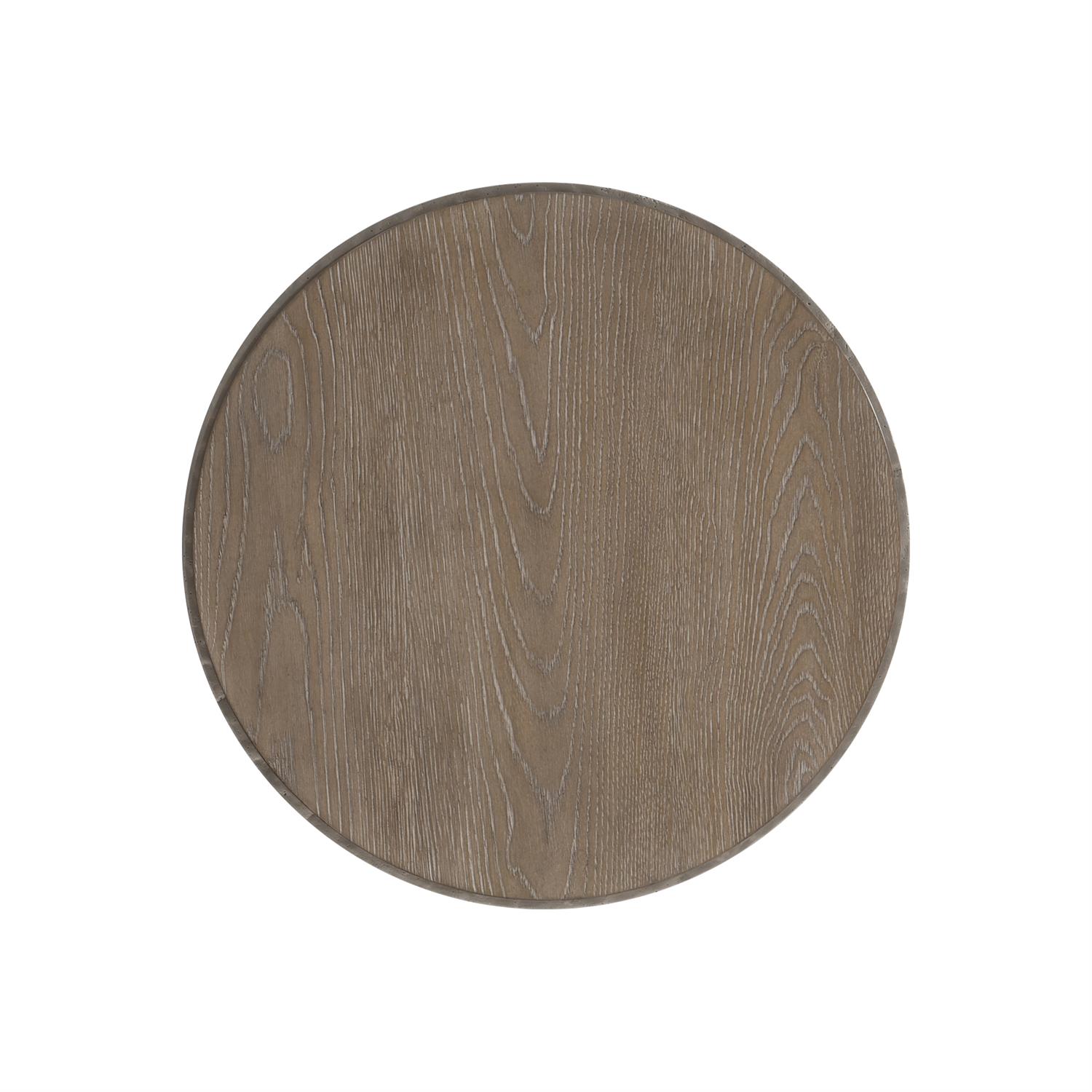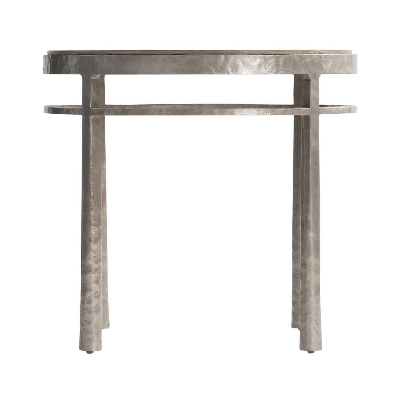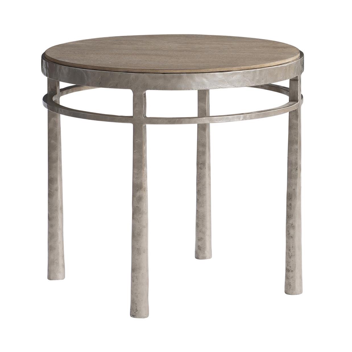 Un cercle de bois bordé de fonte d’aluminium flotte au-dessus d’un anneau satellite en métal sur la table d’appoint Aventura. Les pieds évasés sont formés en aluminium moulé texturé pour un look rustique décontracté. Le plateau en chêne encastré est fini en Marcona.