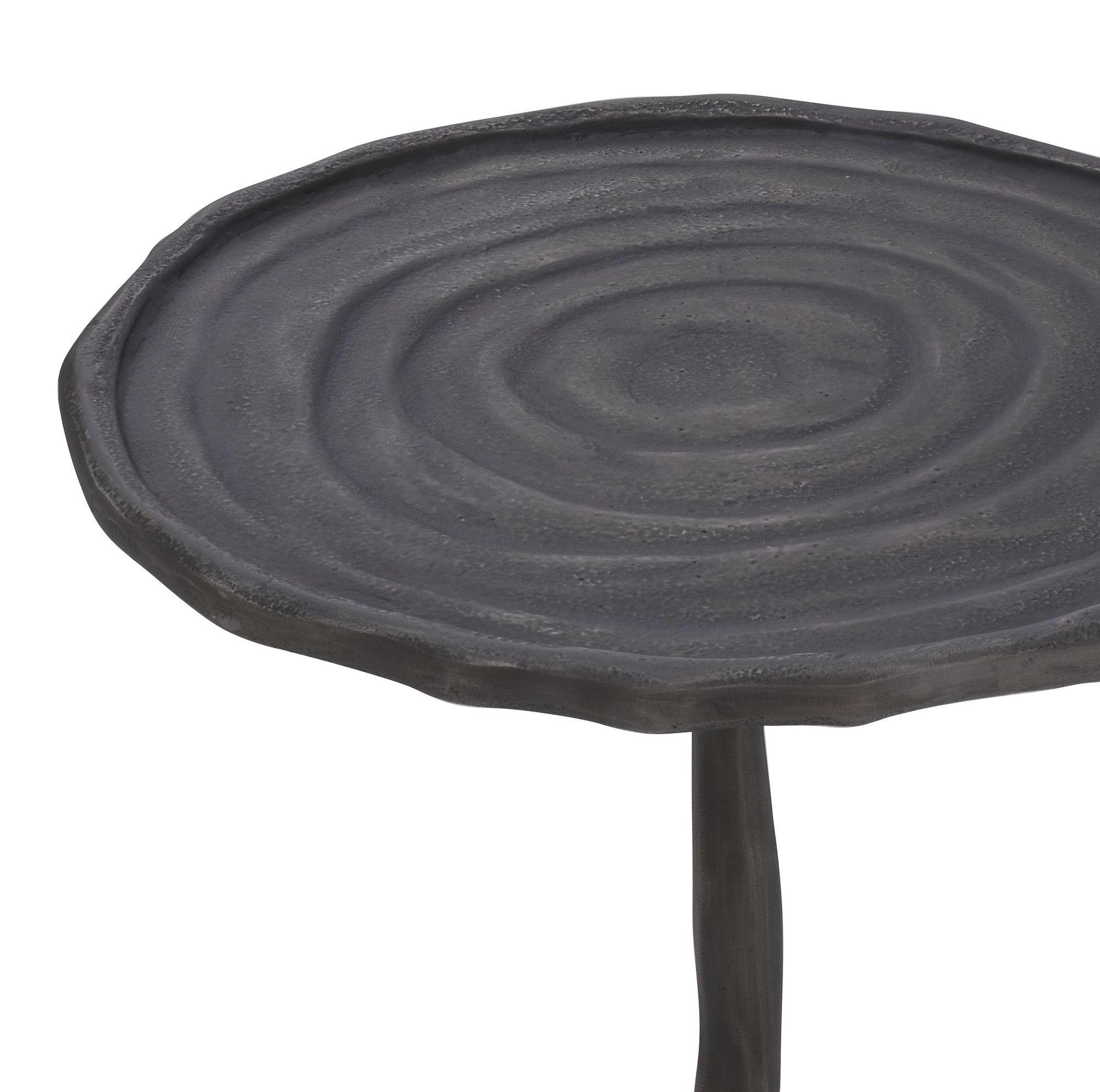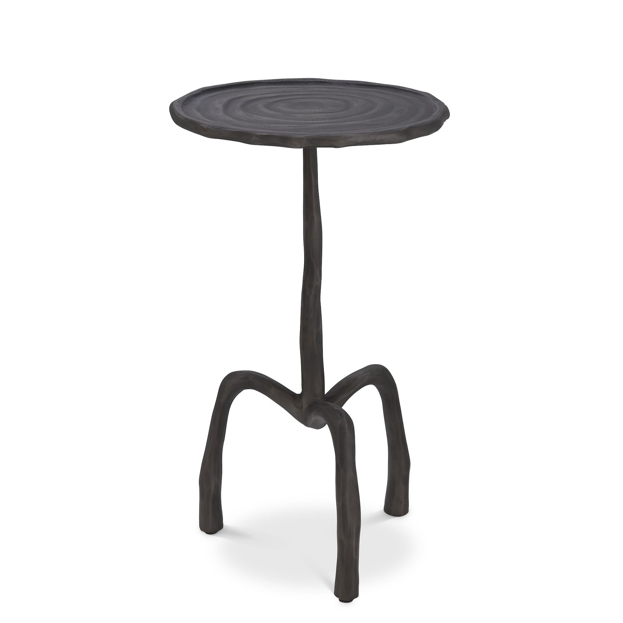 De conception quelque peu traditionnelle mais totalement unique dans son exécution, la table d’appoint Kubu résistera à l’épreuve du temps. Cette extraordinaire table d’appoint semble avoir été taillée dans le bois, mais elle a été fabriquée en métal et embellie d’une finition en bronze. Soutenu par un haut pied et des jambes tripodes incurvées, le plateau rond présente un bord relevé et un relief qui rappelle les anneaux d’un tronc d’arbre.