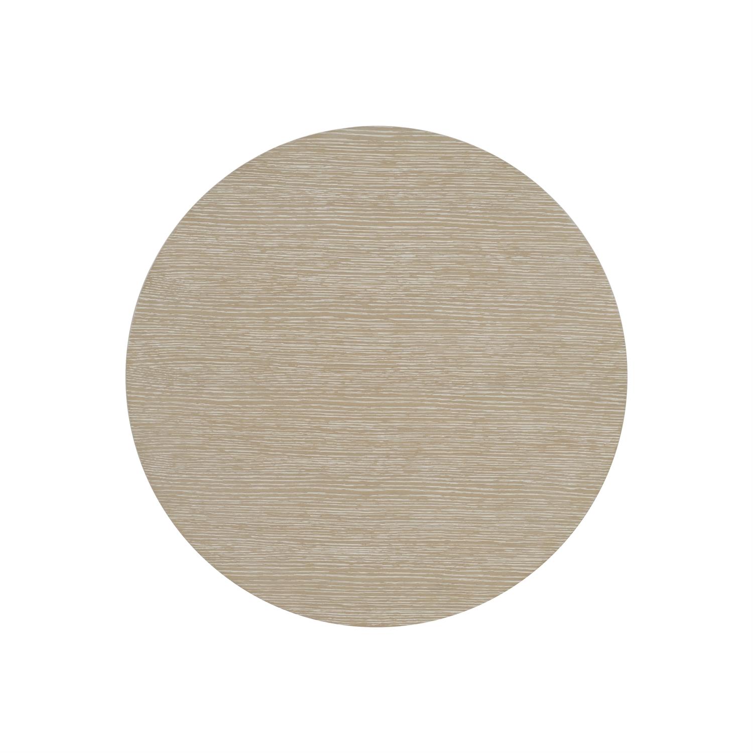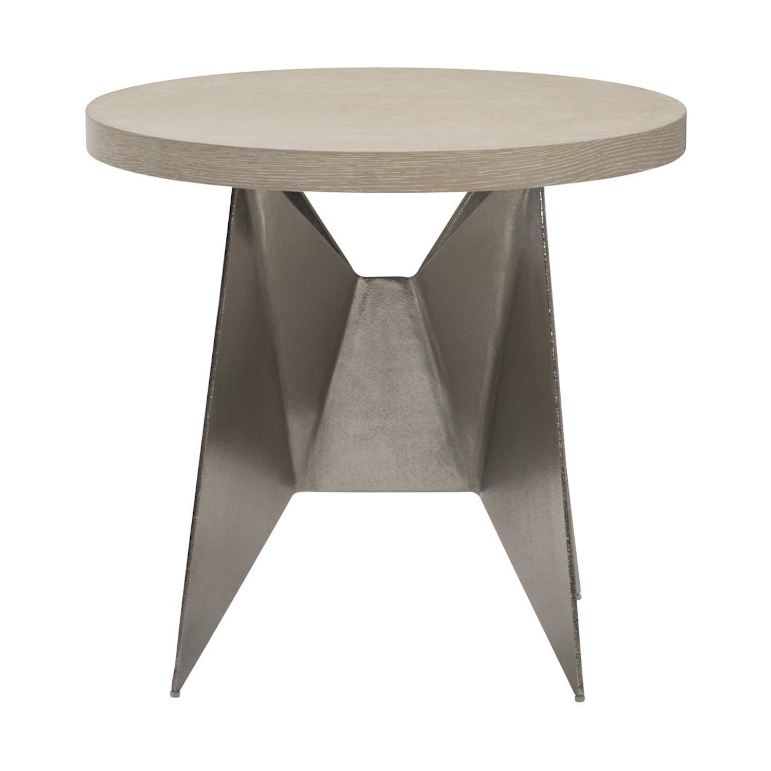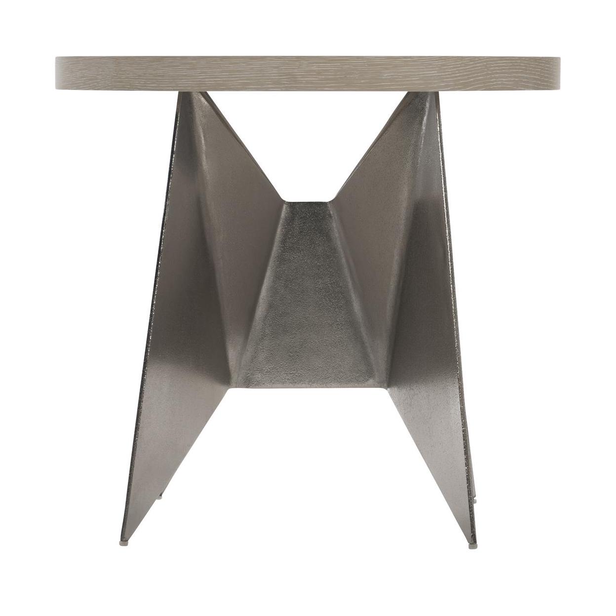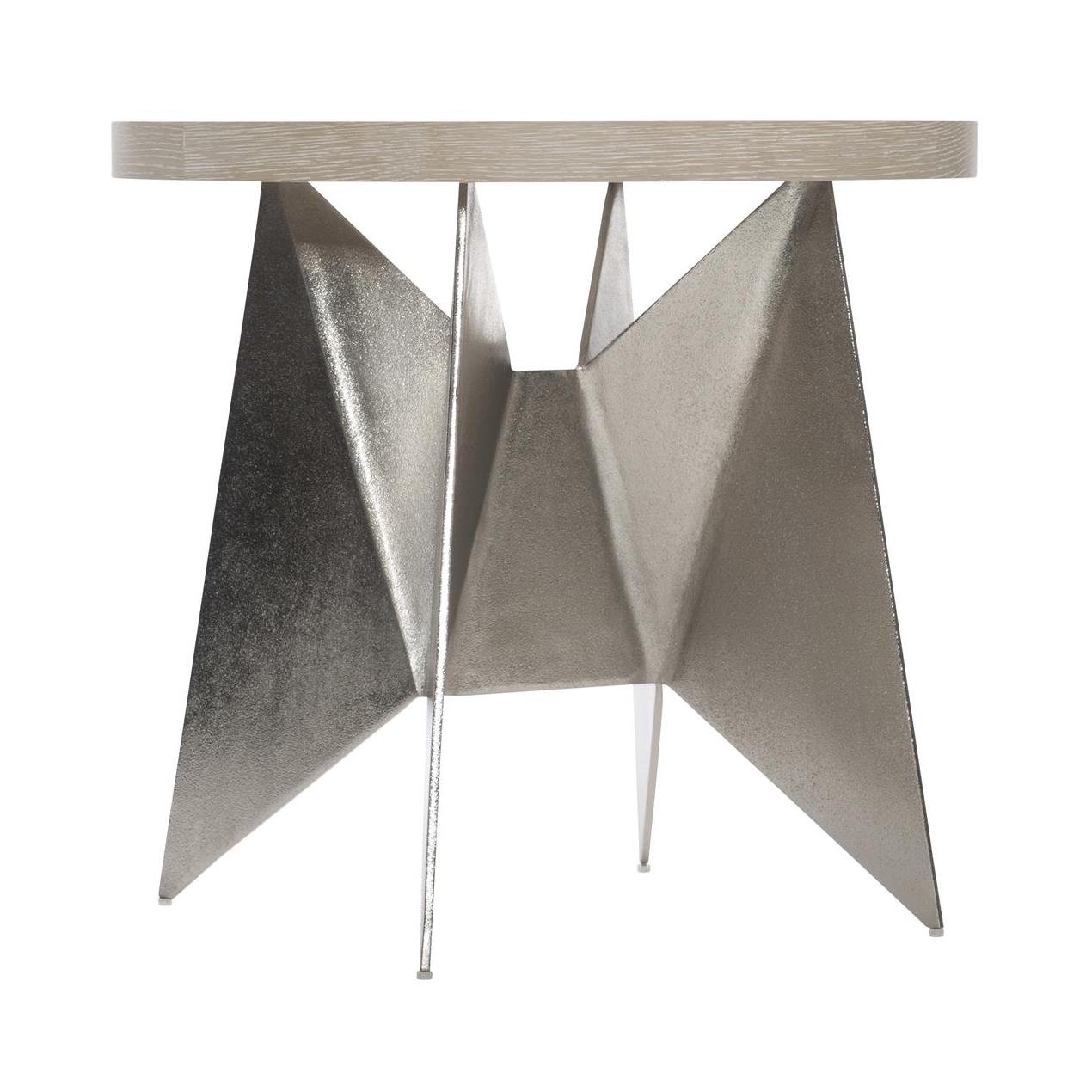 Table d’appoint ronde avec finition Dune sur le plateau en bois avec base géométrique en fonte d’aluminium en finition Nickel brillant