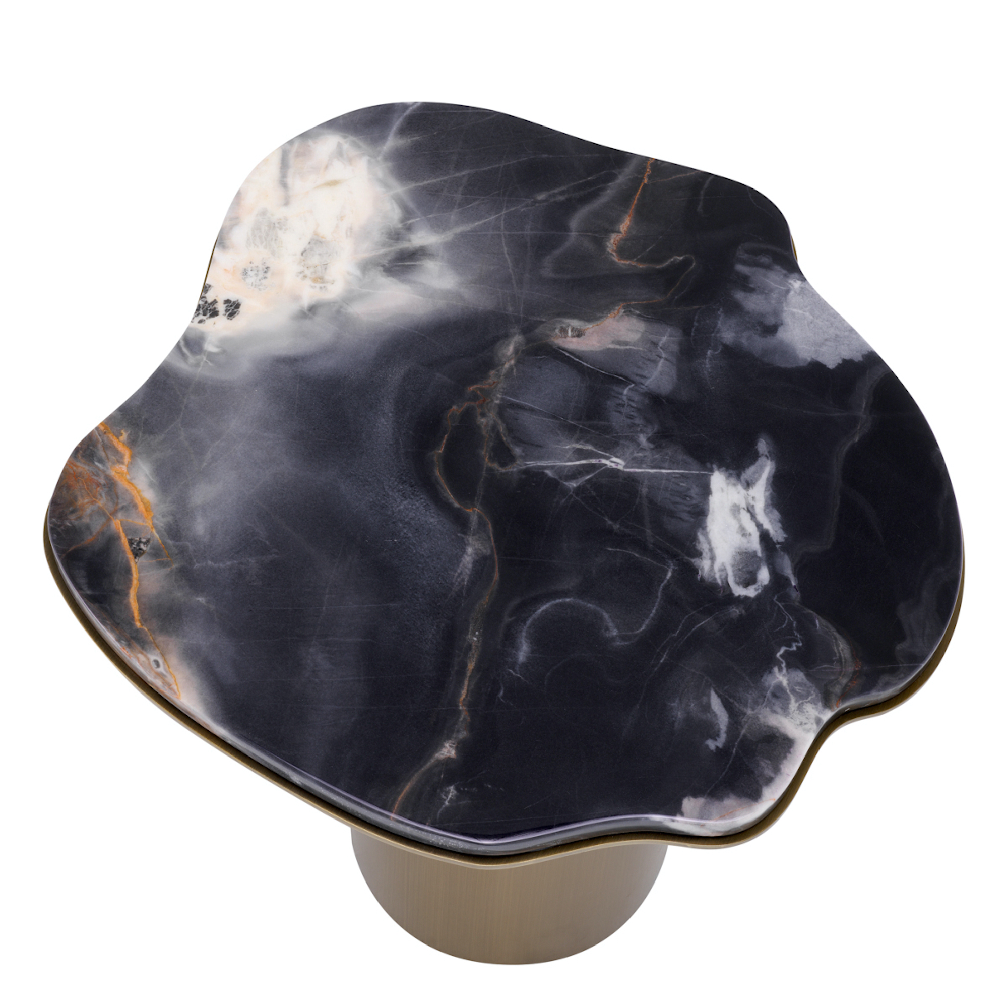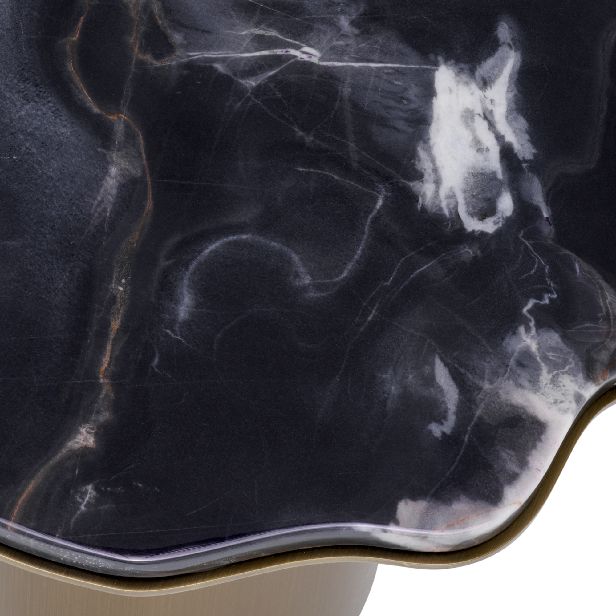 Plongez dans l’ambiance somptueuse que la table d’appoint Shapiro apporte à votre espace de vie. Sa présence captivante émane du luxe et de la sophistication, mettant en valeur un remarquable plateau de marbre qui danse gracieusement avec ses motifs et ses veines uniques. La forme libre ajoute un élément d’expression artistique, ce qui en fait une extraordinaire pièce d’art fonctionnelle. La finition en laiton brossé de la base est d’une grande opulence et s’harmonise parfaitement avec l’allure du marbre.