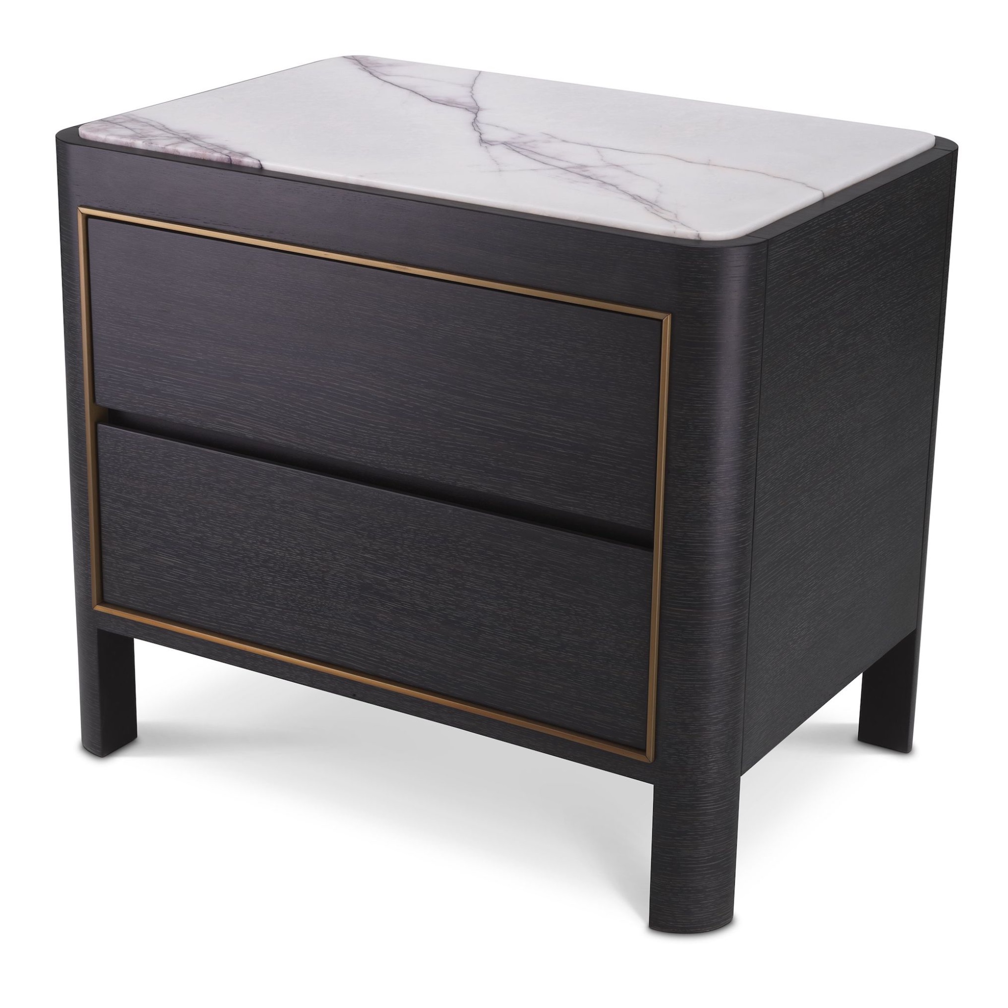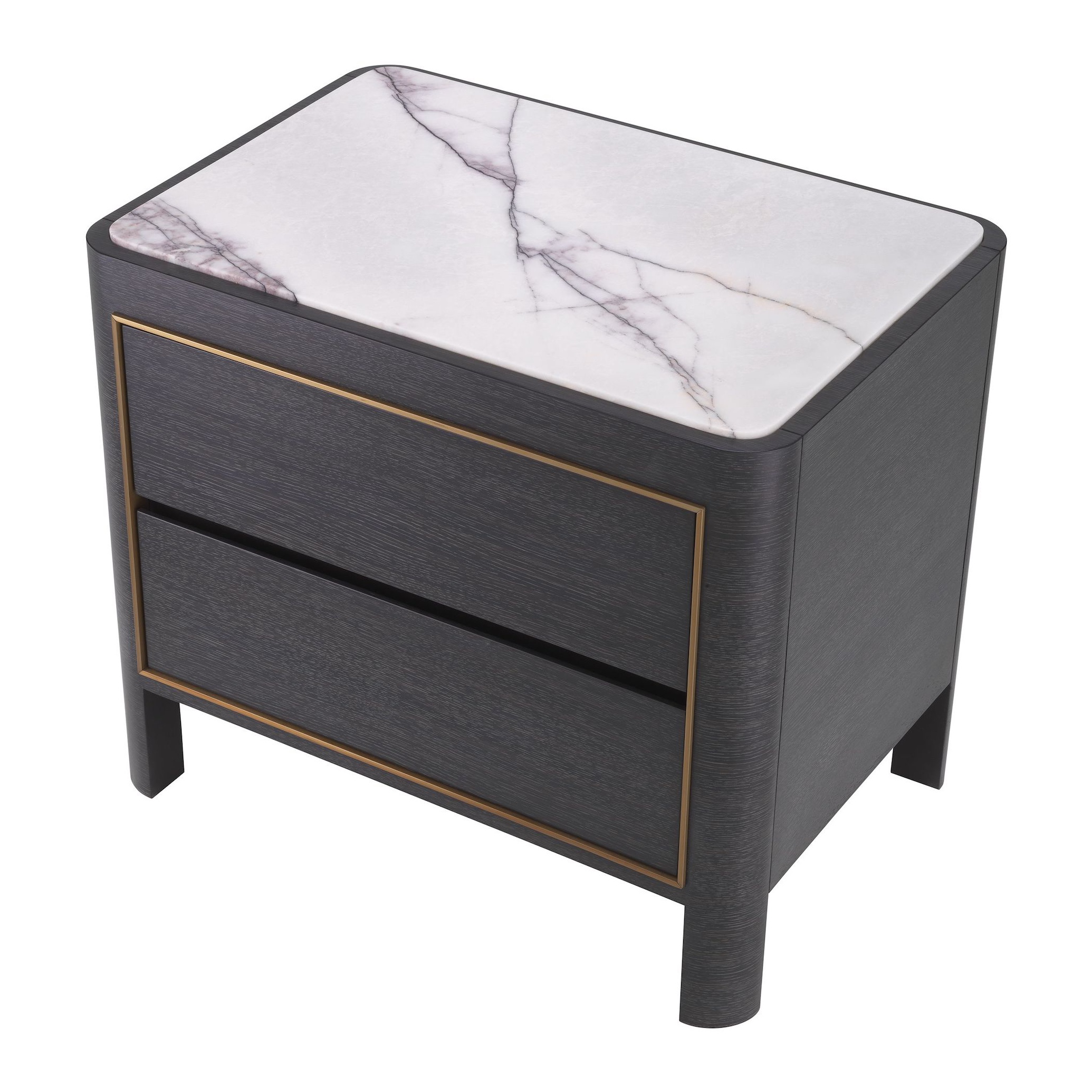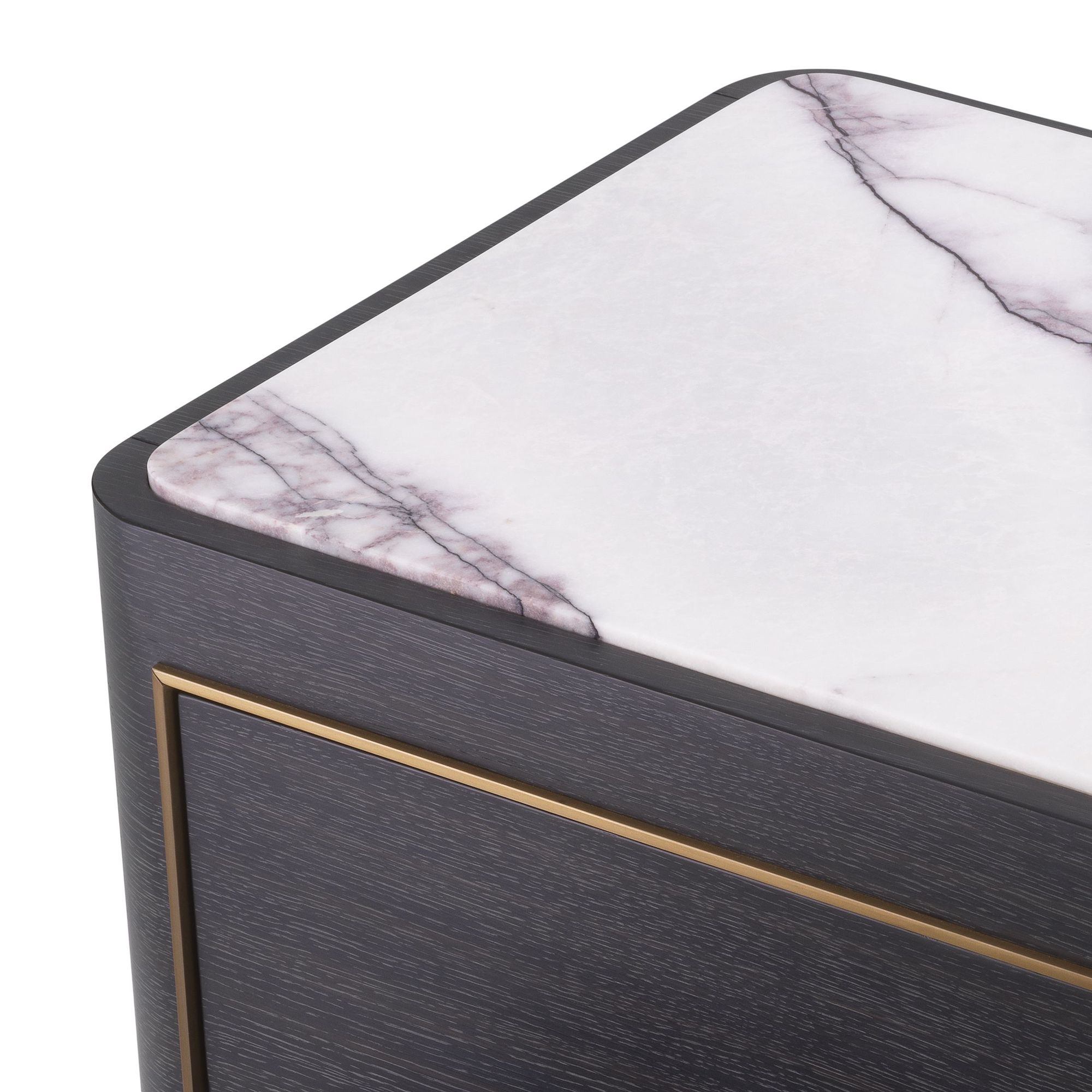 Corazon est une table de nuit chic et organisée. Avec son revêtement en placage de chêne gris anthracite et son plateau en marbre italien bianco lilas, cette belle pièce rehaussera le style de votre chambre à coucher. Les tiroirs sont agrémentés d’un rebord en laiton brossé et offrent un vaste espace de rangement pour les livres, les accessoires de téléphone et autres.