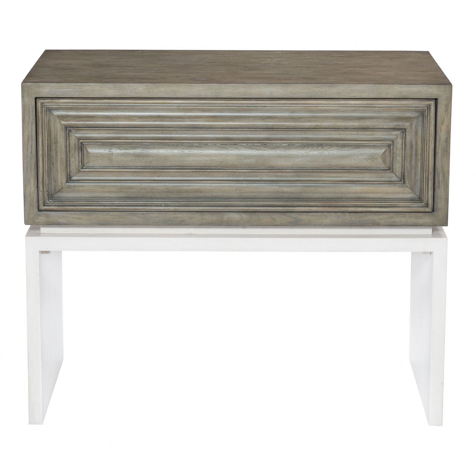 Finition deux tons avec le fini Rustic Gray sur le caisson et tiroir et le fini White Plaster sur la base.