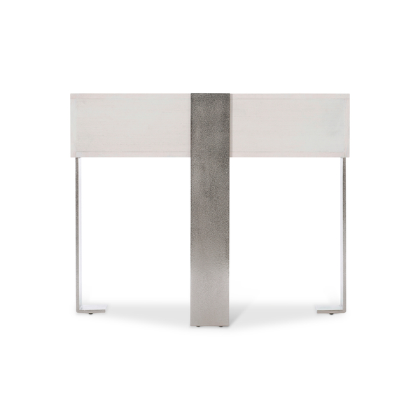 Trois supports en aluminium coulé forment un trépied structurel, se courbant jusqu’au sol pour définir les pieds de la table de nuit Solaria.