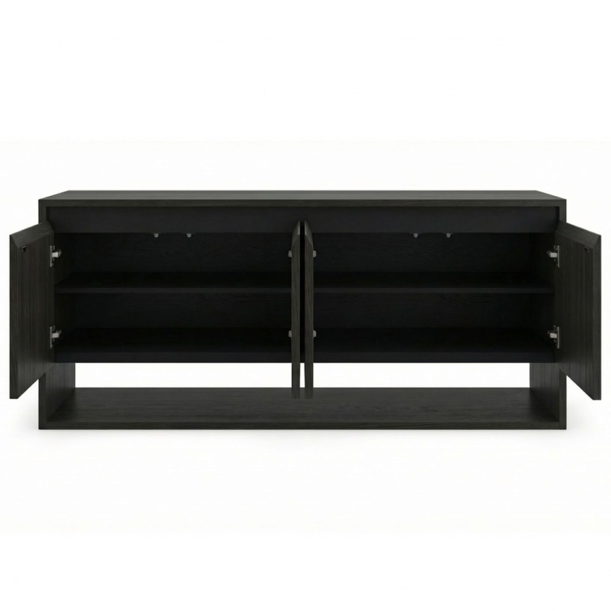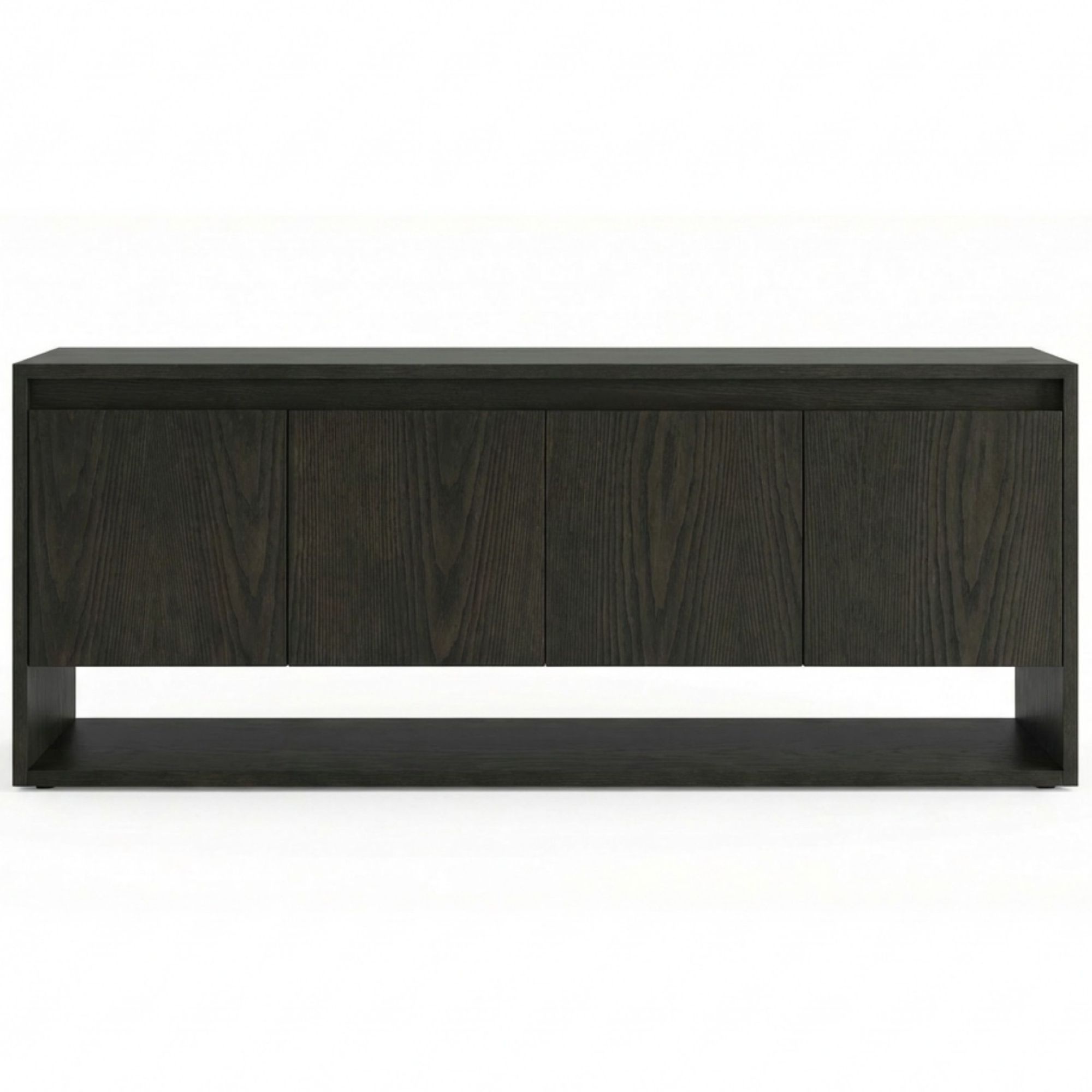 Credenza in solid brown ash wood shown in finish Stormy with Ebony trim. Four push to open doors with one adjustable shelf behind each pair of doors. Various wood types, finishes and custom sizes available.