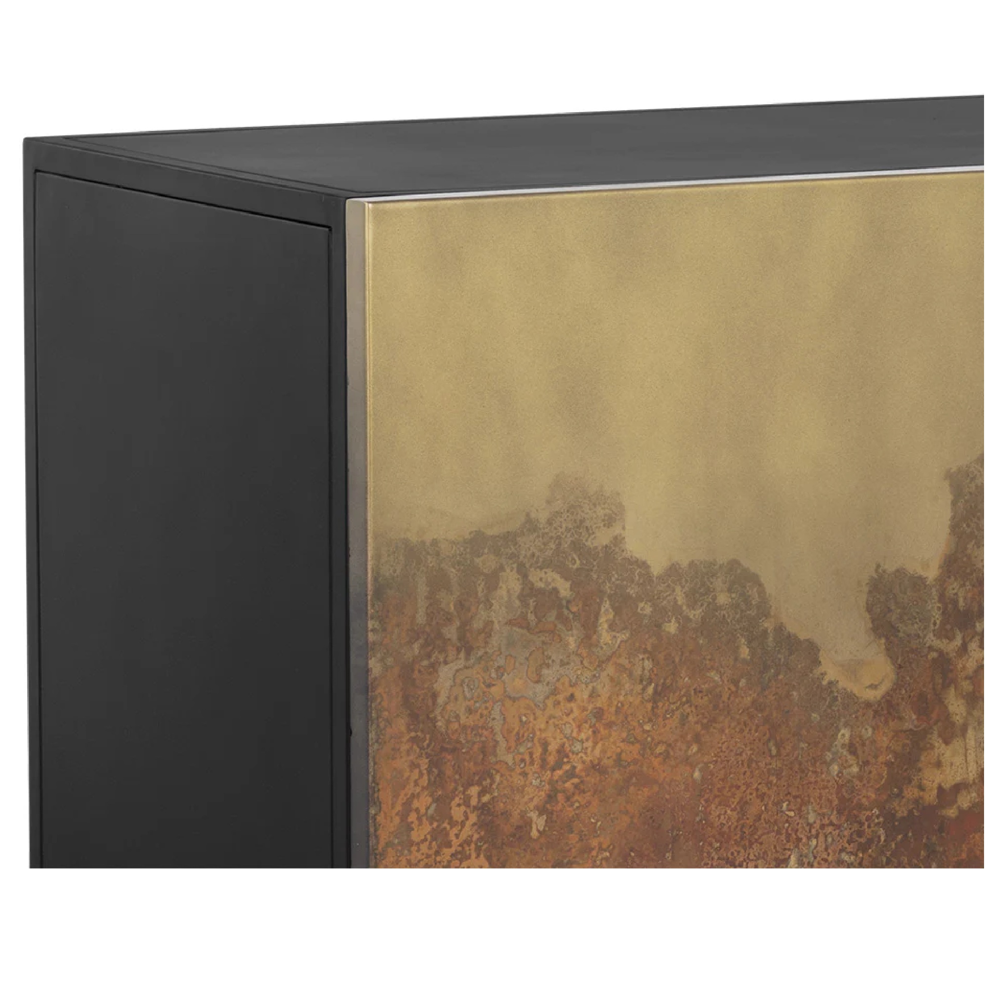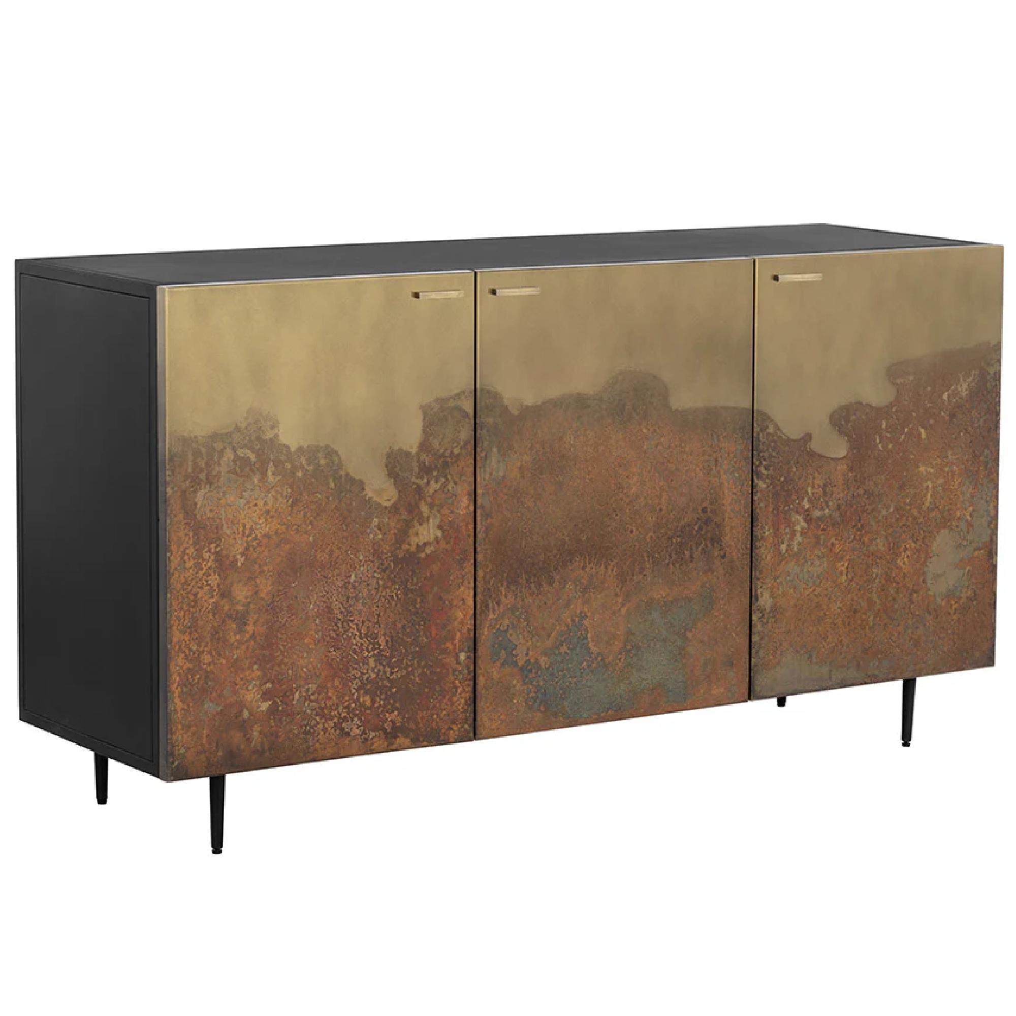 Inspired by global travels, this unique sideboard exudes a exotic vibrance. Features three cabinets with antique brass ombre patina fronts. Completed with a black metal frame. Pairs well with the Auburn media console and cabinet. Made in India. With refined craftsmanship, this design was brought to life by skilled local artisans. By nature, these materials develop unique imperfections such as markings and colour variations for a truly one-of-a-kind piece.
