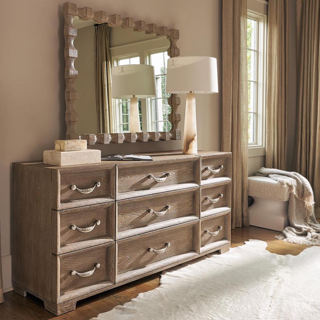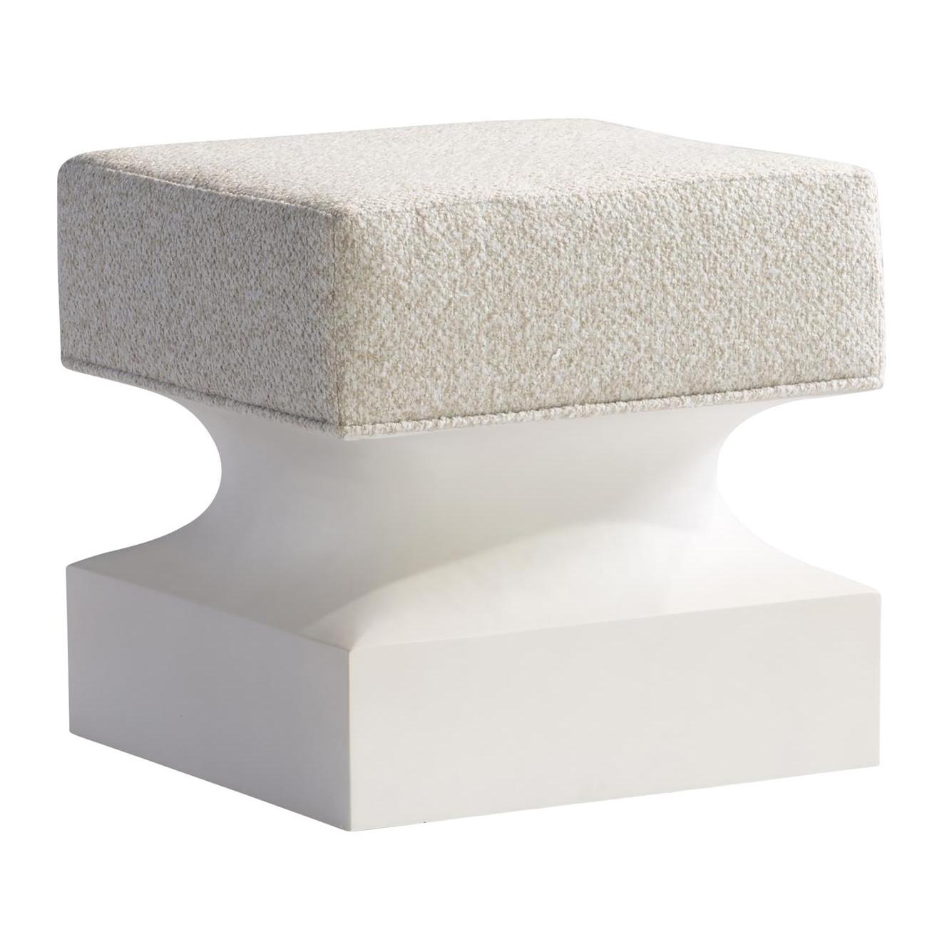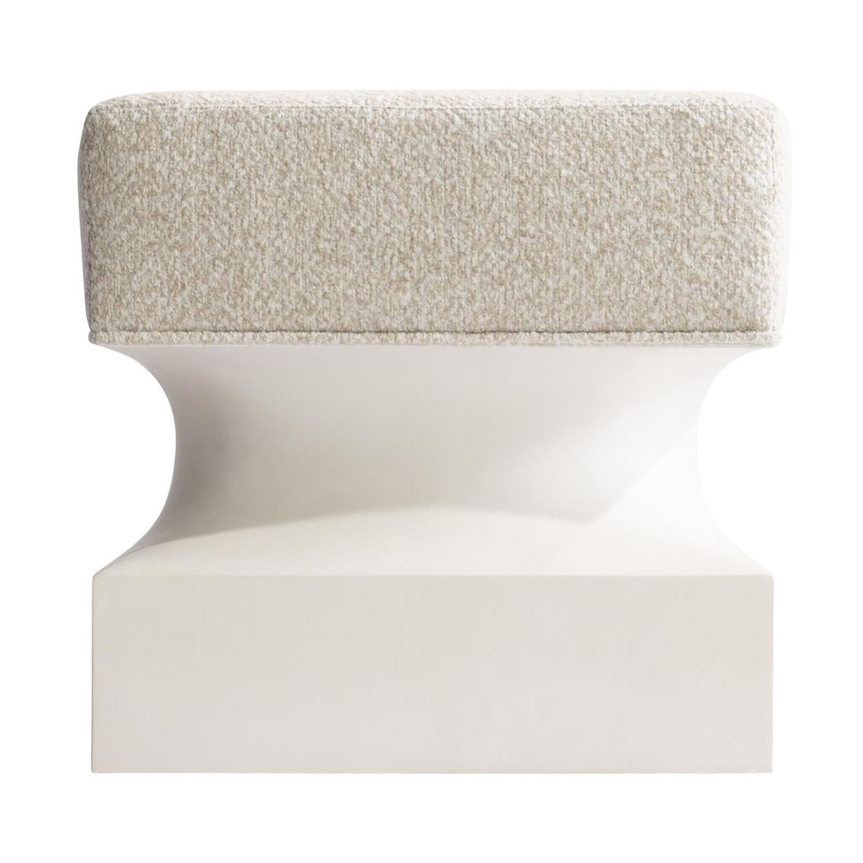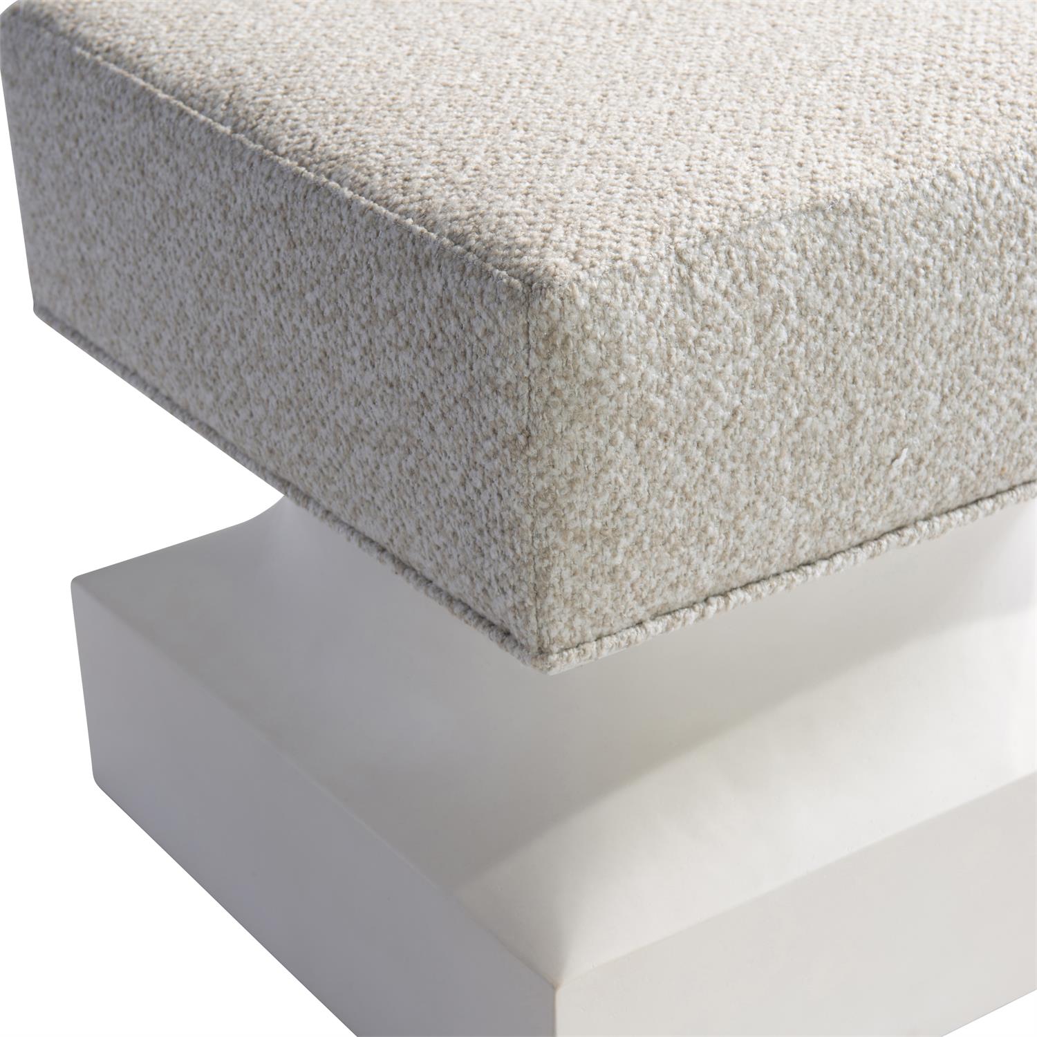The Aventura bench has a sculptural form that’s counterbalanced by a soft upholstered seat. The cast resin base in a Tusk faux stone finish has concave shaping on the sides and a square bottom. It’s a sophisticated look with casually clean lines.