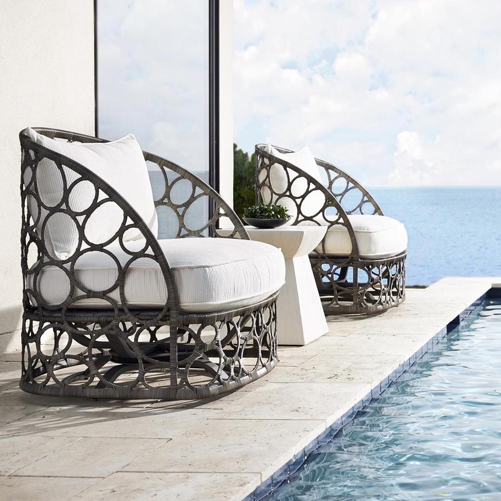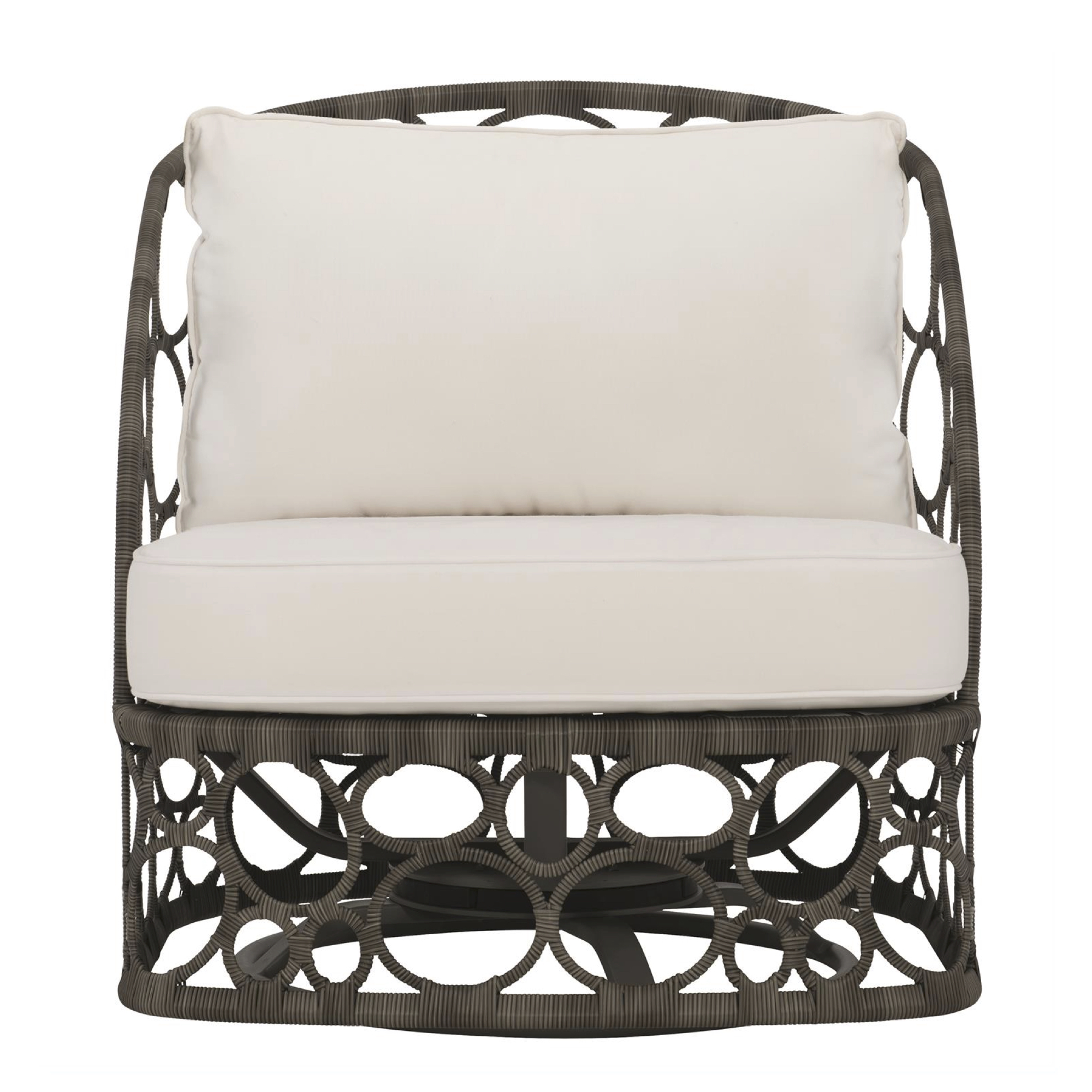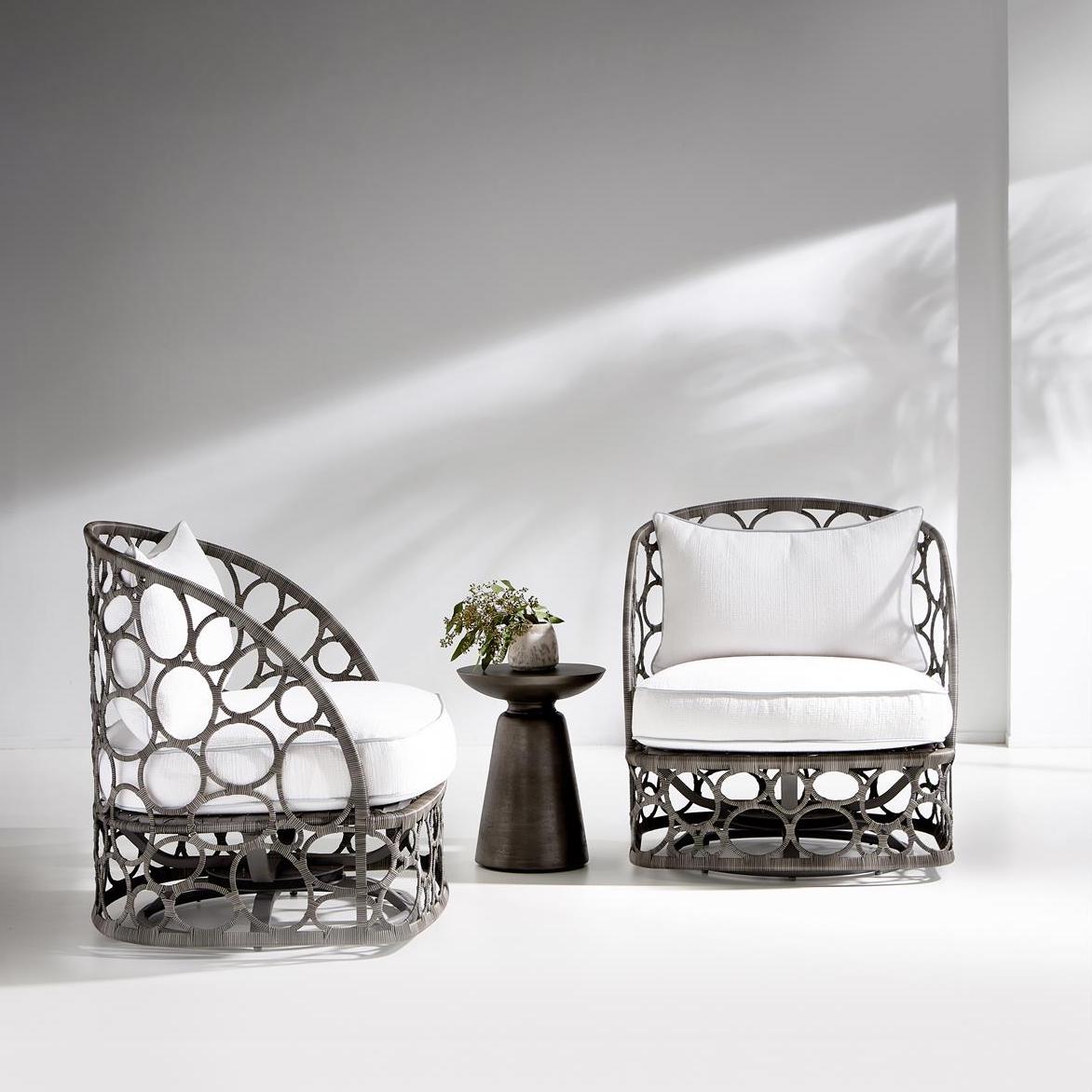 The Bali outdoor swivel chair is a masterpiece of expert craftsmanship and stunning design evoking the tropics. Its plush cushion and back pillow are nestled within a base and back constructed of split cane All-Weather Wicker featuring a circle-filled pattern. The aluminum swivel mechanism is discreetly concealed within the base.