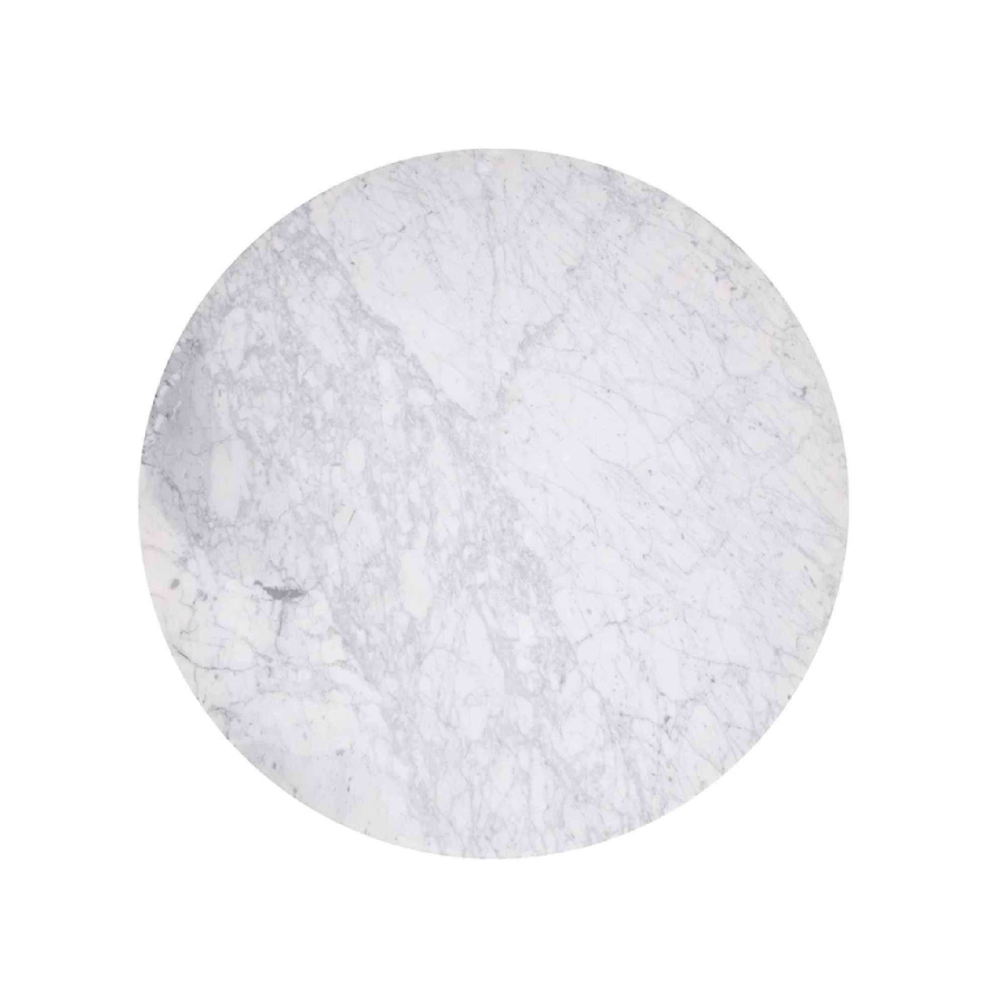 Matte white Carrara marble top and sculptural base made from a polyurethane mould in a powder-coated finish.
