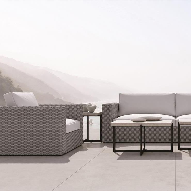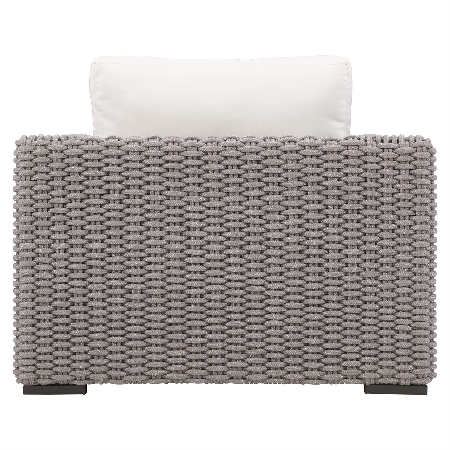 This outdoor collection is characterized by exceptional luxury, ultimate comfort and stylish design. Suitable for indoor and outdoor use, the Capri chair features a modern, low-profile frame crafted from woven rope in a Gray Mist finish. Track arms and aluminum block feet contribute to the contemporary look, while the rope lends a natural, relaxed feel. The fiber back pillow and plush cushion are designed for luxurious comfort and maximum water resistant.