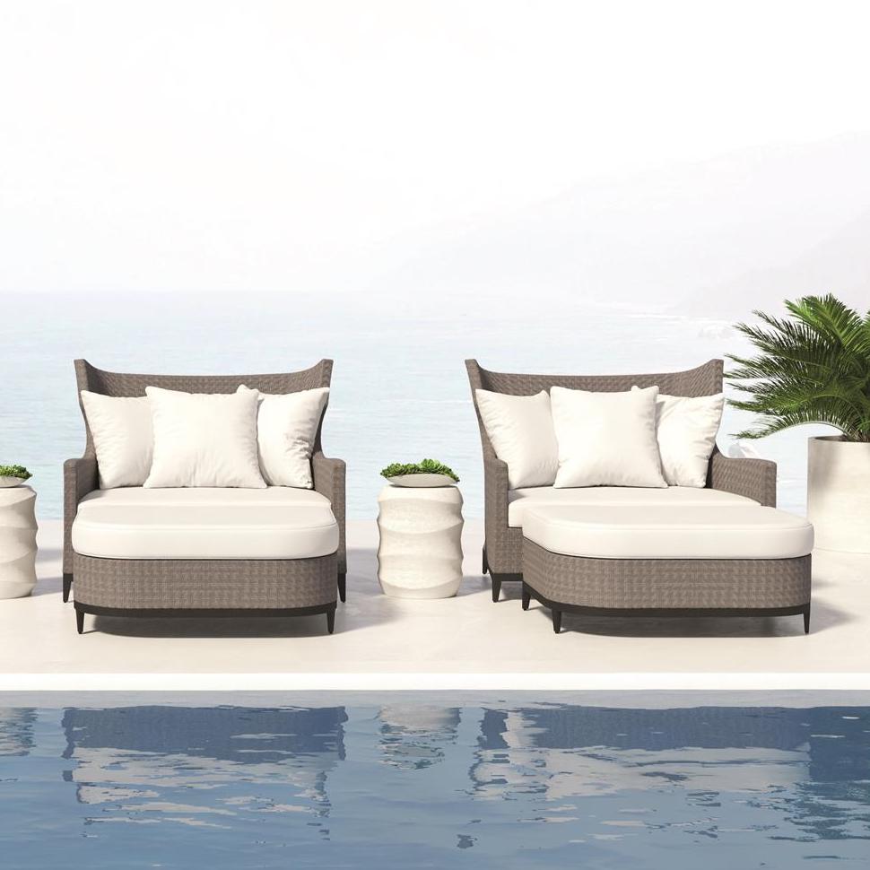 The extra-wide Captiva chair offers a sophisticated spin on a classic wingback design. Expertly crafted from Endura wicker in a herringbone weave, it features a quick-dry foam cushion and fiber back pillows perfect for relaxation on a summer’s day. Finished in Pewter Gray, the power-coated aluminum frame features tapered legs to round out this modern look.