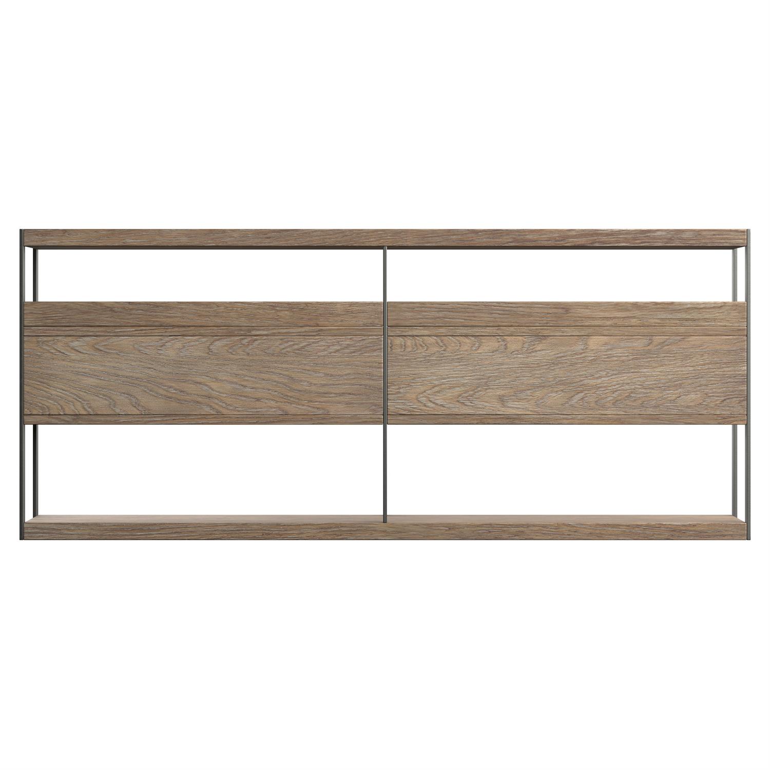 Understated tactile materials craft an original design with the Casa Paros console table. Two extendable, sliding trays and two drawers float within a metal frame. The top and base offer two more wood shelves, all in Playa finish. Cast metal hardware complements the organic and rustic styling.