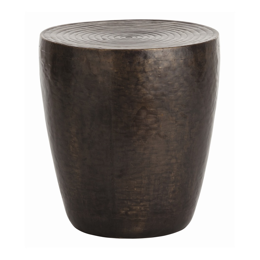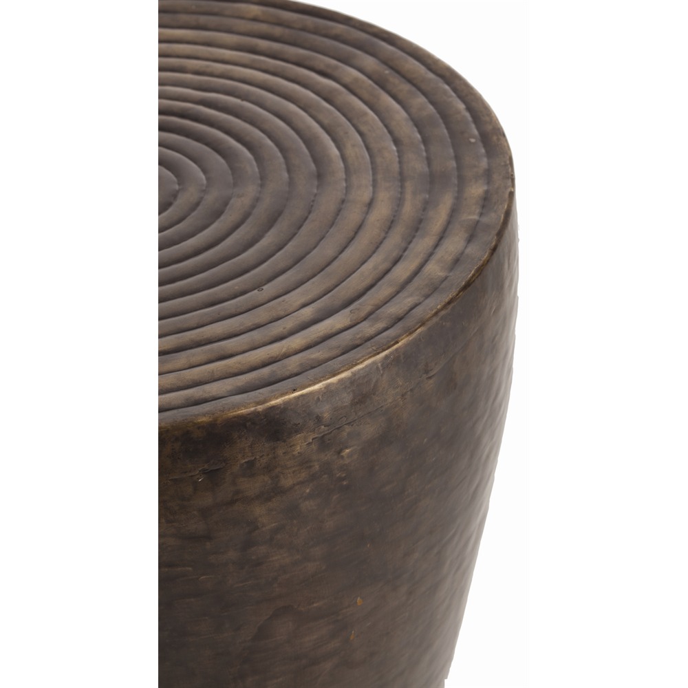 This iron drum shaped side table features an antique bronze finish and repousse ringed detail on the top surface.
