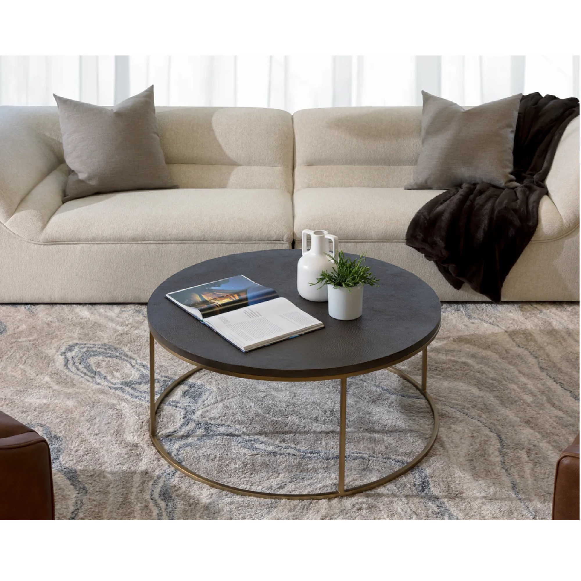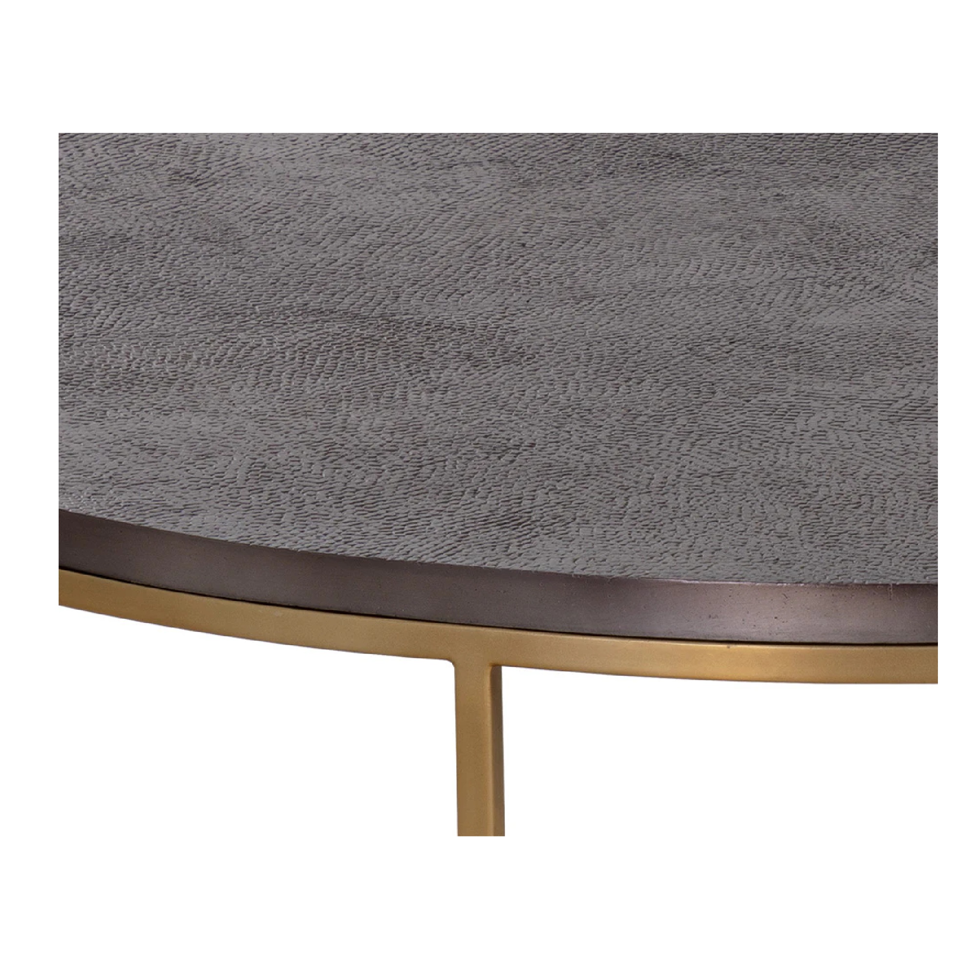A round cocktail table that takes influence from global travels. Features a bronzed gunmetal aluminum tabletop with a textured finish on the top. Completed with a brass stainless steel frame. Made in India. With refined craftsmanship, this design was brought to life by skilled local artisans. Due to the nature of handcraftsmanship, unique imperfections such as fissures, markings and variations in colour and shape are welcomed and appreciated characteristics for a truly one-of-a-kind piece.