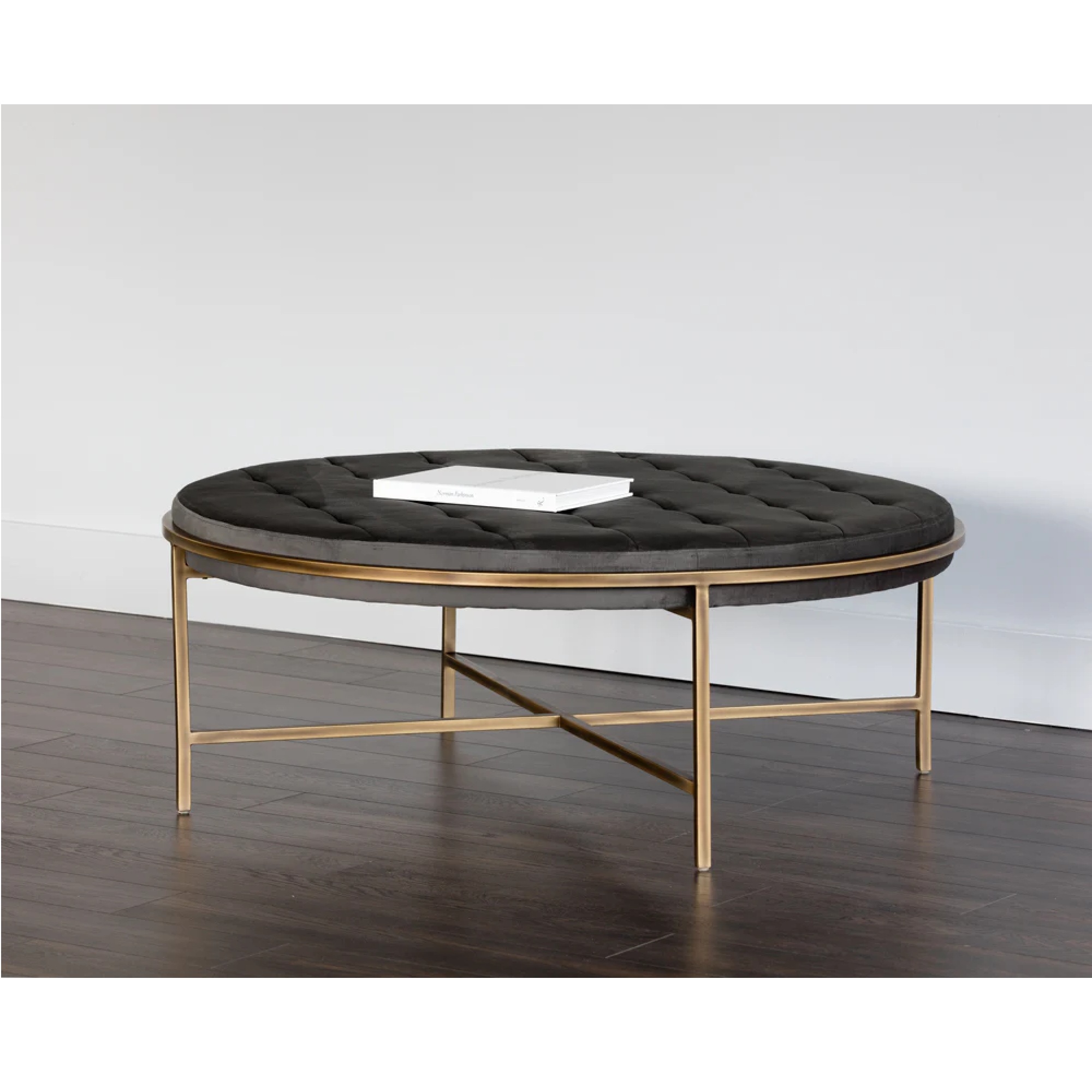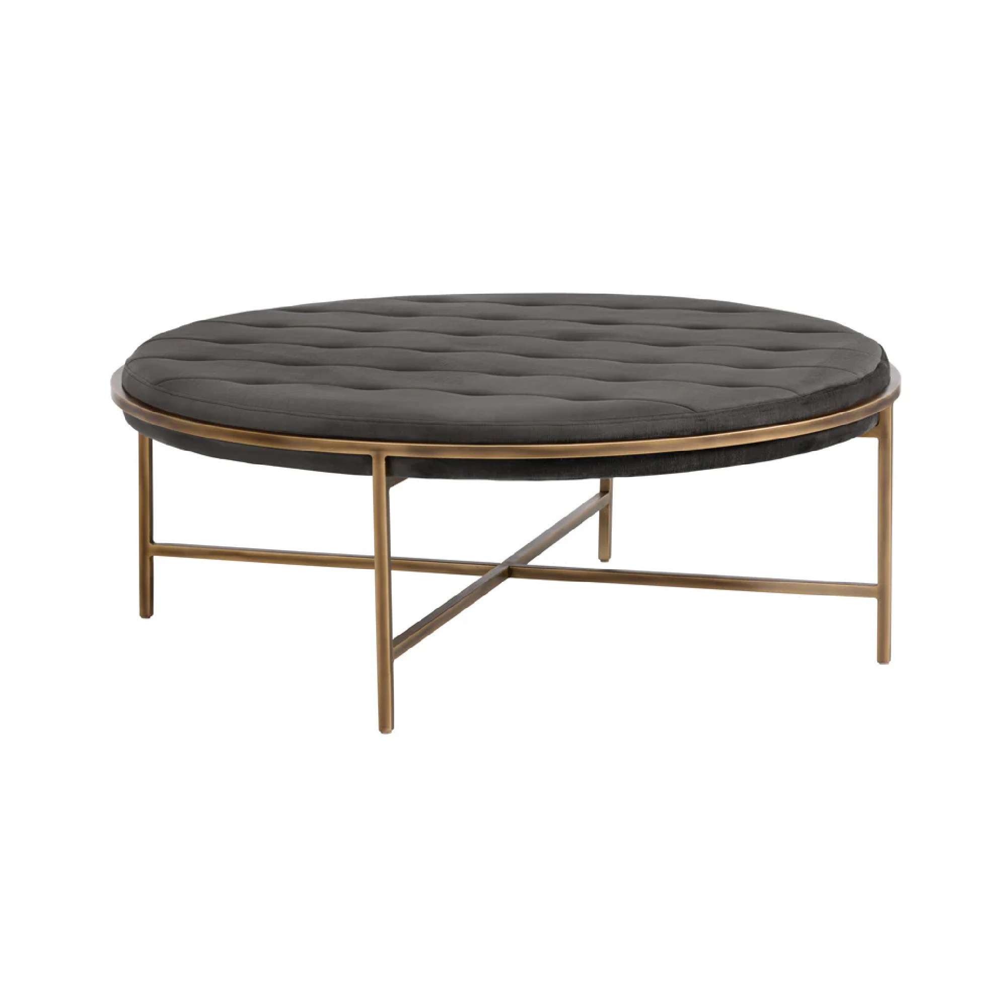 This large round ottoman exudes transitional flair. Stocked in our soft piccolo pebble performance fabric with a rustic bronze steel frame. Can be used as a coffee table or as extra seating in residential and commercial spaces. Performance fabric is moisture repellent, durable and easy to clean.