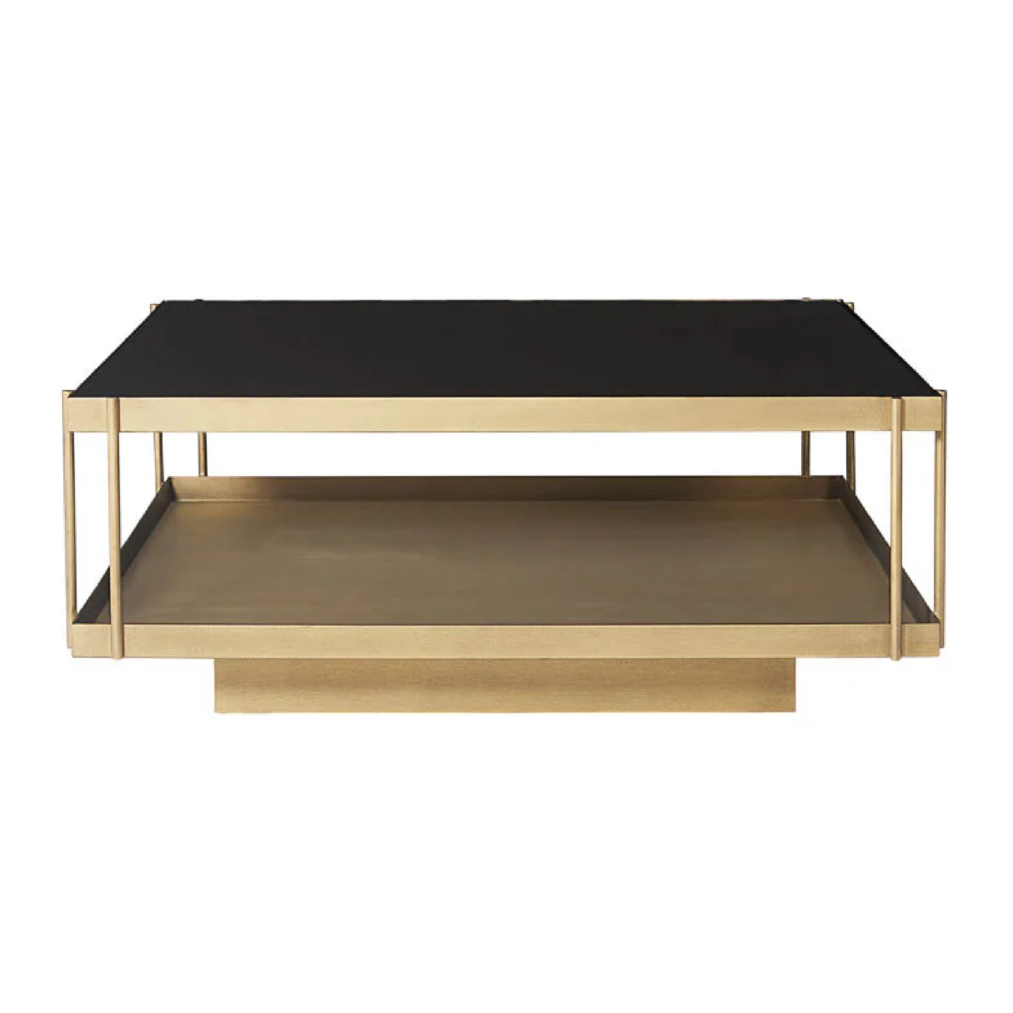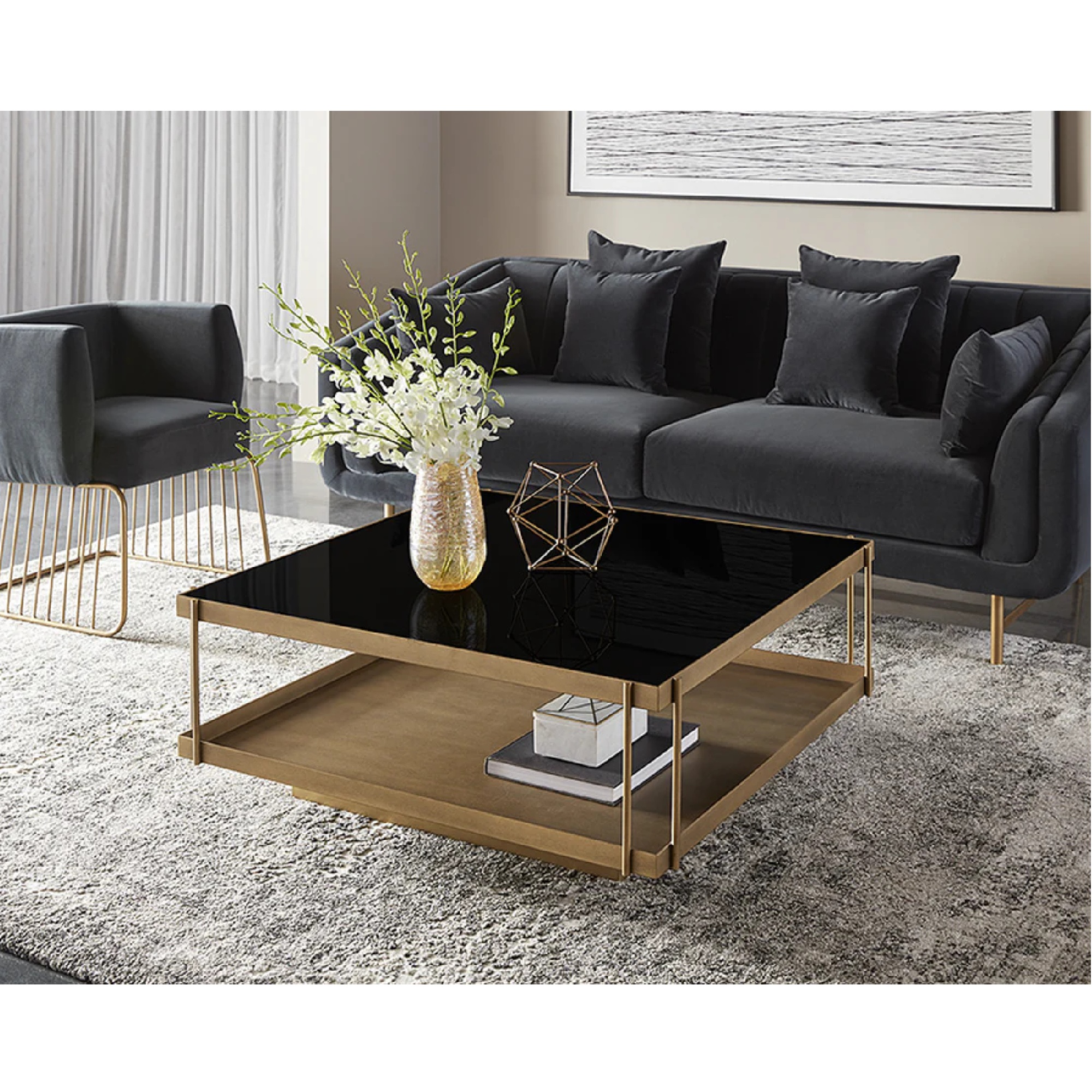This large square coffee table combines mid-century style with an elevated flair. Designed with a stunning black glass top and exposed antique brass shelf, this coffee table will draw attention in any living and lounge space.