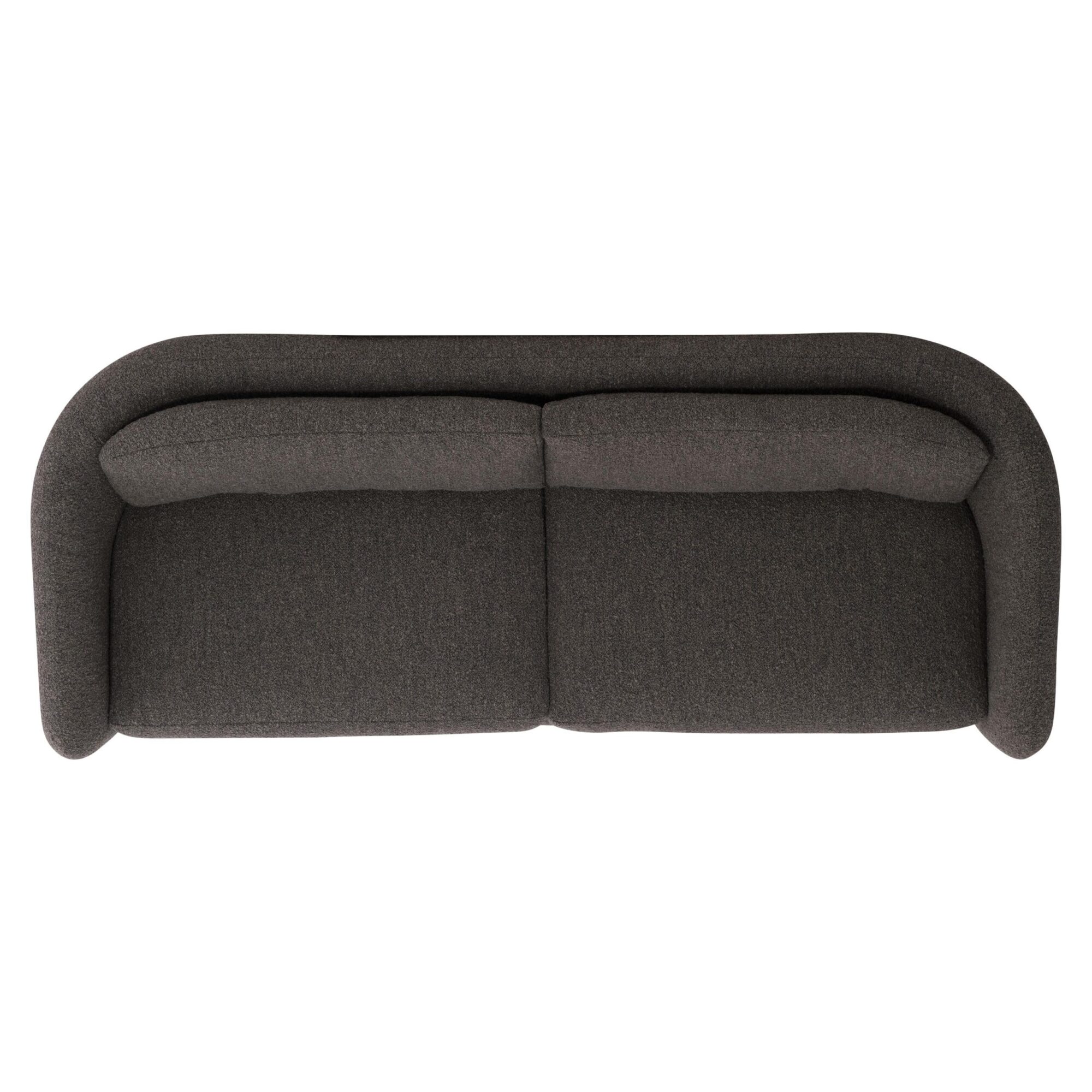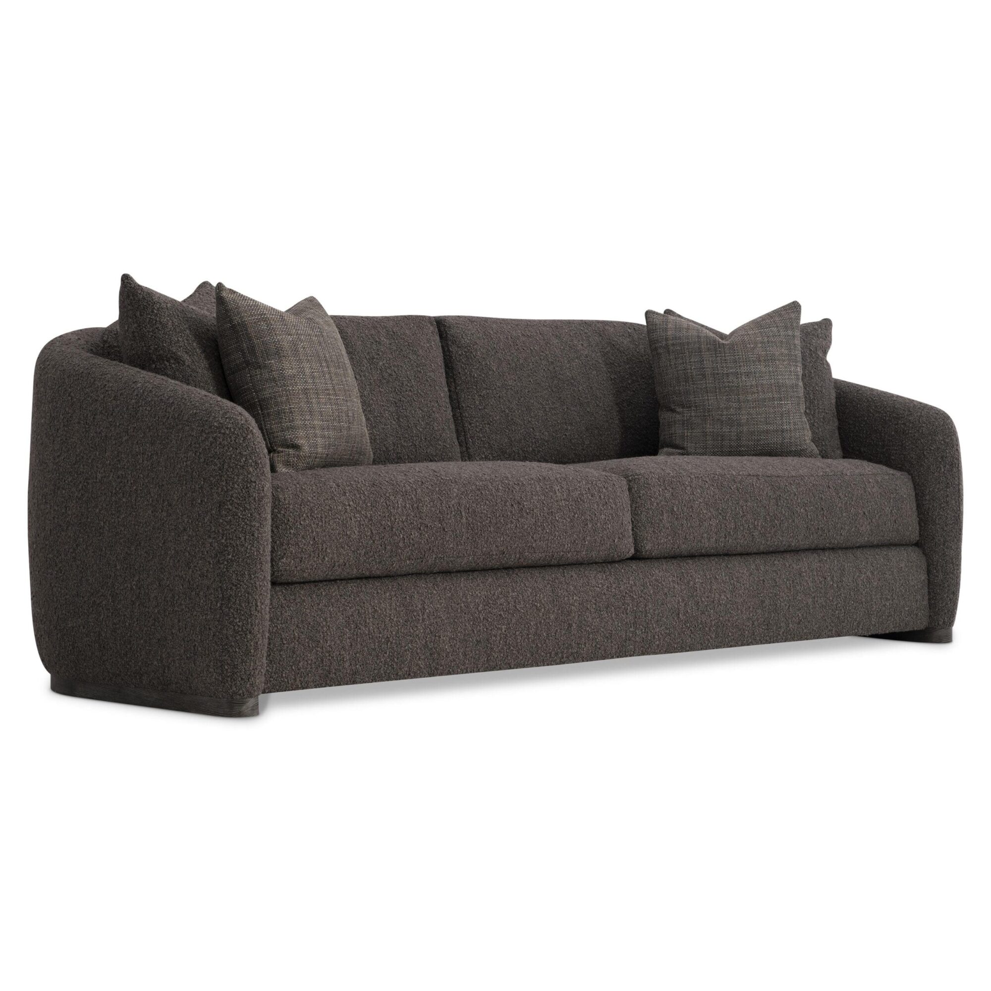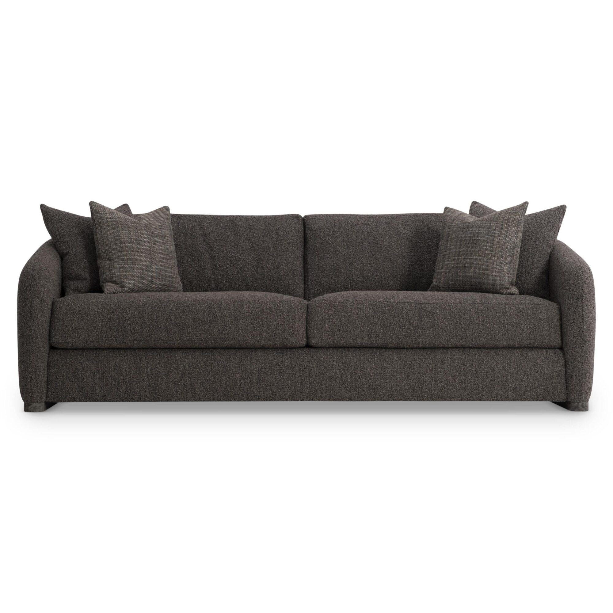 A shelter style sofa embraces both comfort and modern design. Shown in fabric 1711-100 and Tadon cerused wood finish. Available in selection of fabrics and wood finishes. Available with or without 4 throw pillows.