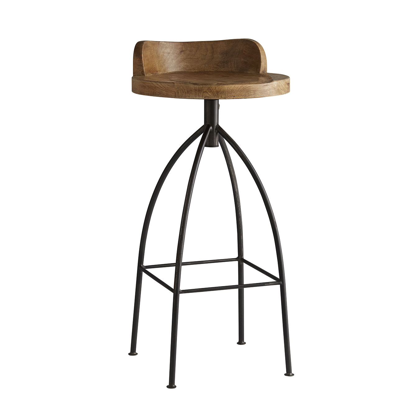 Rustic bar stool features sandblast antique waxed wooden swivel seat and natural iron base. Seat height is fixed. Due to the artisan nature of this piece the seat height and support bar may vary up to 1″ from the dimension listed.