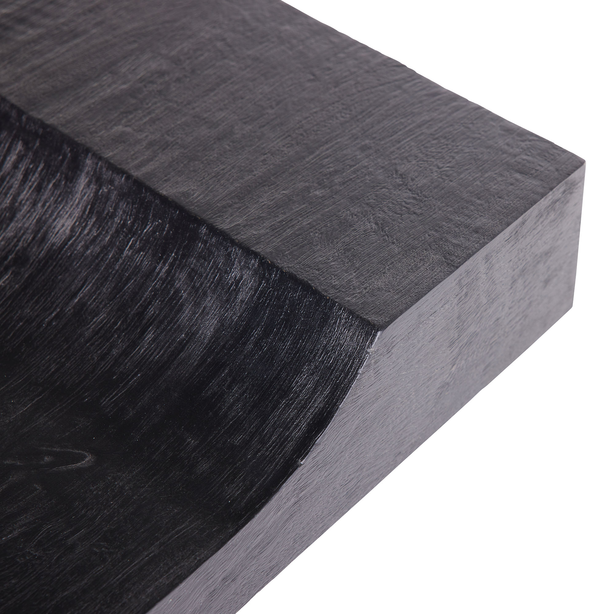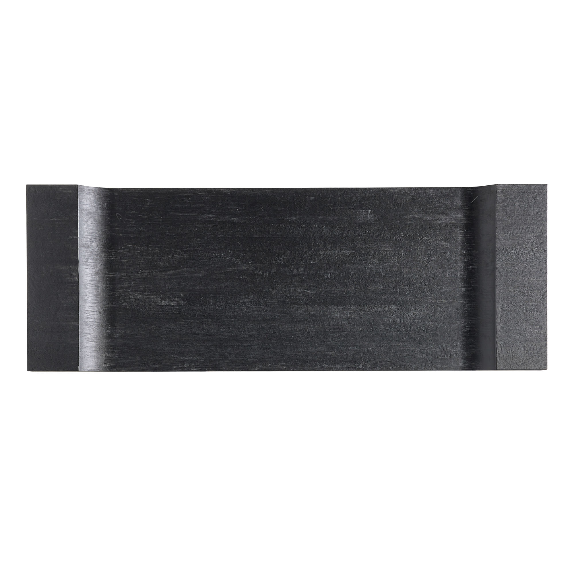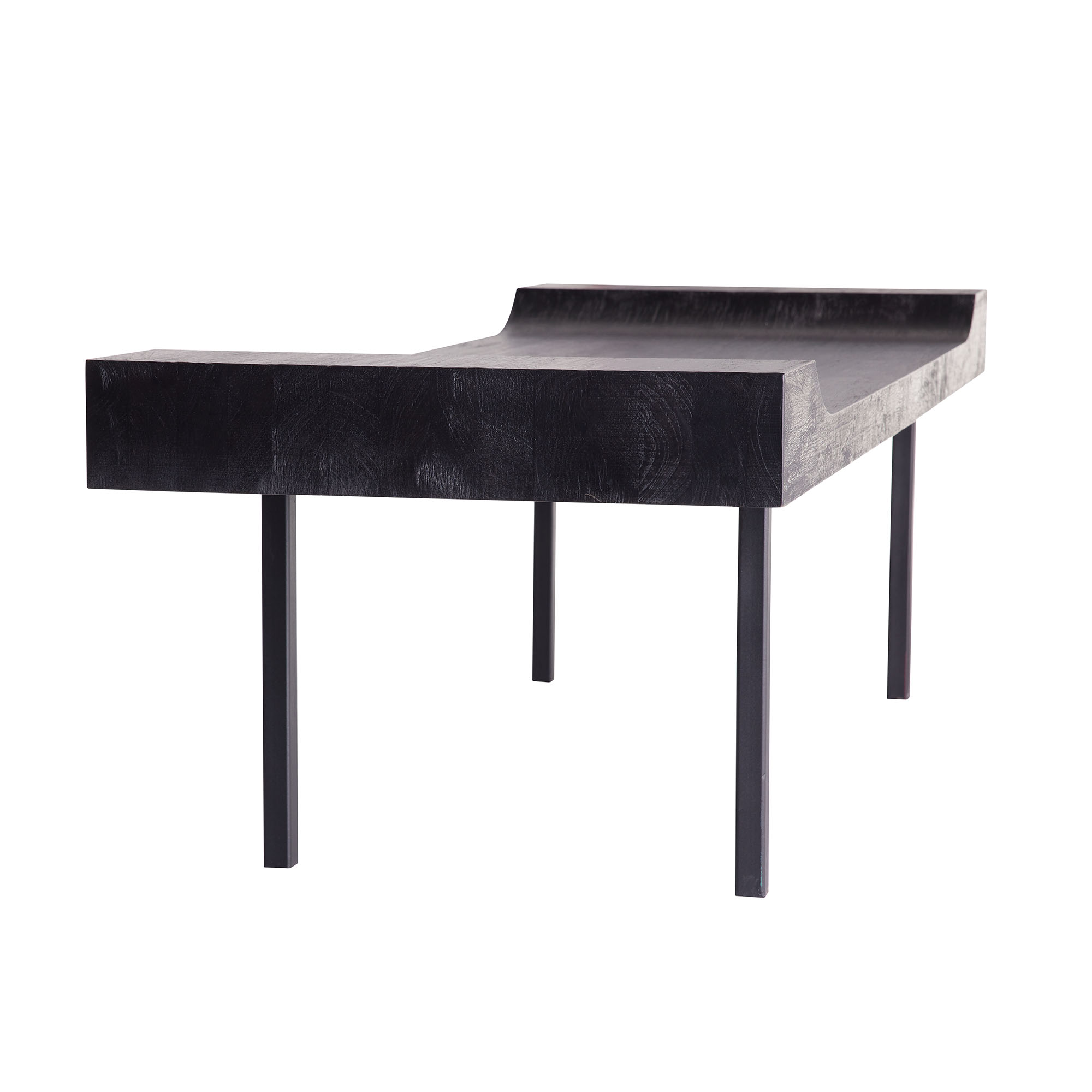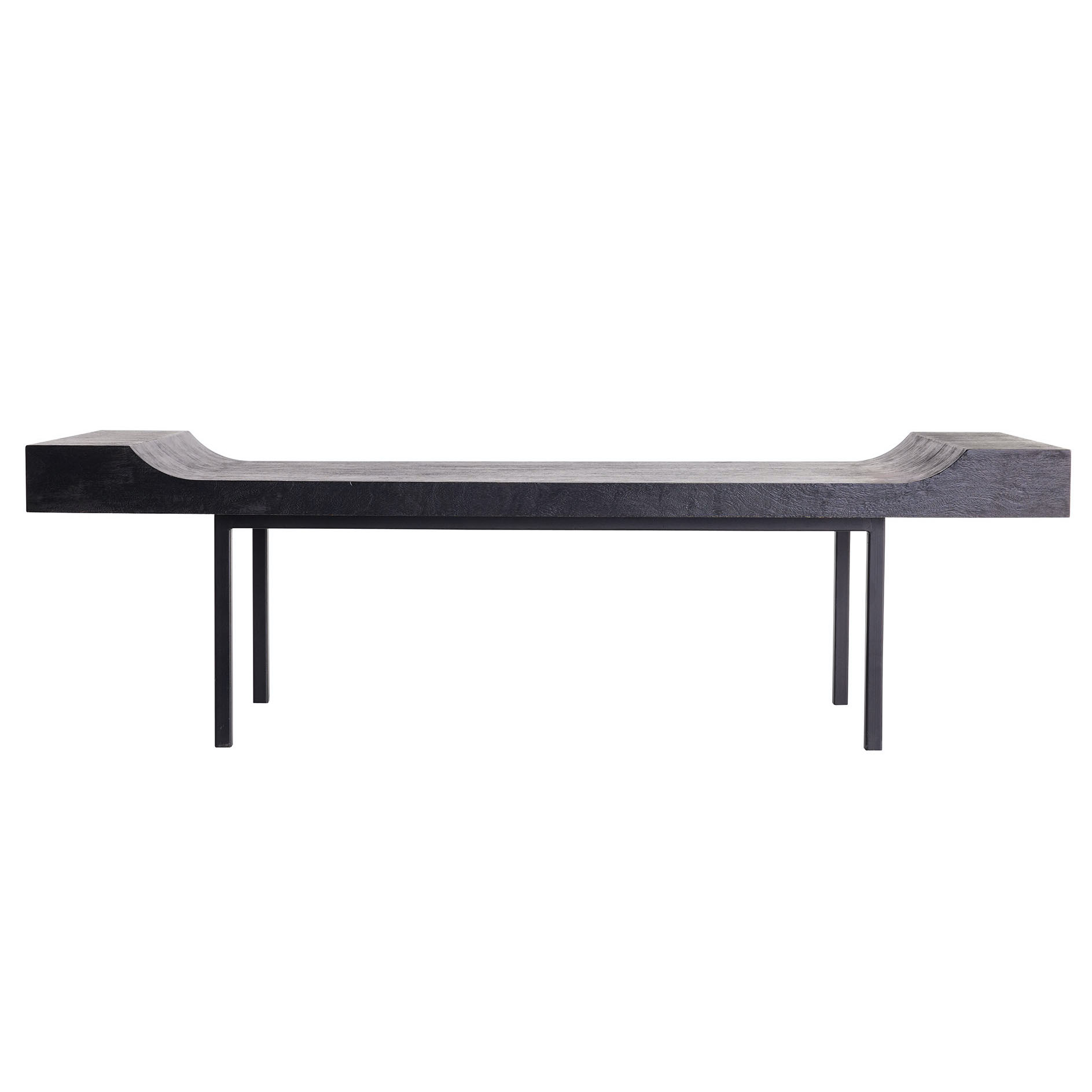 With its sophisticated form, this bench delivers an austere beauty. The cutout-shaped silhouette of the bench seat creates a visually impactful element over a sleek blackened iron base. Black finished teak wood fea- tures a heavy wire brushing that adds extra texture and highlights the natural wood grain. Wood will vary.