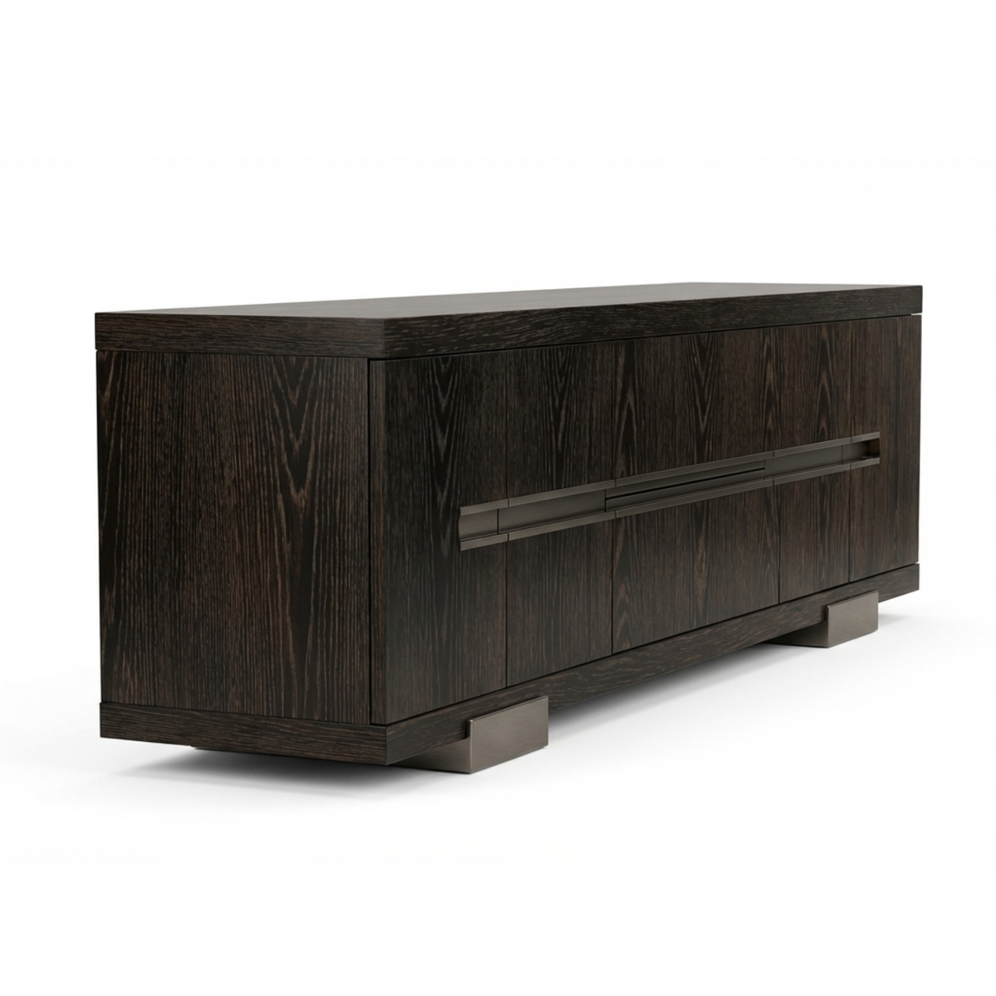 Credenza in solid brown ash wood shown in finish Stormy. Two center drawers and four soft close doors with one adjustable shelf behind each pair of doors. Recessed channel door pulls and bases in Mottled Pewter finish. Various wood types, finishes and custom sizes available.