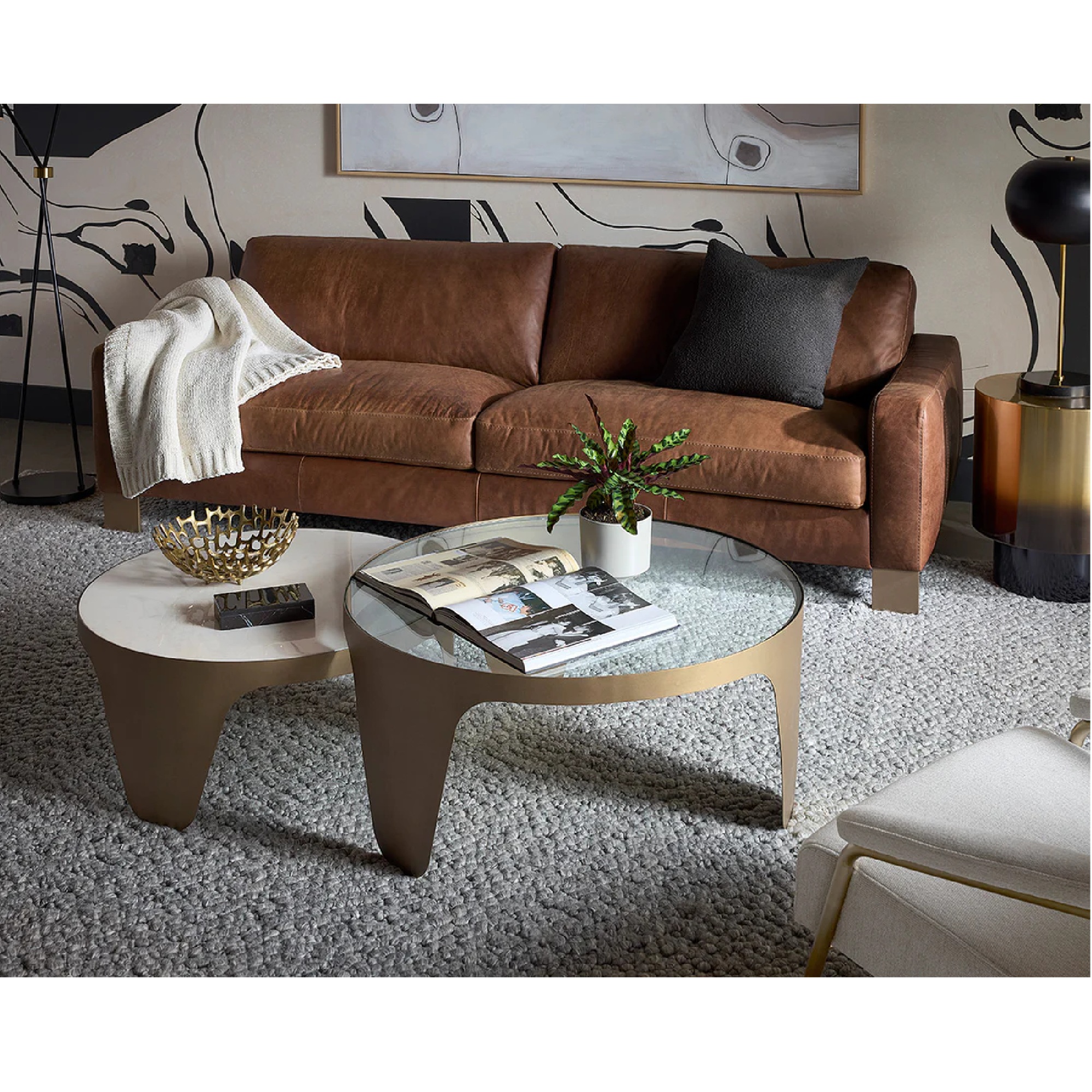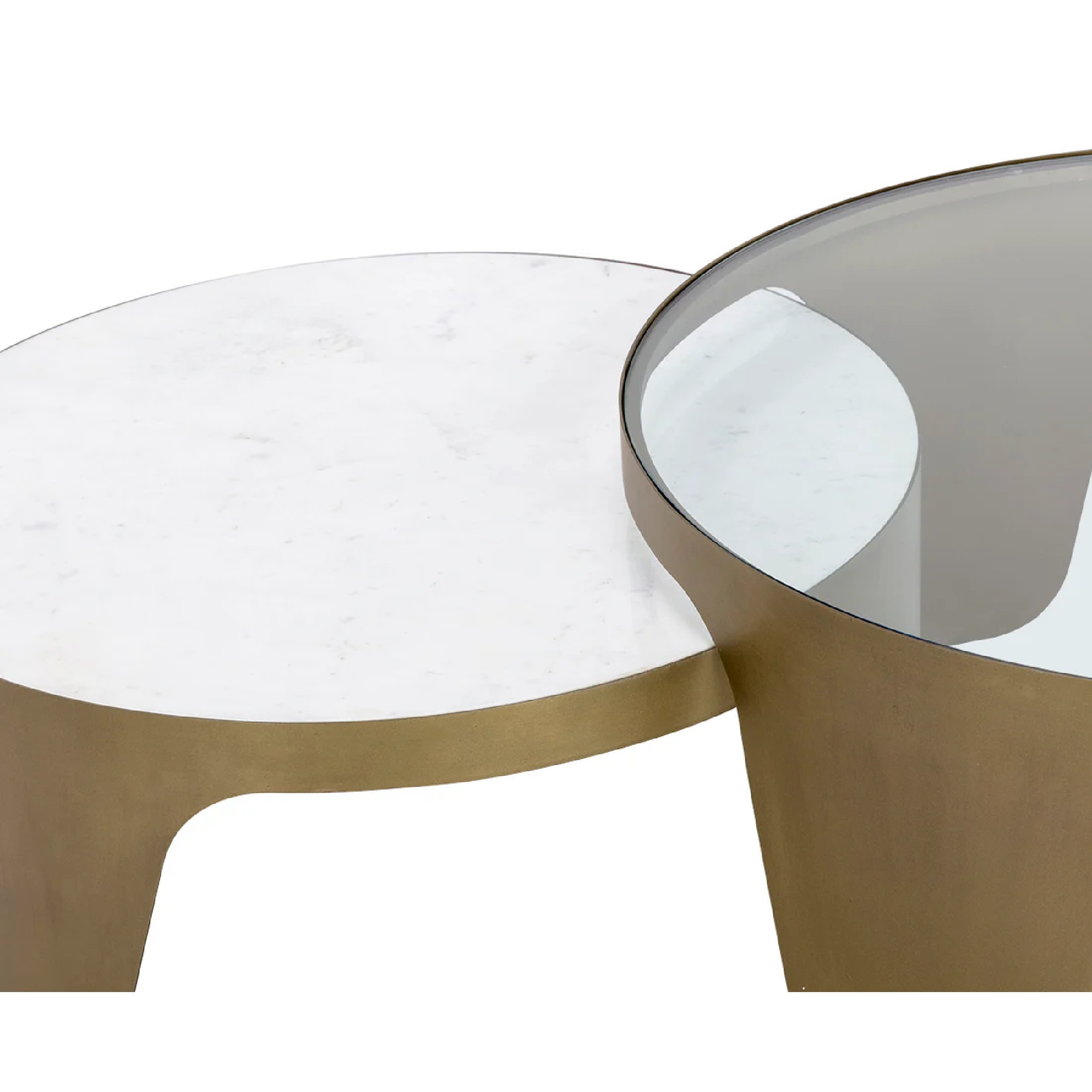 Make a statement with the modern and sculptural design of the Mysaria Nesting Cocktail Tables. Features one clear glass top and one white marble top. Finished with an antique brass iron base. As marble is a natural material, unique veining, pitting, fissures, micro-cracks and colour variations are all characteristics that add to the uniqueness and beauty of each piece. Made in India. With refined craftsmanship, this design was brought to life by skilled local artisans. Due to the nature of handcraftsmanship, unique imperfections such as fissures, markings and variations in colour and shape are welcomed and appreciated characteristics for a truly one-of-a-kind piece.