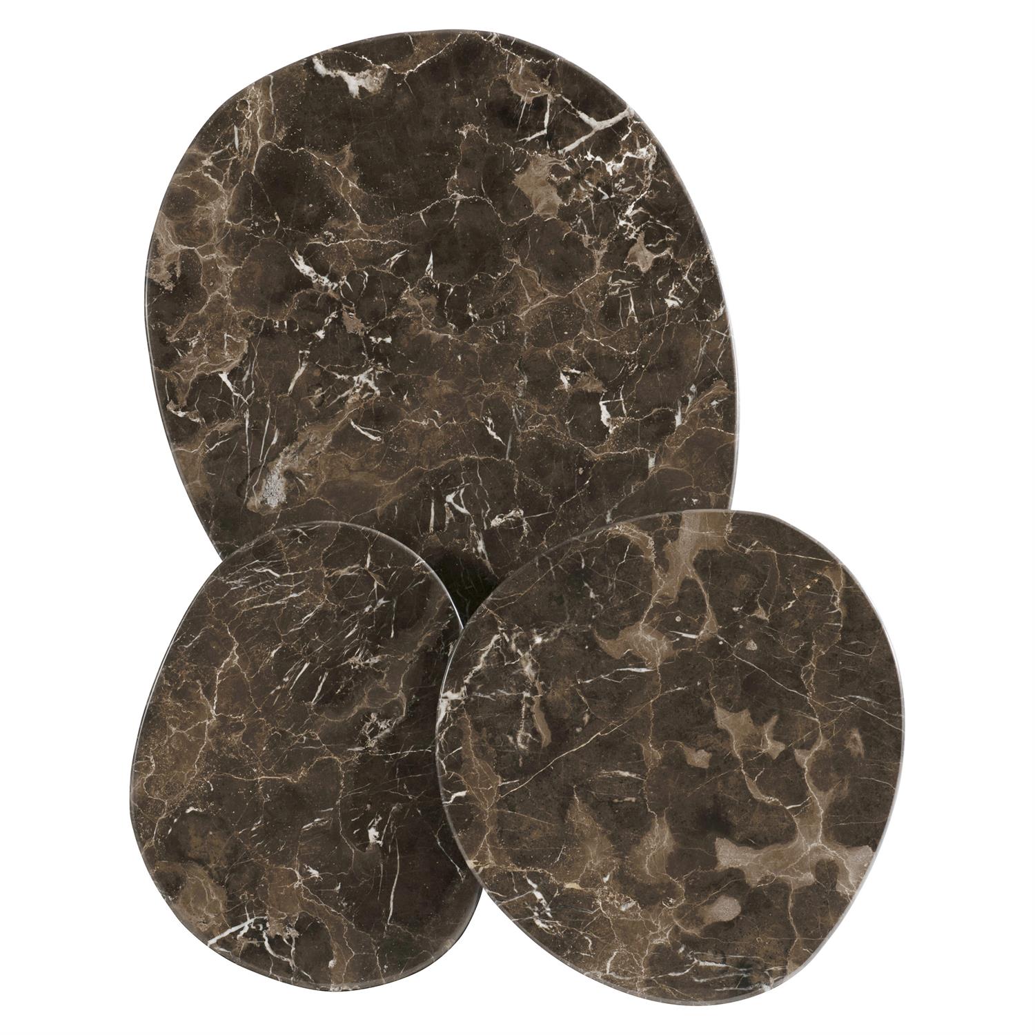 The Nez cocktail table takes modern organic design to new heights with three brown Emperador marble stone tops perfectly balanced on a cast aluminum base finished in Graphite. Varying heights and sizes make this unique table a visual delight.