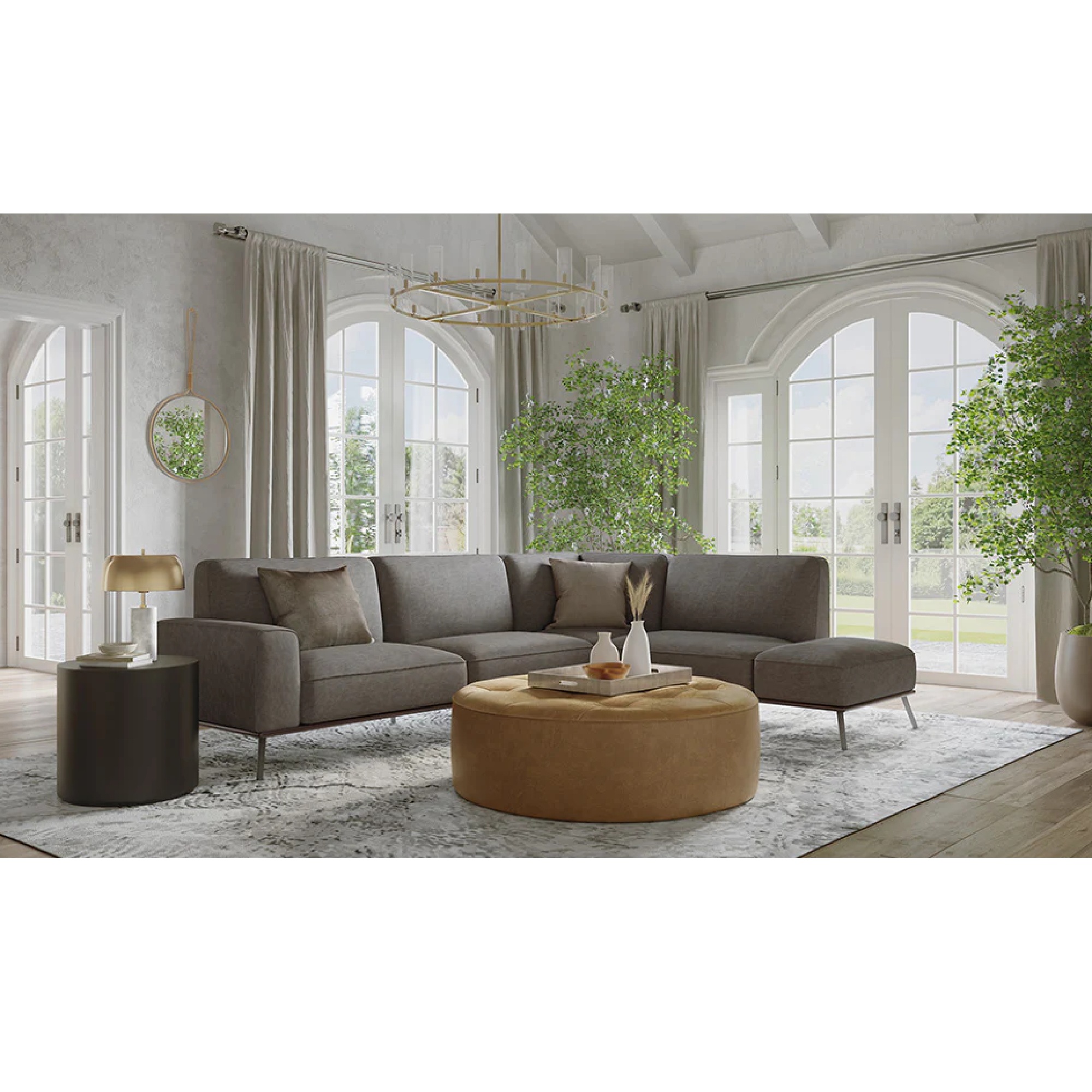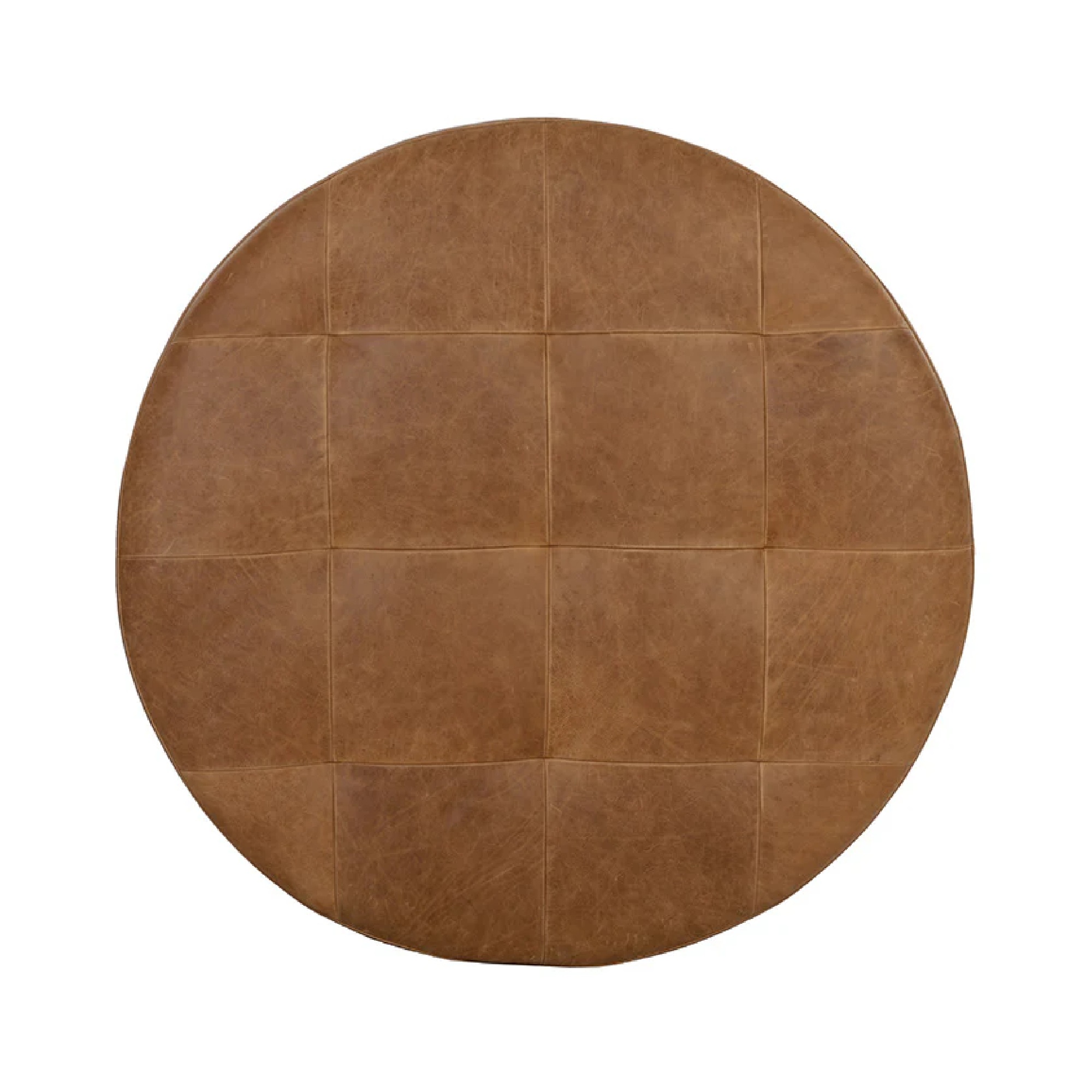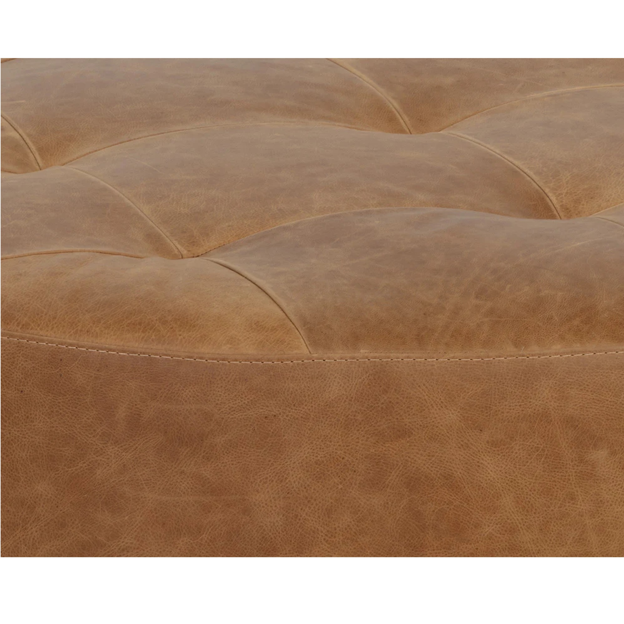 A classic, Italian-made round ottoman that features subtle tufting on the top for a gorgeous touch of style. Upholstered in our camel 100% Italian bovine leather for lasting quality. This rich, thoroughly dyed leather features a full grain finish with natural oils and waxes that accentuate the beautiful characteristics of the hide. Finished with a solid beech wood base.