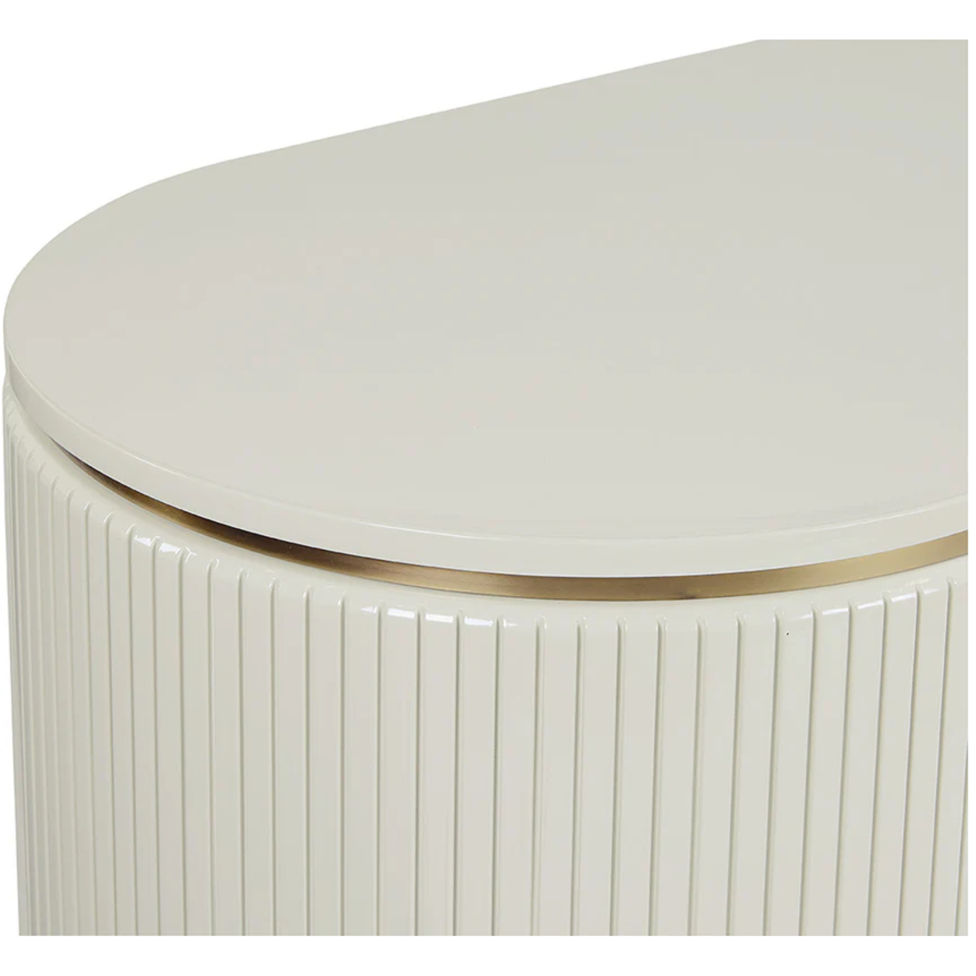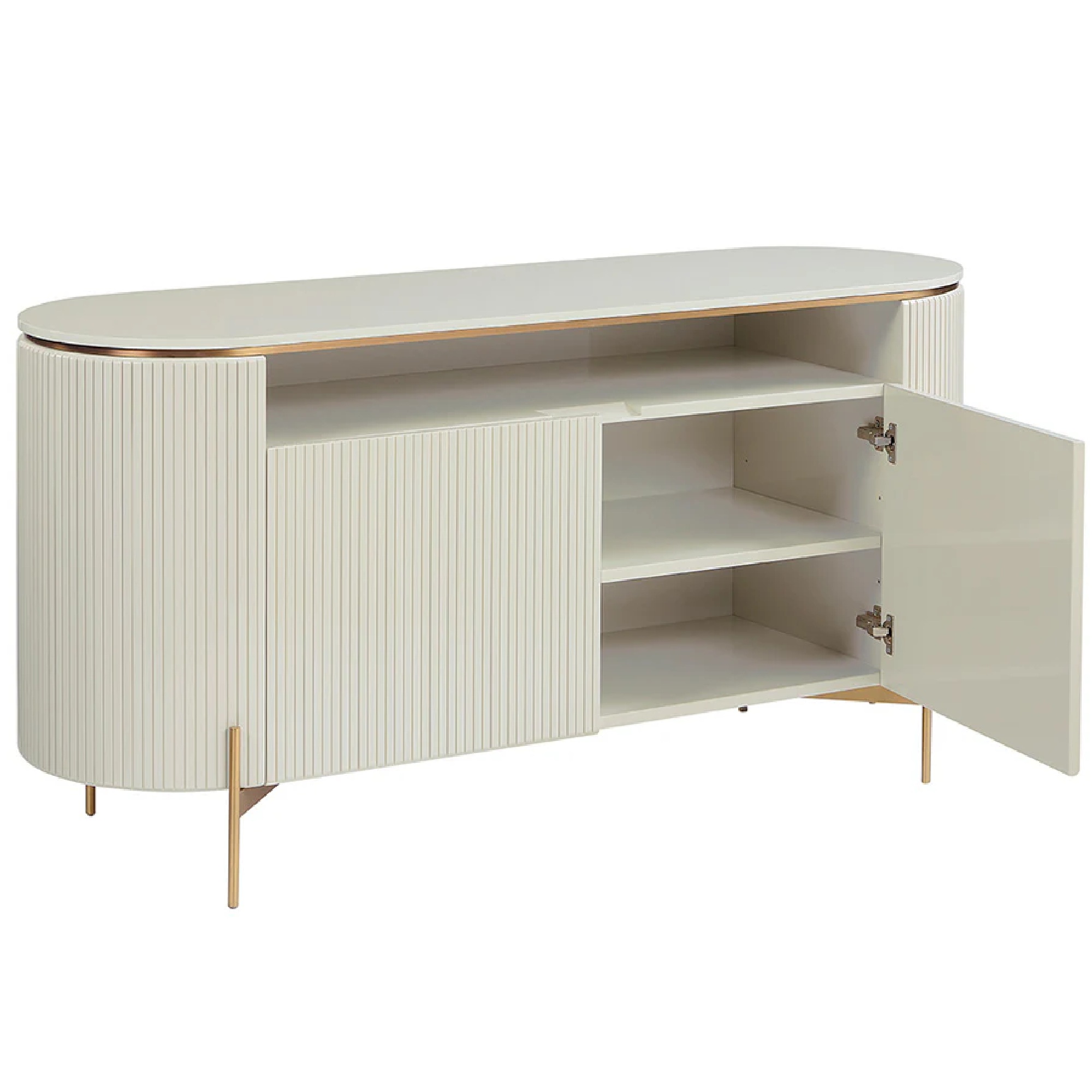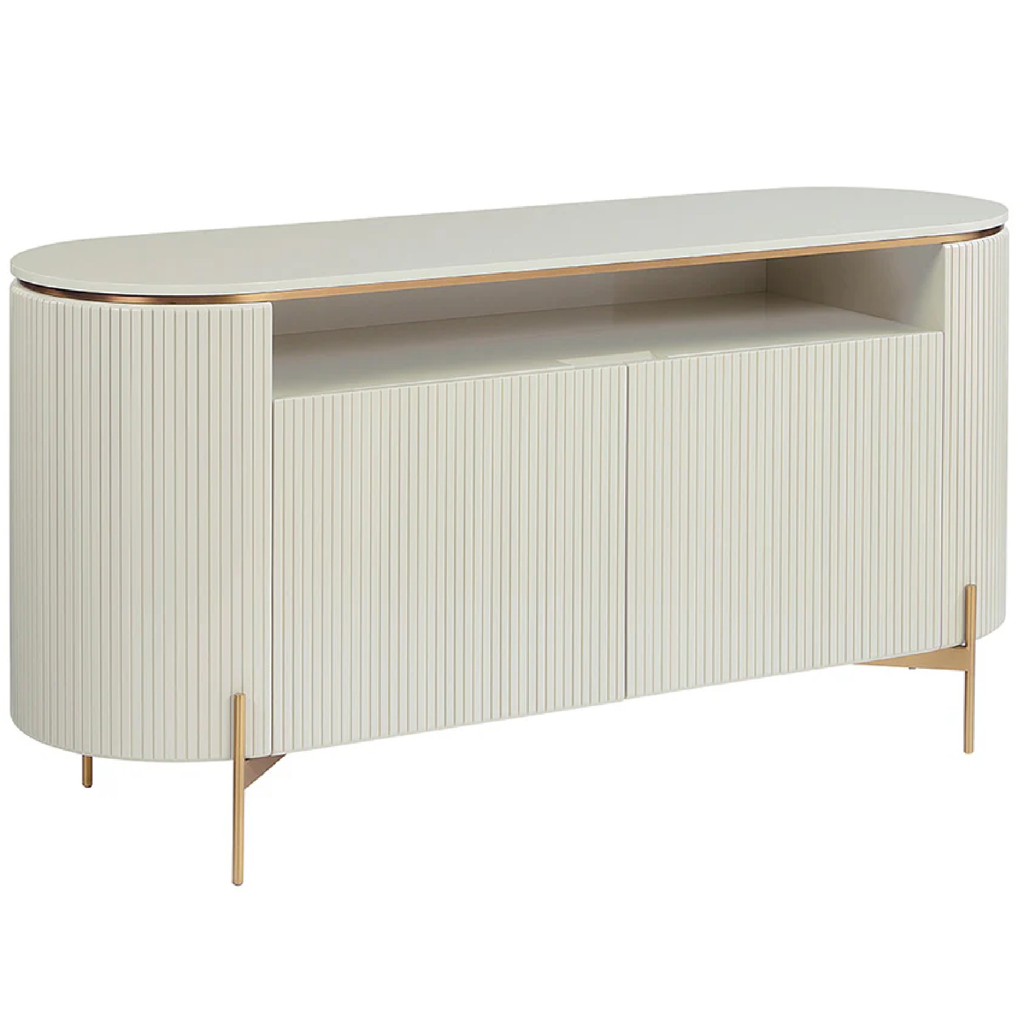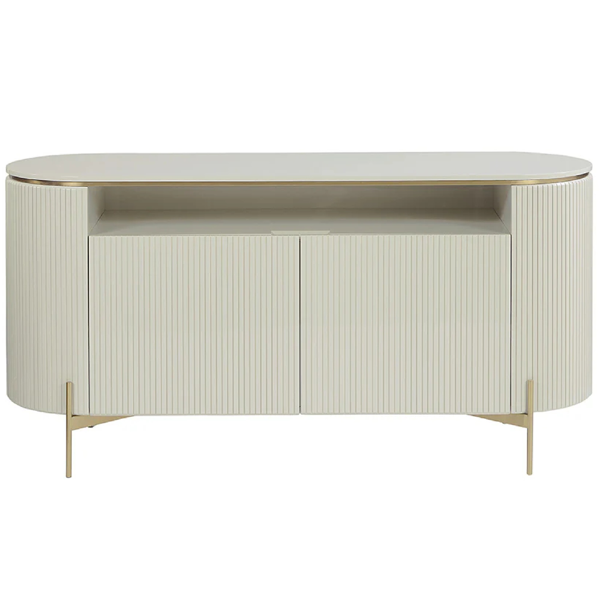 This luxurious sideboard will bring a sculptural spirit to modern living, lounge and dining spaces. The curved frame, finished in high gloss cream, is contrasted with intricate vertical reeding. Gold stainless steel legs and inlay create added definition.