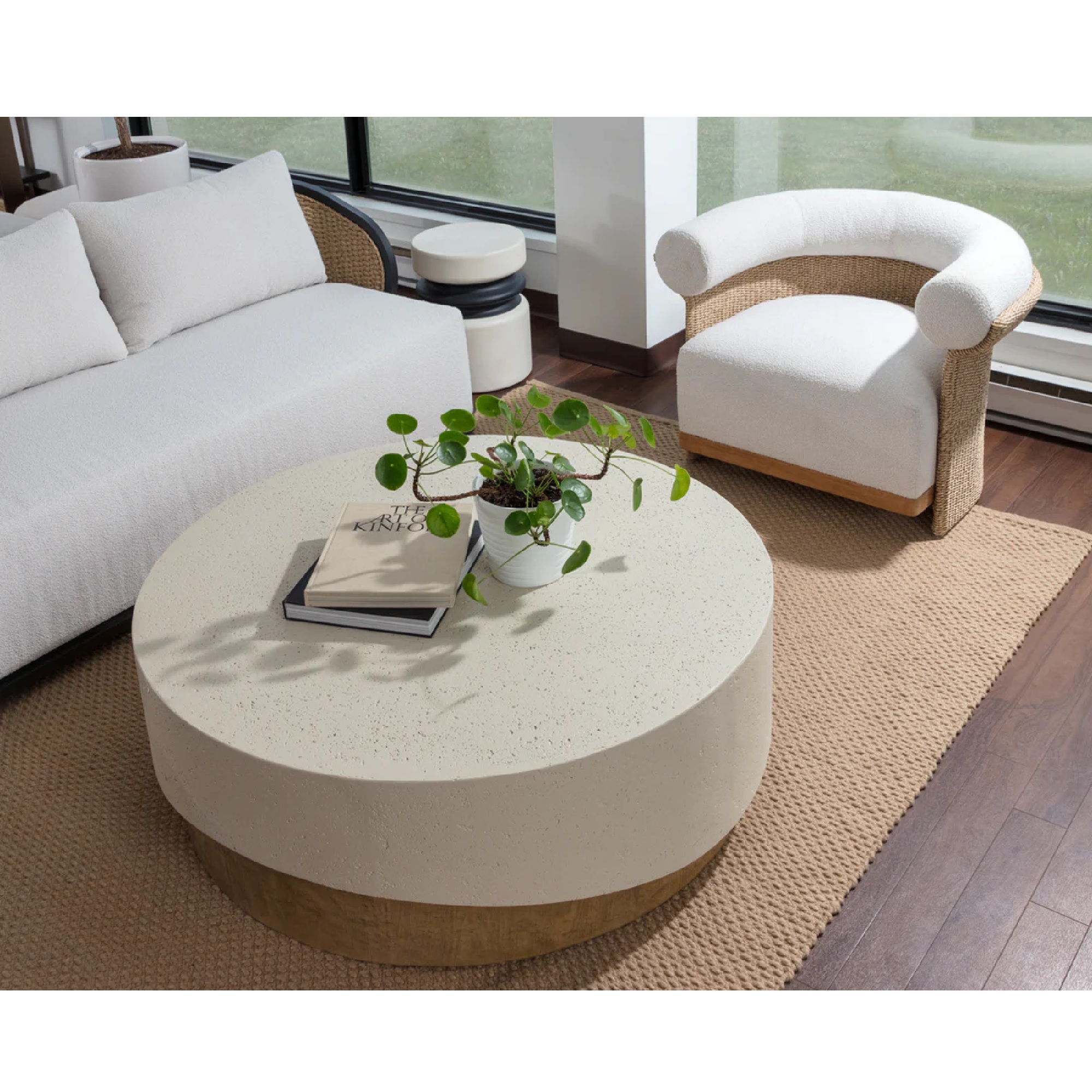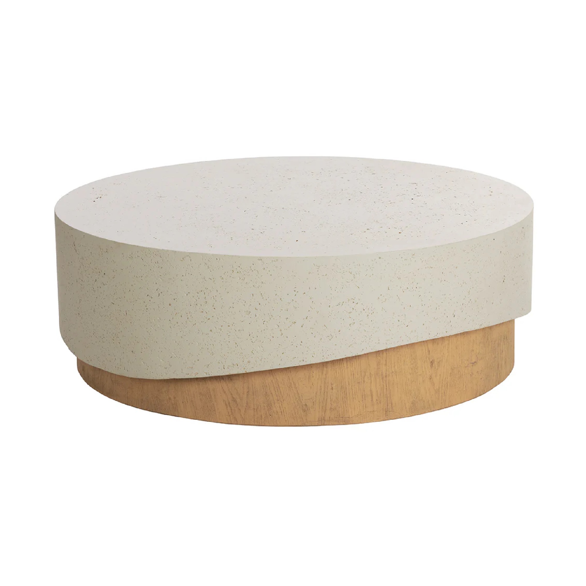 The Patras Cocktail Table’s stunning sculptural form makes it the ideal centrepiece for any space. Fully constructed from concrete, this table features a textured high-low top that embraces a round base cleverly designed to resemble rustic oak wood.