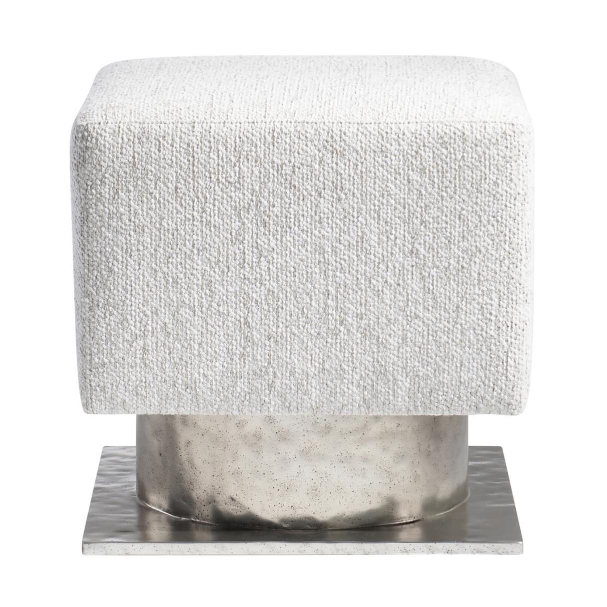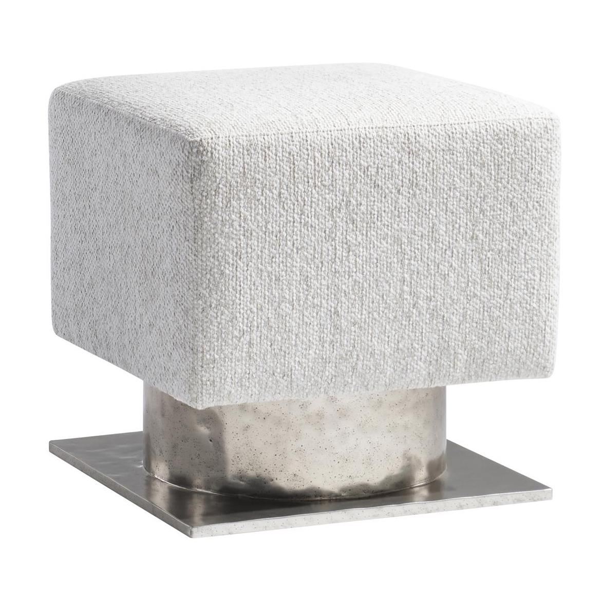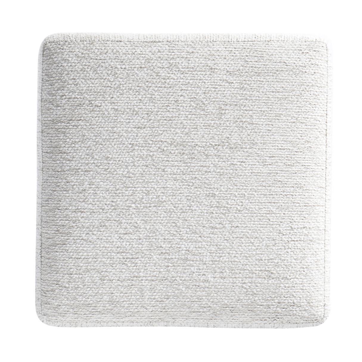 Square upholstered top and sides in fabric B104 atop a round, textured cast aluminum pedestal and square base in Bright Graphite finish