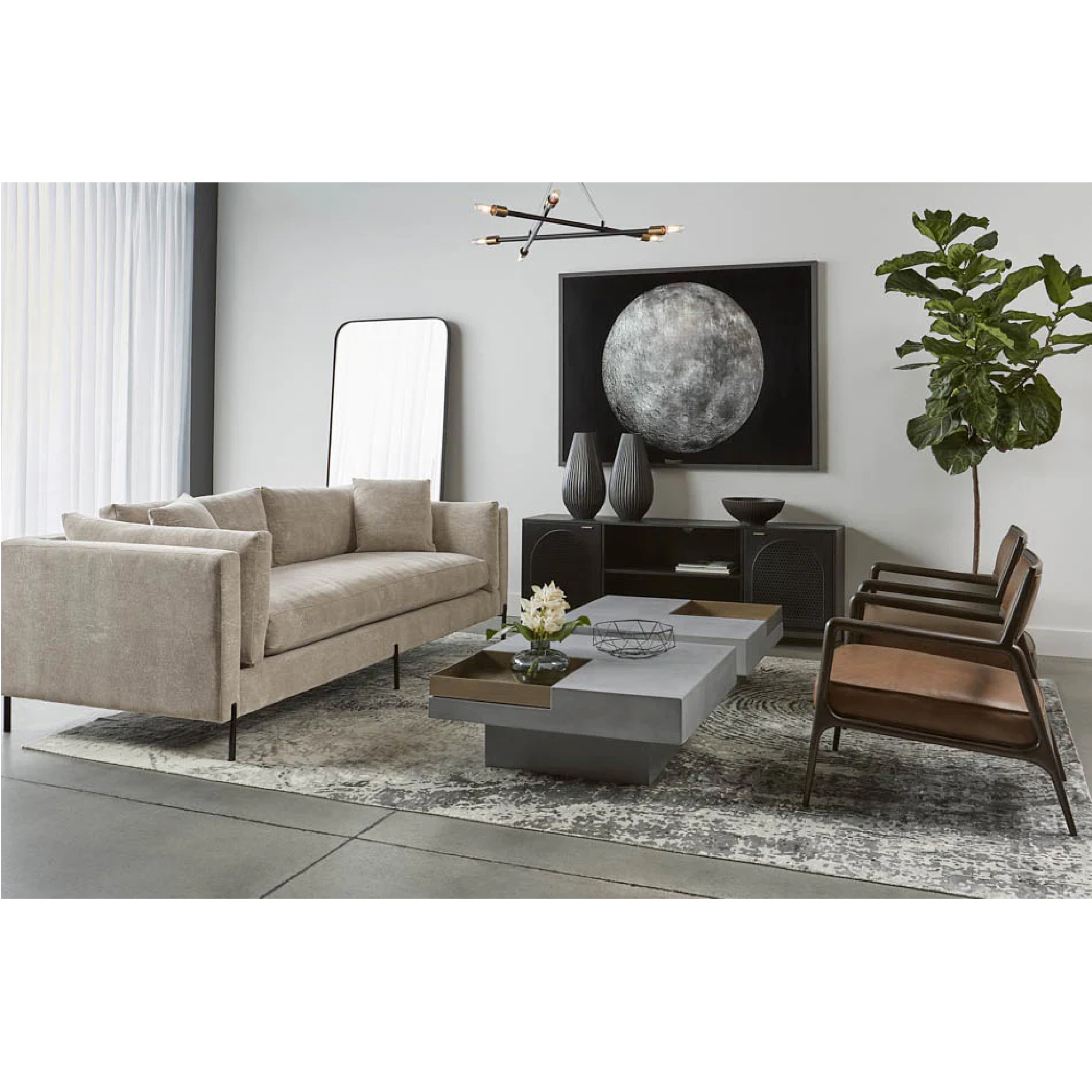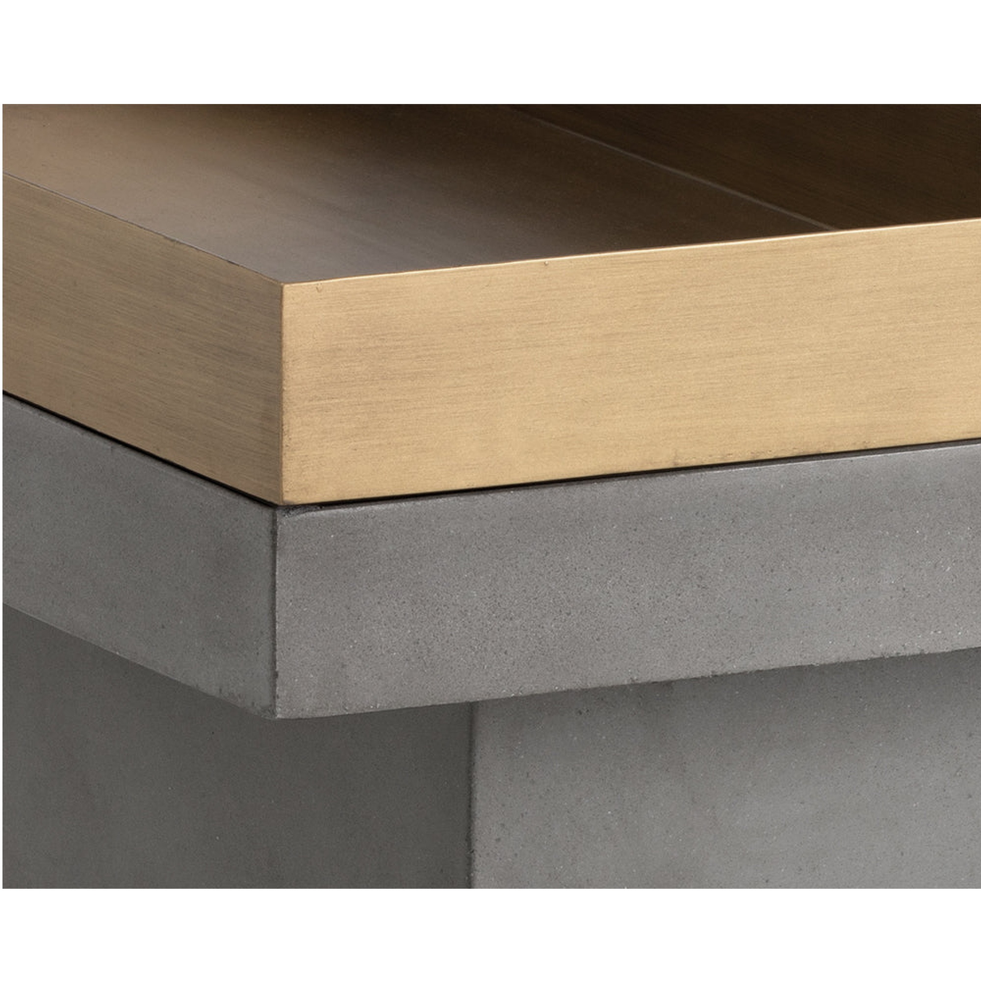 This rectangular shaped cocktail table combines a structured concrete top with a removable brushed antique brass tray. Crafted from a natural concrete mix, each piece will look different. Variations in colour, texture, imperfections, surface scratches and non-structural hairline cracks are considered inherent and valued qualities of the material.