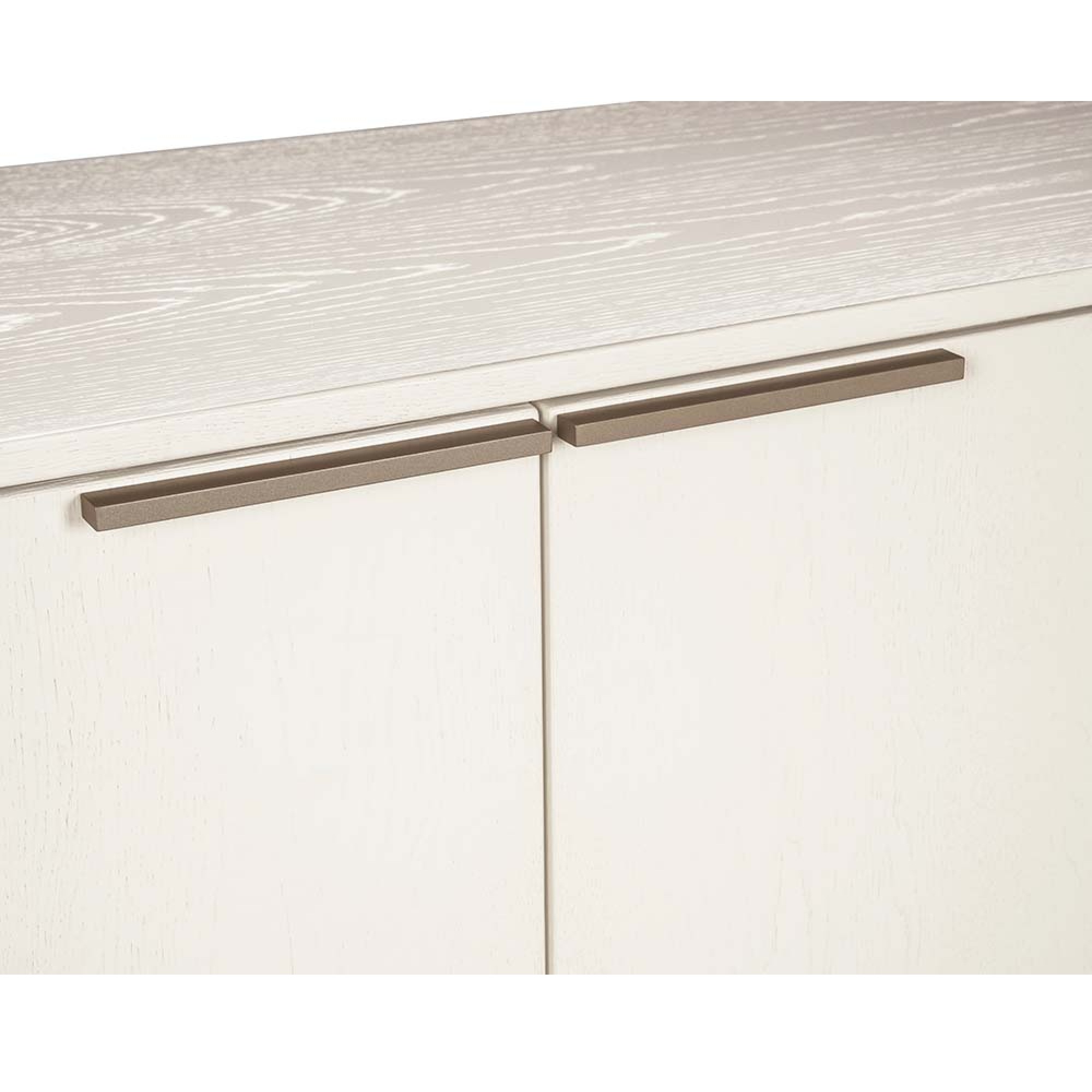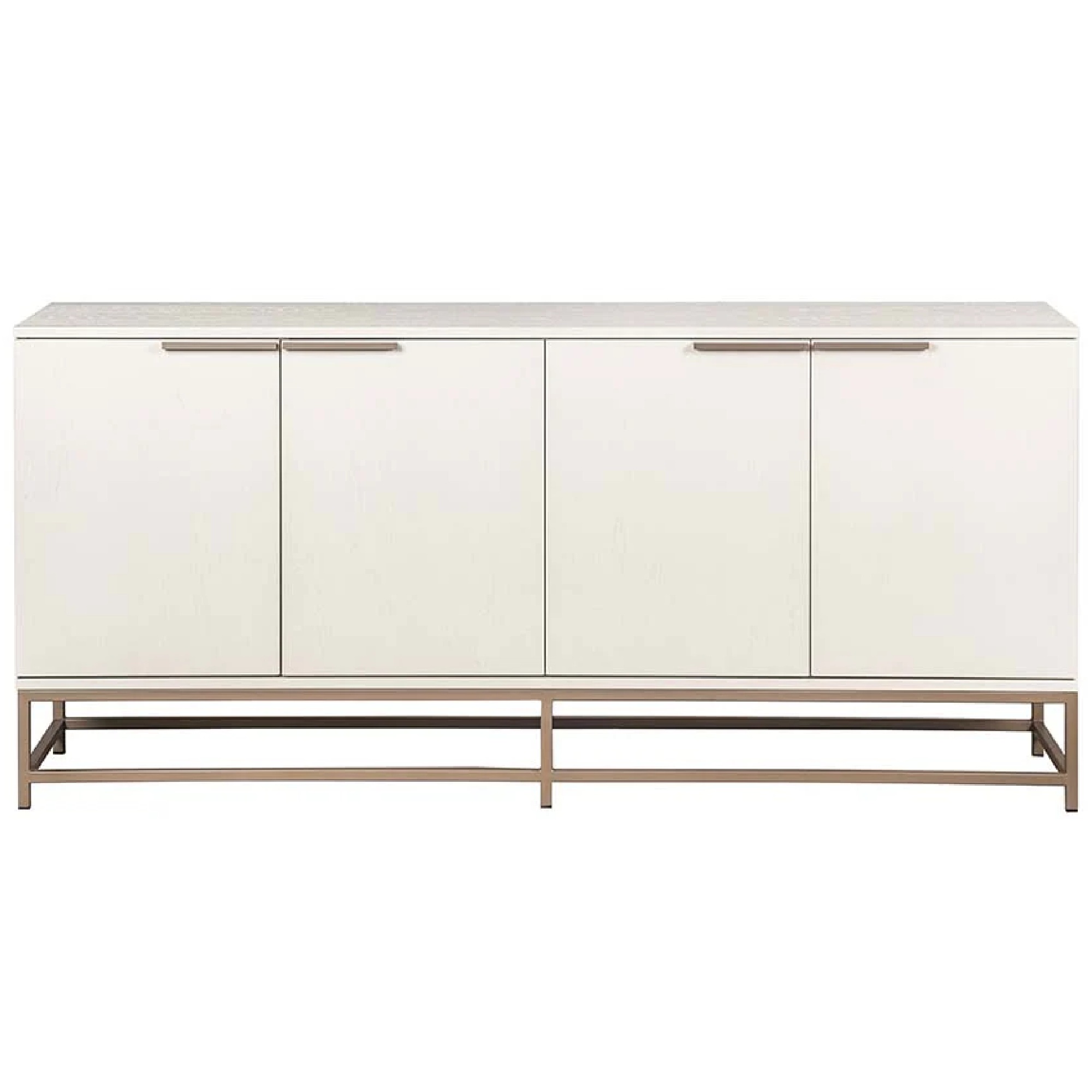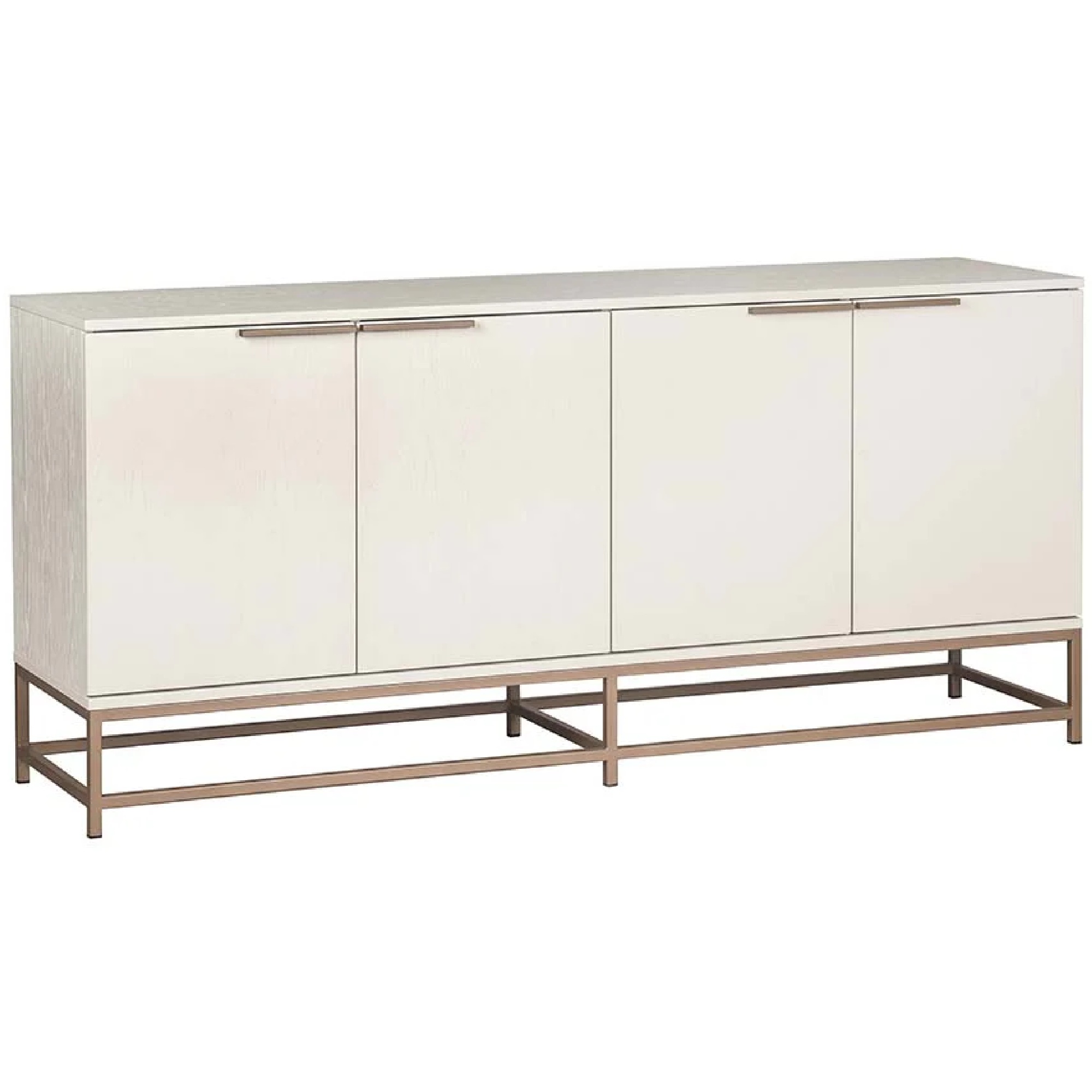 A modern sideboard designed to add a beautiful touch to the living, lounge, office and dining spaces. Crafted from cream grey oak veneer with four cabinets and shelves for added storage. Brushed champagne gold iron hardware completes the look.