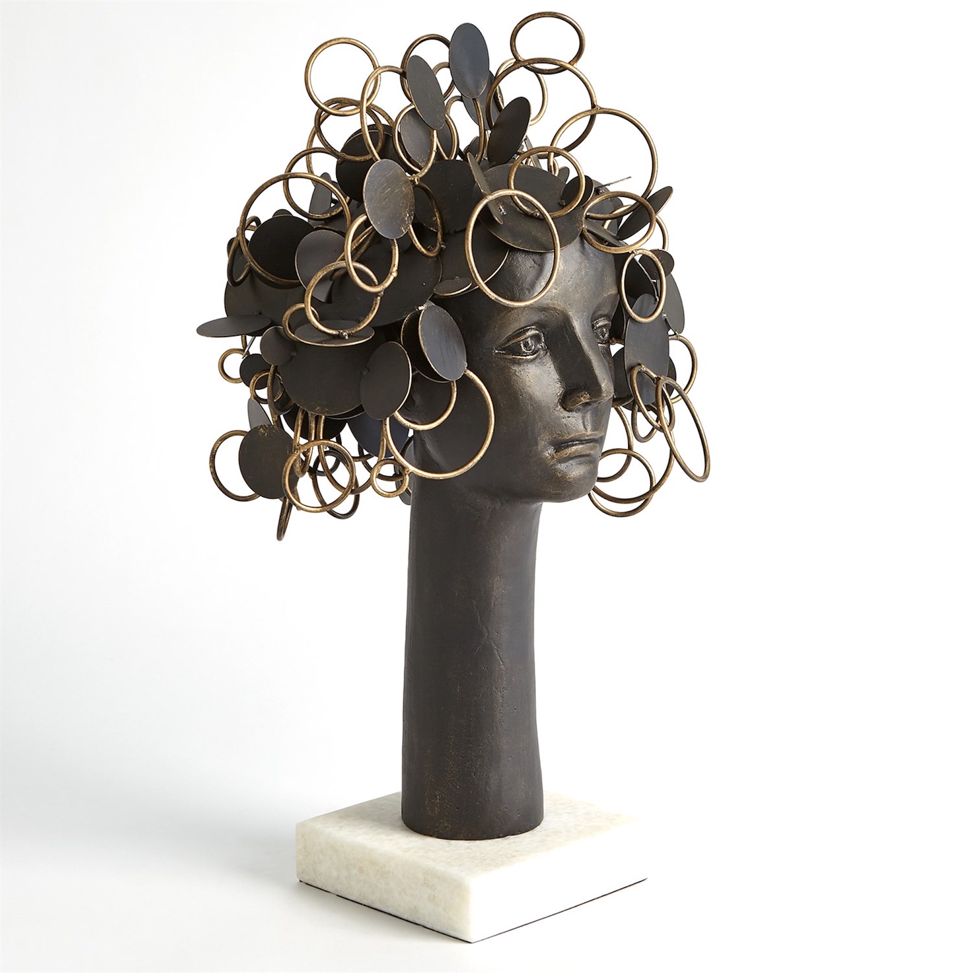 The Rings and Things for Brains sculpture is made of cast iron with a bronze and gold highlighted finish on a white marble base.