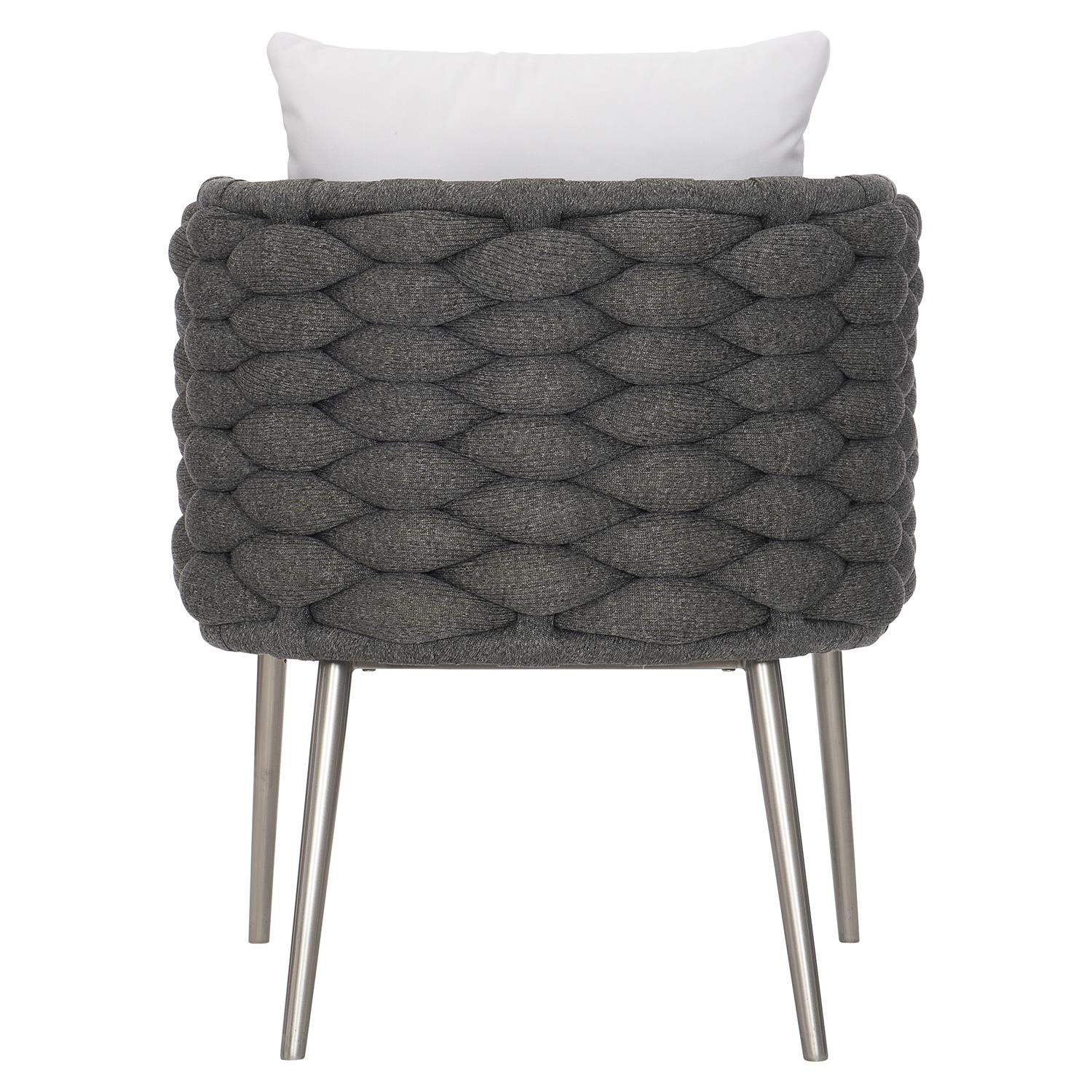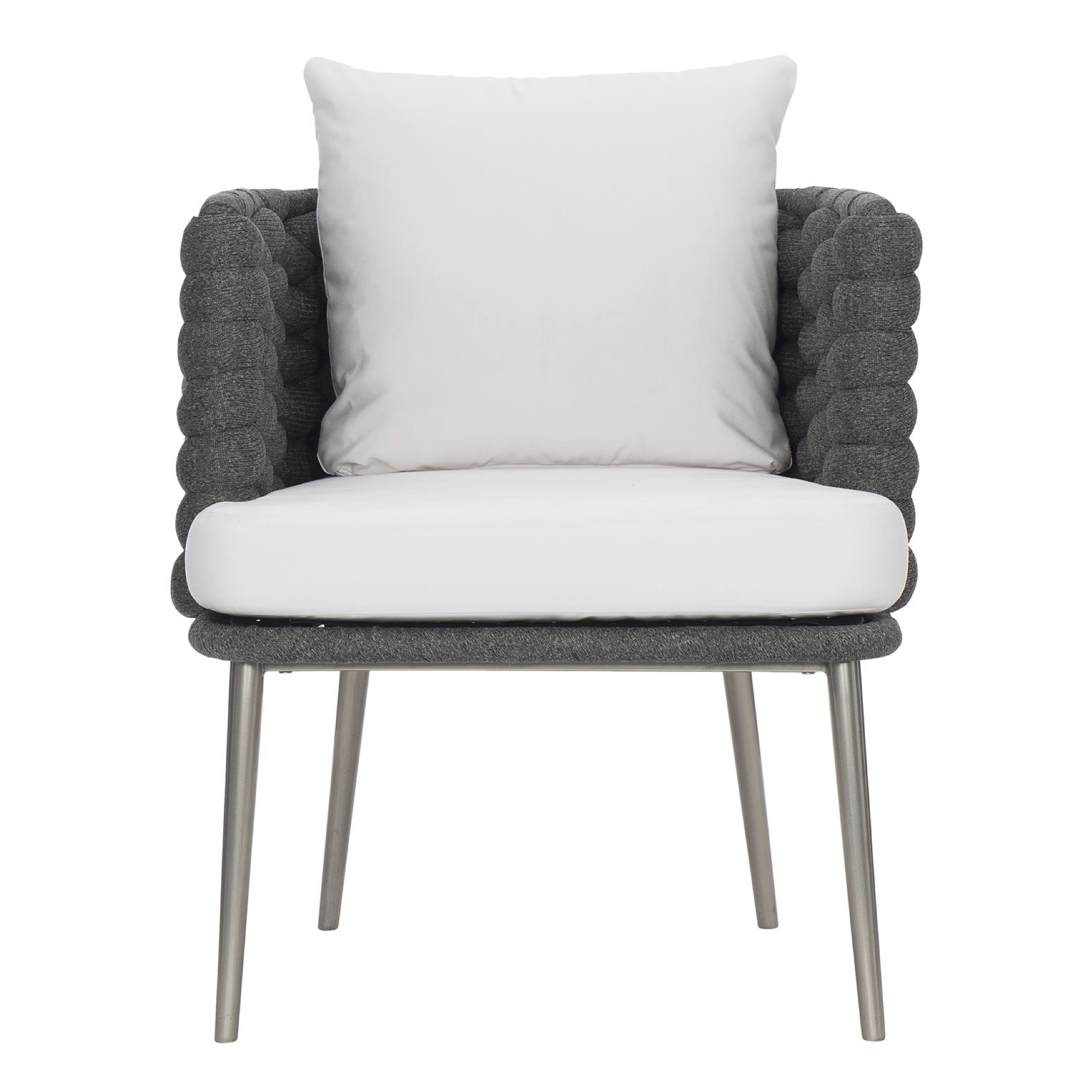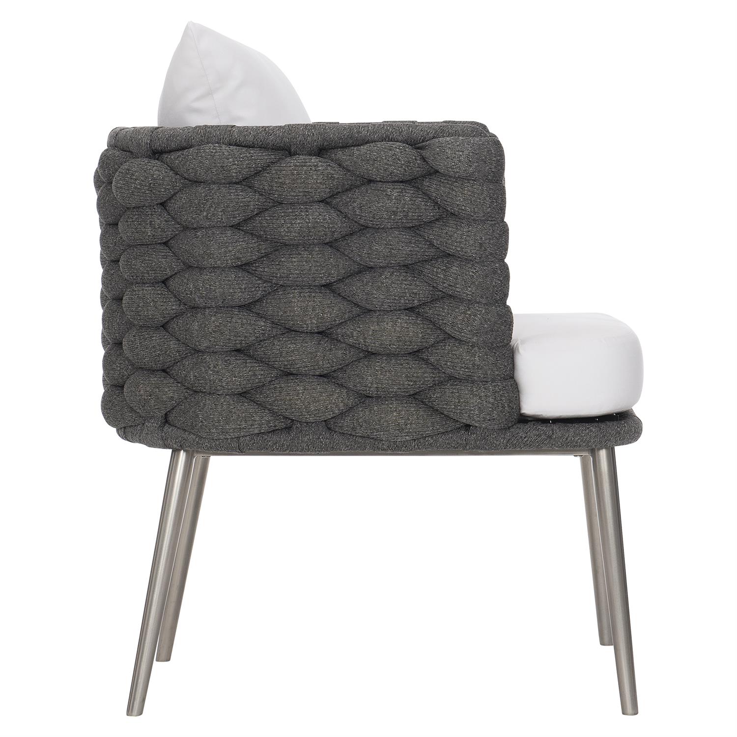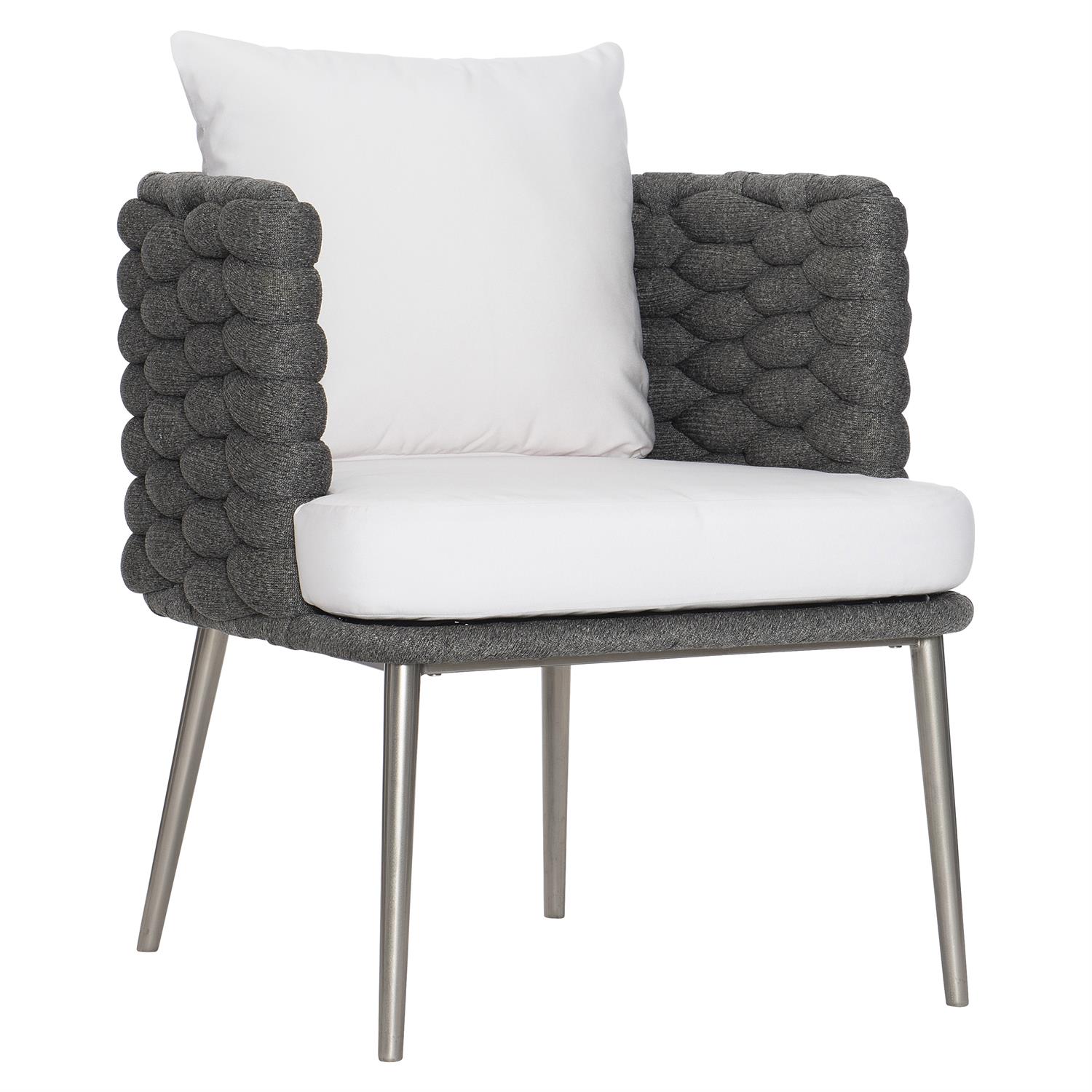 Featuring an all-weather soft-knit sock weave in Cadet Grey wrapped around an aluminum frame, the Santa Cruz arm chair offers luxurious comfort and modern appeal with an organic touch. The barrel-shaped seat rests on delicate but strong Silver Mist powder-coated stainless steel splayed and tapered legs. A comfortable cushion and back pillow are soft and inviting.