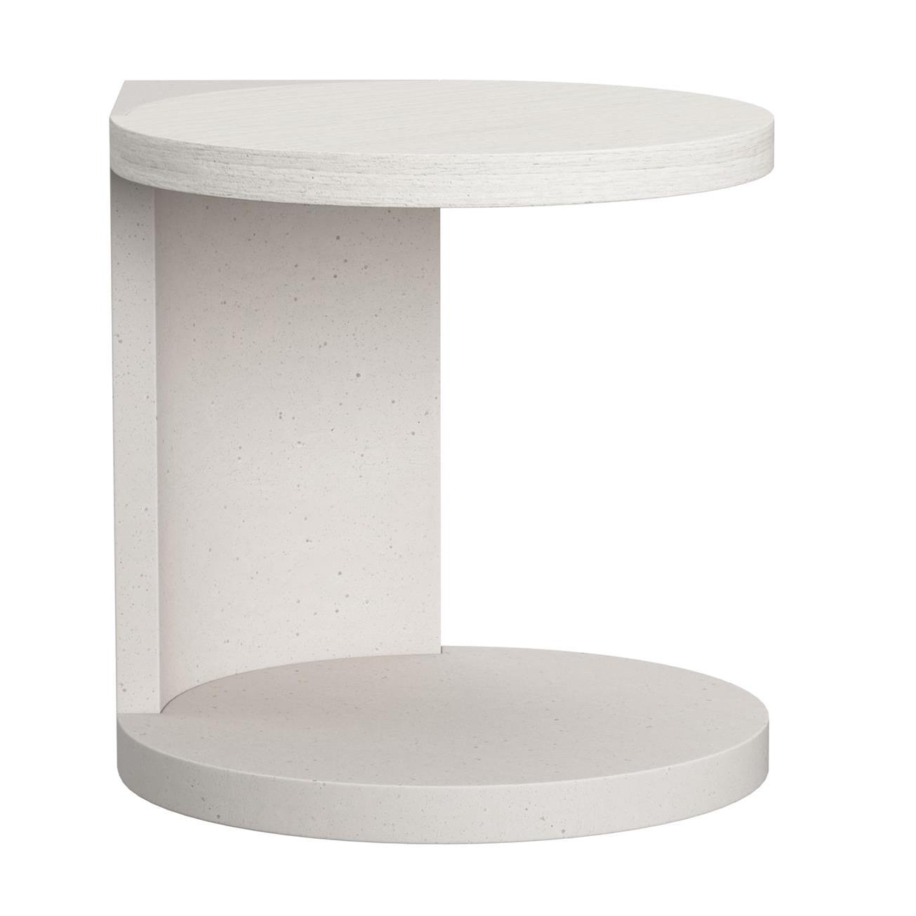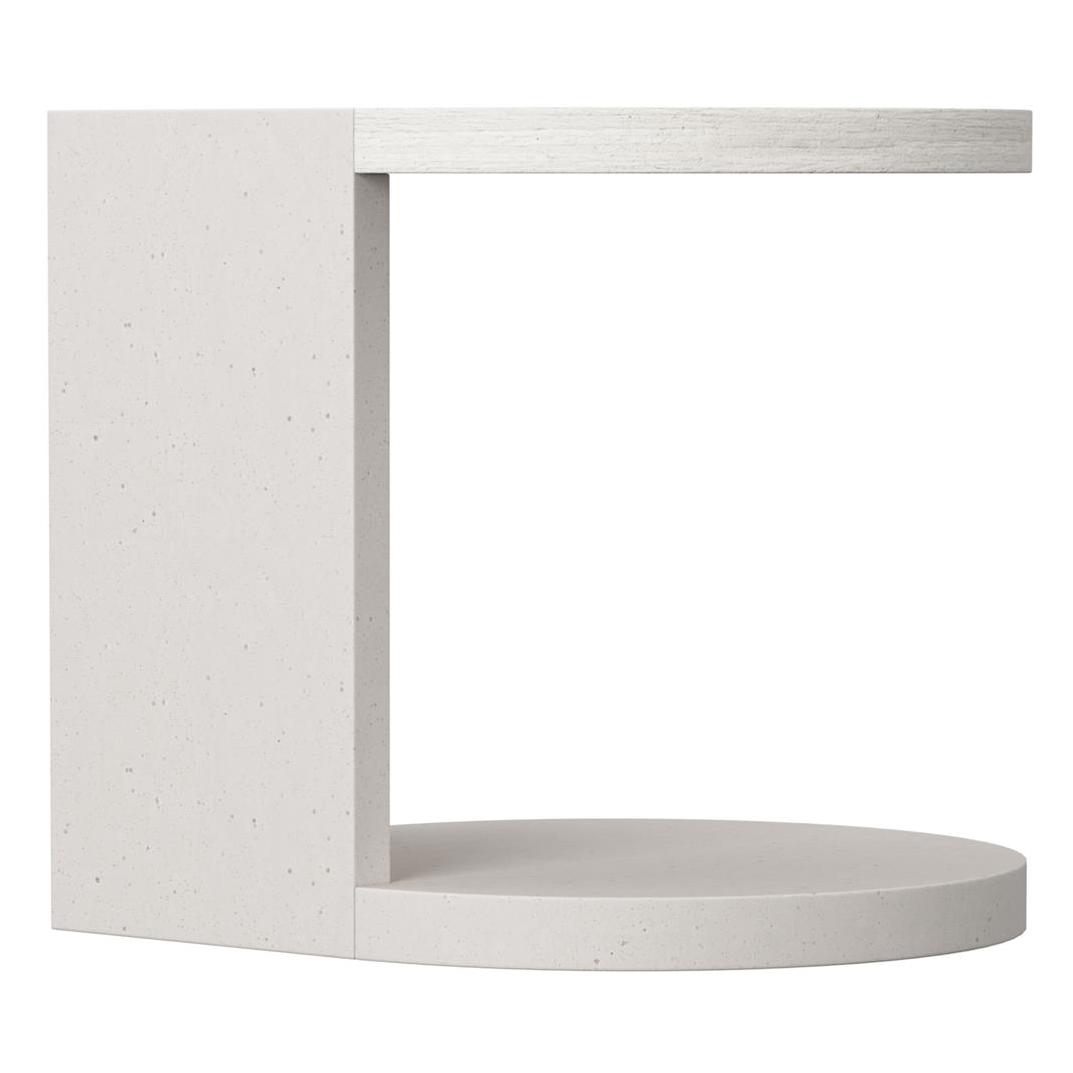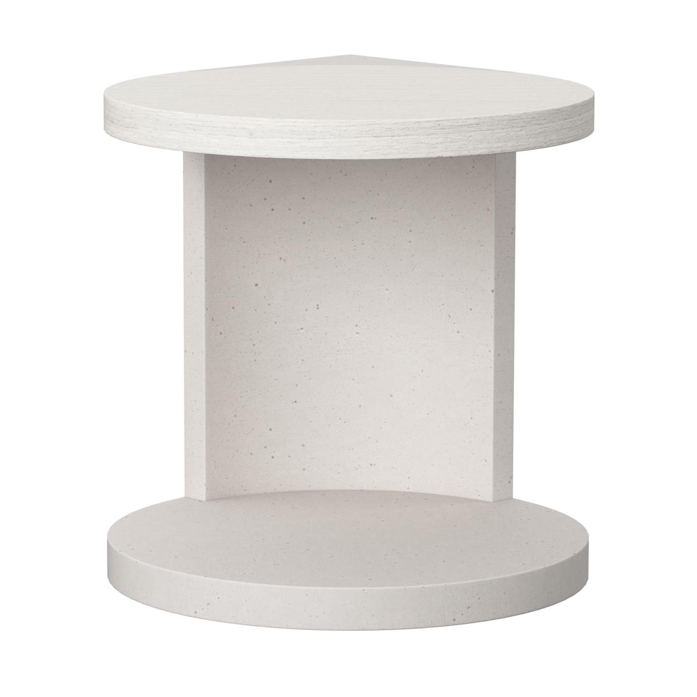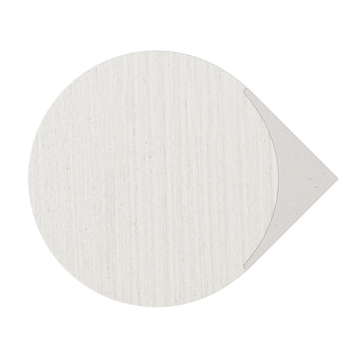 The inset round top of the Stratum side table creates a teardrop shape with the supporting panels that meet in a 90-degree angle. The panels are curved in the interior, following the sweep of the round base. Two complementary finishes in Mist and Fossil offer contrasting tones.