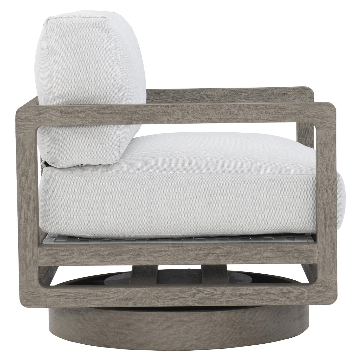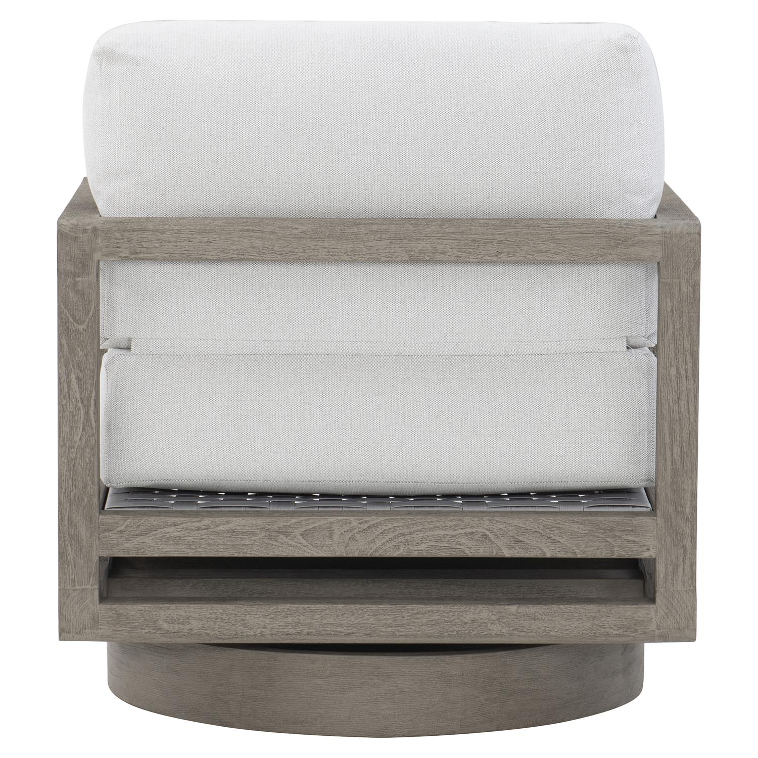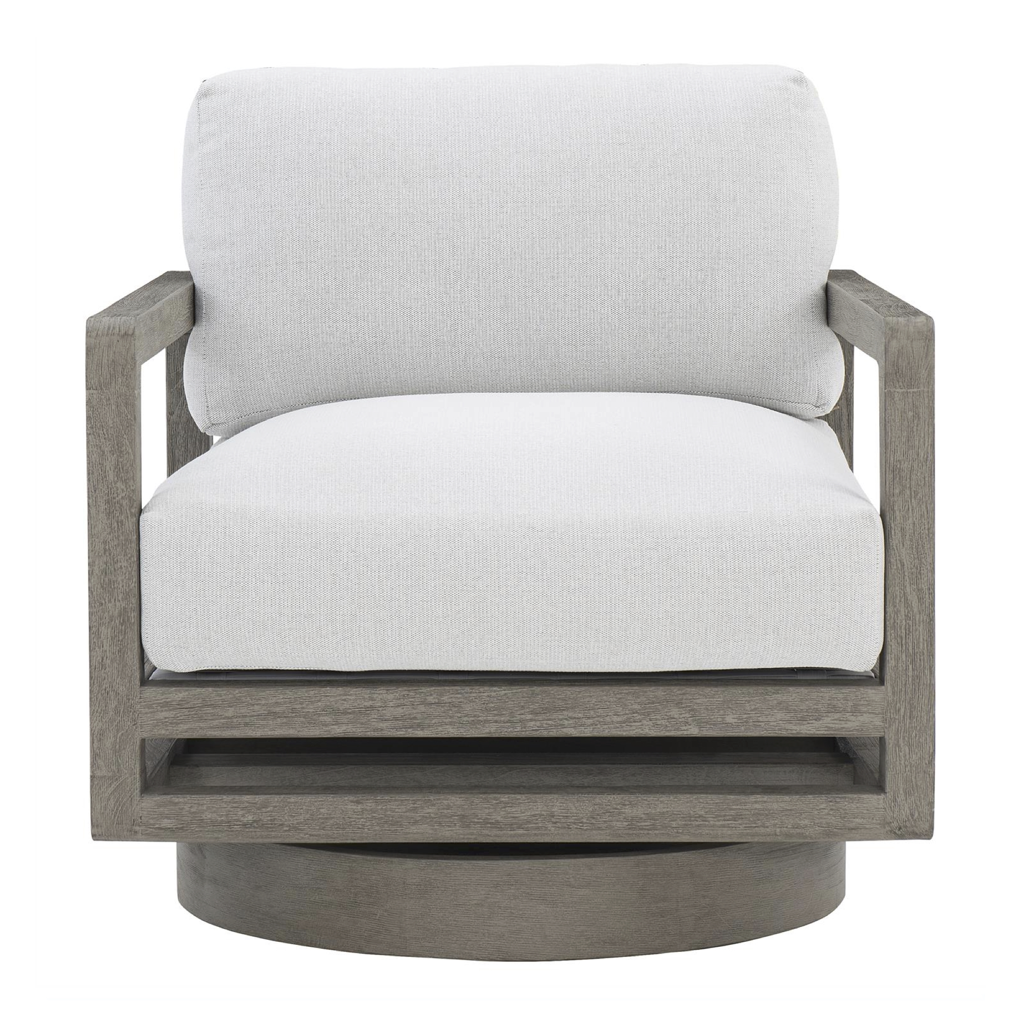 Simply designed and finely crafted, the Tanah swivel chair combines clean lines and geometric angles for a distinctly modern look. The open frame is crafted from weathered teak, a naturally durable and water-resistant material that grows more beautiful with age. Dressed in performance fabric, a sumptuous cushion and fiber back pillow provide unrivaled comfort. A thick, round swivel base draws attention to the mobility offered by this sophisticated chair.